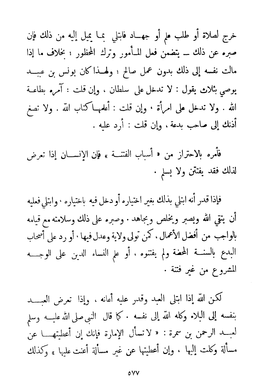 خَرَجَ لِصَلَاةِ أَوْ طَلَبِ عِلْمٍ أَوْ جِهَادٍ فَابْتُلِيَ بِمَا يَمِيلُ إلَيْهِ مِنْ ذَلِكَ فَإِنَّ صَبْرَهُ عَنْ ذَلِكَ - يَتَضَمَّنُ فِعْلَ الْمَأْمُورِ وَتَرْكَ الْمَحْظُورِ؛ بِخِلَافِ مَا إذَا مَالَتْ نَفْسُهُ إلَى ذَلِكَ بِدُونِ عَمَلٍ صَالِحٍ؛ وَلِهَذَا كَانَ يُونُسُ بْنُ عُبَيْدٍ يُوصِي بِثَلَاثِ يَقُولُ: لَا تَدْخُلْ عَلَى سُلْطَانٍ، وَإِنْ قُلْتَ: آمُرُهُ بِطَاعَةِ اللَّهِ. وَلَا تَدْخُلْ عَلَى امْرَأَةٍ؛ وَإِنْ قُلْتَ: أُعَلِّمُهَا كِتَابَ اللَّهِ. وَلَا تُصْغِ أُذُنَكَ إلَى صَاحِبِ بِدْعَةٍ وَإِنْ قُلْتَ: أَرُدُّ عَلَيْهِ. فَأَمْرُهُ بِالِاحْتِرَازِ مِنْ " أَسْبَابِ الْفِتْنَةِ " فَإِنَّ الْإِنْسَانَ إذَا تَعَرَّضَ لِذَلِكَ فَقَدْ يَفْتَتِنُ وَلَا يَسْلَمُ. فَإِذَا قُدِّرَ أَنَّهُ اُبْتُلِيَ بِذَلِكَ بِغَيْرِ اخْتِيَارِهِ أَوْ دَخَلَ فِيهِ بِاخْتِيَارِهِ وَابْتُلِيَ فَعَلَيْهِ أَنْ يَتَّقِيَ اللَّهَ، وَيَصْبِرَ وَيُخْلِصَ وَيُجَاهِدَ. وَصَبْرُهُ عَلَى ذَلِكَ وَسَلَامَتُهُ مَعَ قِيَامِهِ بِالْوَاجِبِ مِنْ أَفْضَلِ الْأَعْمَالِ كَمَنْ تَوَلَّى وِلَايَةً وَعَدَلَ فِيهَا أَوْ رَدَّ عَلَى أَصْحَابِ الْبِدَعِ بِالسُّنَّةِ الْمَحْضَةِ وَلَمْ يَفْتِنُوهُ، أَوْ عَلَّمَ النِّسَاءَ الدِّينَ عَلَى الْوَجْهِ الْمَشْرُوعِ مِنْ غَيْرِ فِتْنَةٍ. لَكِنَّ اللَّهَ إذَا ابْتَلَى الْعَبْدَ وَقَدَّرَ عَلَيْهِ أَعَانَهُ، وَإِذَا تَعَرَّضَ الْعَبْدُ بِنَفْسِهِ إلَى الْبَلَاءِ وَكَّلَهُ اللَّهُ إلَى نَفْسِهِ. كَمَا {قَالَ النَّبِيُّ صَلَّى اللَّهُ عَلَيْهِ وَسَلَّمَ لِعَبْدِ الرَّحْمَنِ بْنِ سَمُرَةَ: لَا تَسْأَلْ الْإِمَارَةَ فَإِنَّك إنْ أُعْطِيتهَا عَنْ مَسْأَلَةٍ وُكِلْتَ إلَيْهَا وَإِنْ أُعْطِيتهَا عَنْ غَيْرِ مَسْأَلَةٍ أُعِنْت عَلَيْهَا} وَكَذَلِكَ