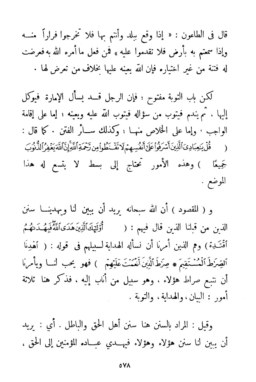 {قَالَ فِي الطَّاعُونِ: إذَا وَقَعَ بِبَلَدِ وَأَنْتُمْ بِهَا فَلَا تَخْرُجُوا فِرَارًا مِنْهُ وَإِذَا سَمِعْتُمْ بِهِ بِأَرْضِ فَلَا تَقْدَمُوا عَلَيْهِ} فَمَنْ فَعَلَ مَا أَمَرَهُ اللَّهُ بِهِ فَعَرَضَتْ لَهُ فِتْنَةٌ مِنْ غَيْرِ اخْتِيَارِهِ فَإِنَّ اللَّهَ يُعِينُهُ عَلَيْهَا بِخِلَافِ مَنْ تَعَرَّضَ لَهَا. لَكِنَّ بَابَ التَّوْبَةِ مَفْتُوحٌ؛ فَإِنَّ الرَّجُلَ قَدْ يَسْأَلُ الْإِمَارَةَ فَيُوكَلُ إلَيْهَا ثُمَّ يَنْدَمُ فَيَتُوبُ مِنْ سُؤَالِهِ فَيَتُوبُ اللَّهُ عَلَيْهِ وَيُعِينُهُ؛ إمَّا عَلَى إقَامَةِ الْوَاجِبِ وَإِمَّا عَلَى الْخَلَاصِ مِنْهَا؛ وَكَذَلِكَ سَائِرُ الْفِتَنِ. كَمَا قَالَ: {قُلْ يَا عِبَادِيَ الَّذِينَ أَسْرَفُوا عَلَى أَنْفُسِهِمْ لَا تَقْنَطُوا مِنْ رَحْمَةِ اللَّهِ إنَّ اللَّهَ يَغْفِرُ الذُّنُوبَ جَمِيعًا} وَهَذِهِ الْأُمُورُ تَحْتَاجُ إلَى بَسْطٍ لَا يَتَّسِعُ لَهُ هَذَا الْمَوْضِعُ. وَ (الْمَقْصُودُ) أَنَّ اللَّهَ سُبْحَانَهُ يُرِيدُ أَنْ يُبَيِّنَ لَنَا وَيَهْدِيَنَا سُنَنَ الَّذِينَ مِنْ قَبْلِنَا الَّذِينَ قَالَ فِيهِمْ: {أُولَئِكَ الَّذِينَ هَدَى اللَّهُ فَبِهُدَاهُمُ اقْتَدِهِ} وَهُمْ الَّذِينَ أَمَرَنَا أَنْ نَسْأَلَهُ الْهِدَايَةَ لِسَبِيلِهِمْ فِي قَوْلِهِ: {اهْدِنَا الصِّرَاطَ الْمُسْتَقِيمَ} {صِرَاطَ الَّذِينَ أَنْعَمْتَ عَلَيْهِمْ} فَهُوَ يُحِبُّ لَنَا وَيَأْمُرُنَا أَنْ نَتَّبِعَ صِرَاطَ هَؤُلَاءِ وَهُوَ سَبِيلُ مَنْ أَنَابَ إلَيْهِ فَذَكَرَ هُنَا ثَلَاثَةَ أُمُورٍ: الْبَيَانَ وَالْهِدَايَةَ وَالتَّوْبَةَ. وَقِيلَ: الْمُرَادُ بِالسُّنَنِ هُنَا سُنَنُ أَهْلِ الْحَقِّ وَالْبَاطِلِ. أَيْ: يُرِيدُ أَنْ يُبَيِّنَ لَنَا سُنَنَ هَؤُلَاءِ وَهَؤُلَاءِ فَيَهْدِي عِبَادَهُ الْمُؤْمِنِينَ إلَى الْحَقِّ