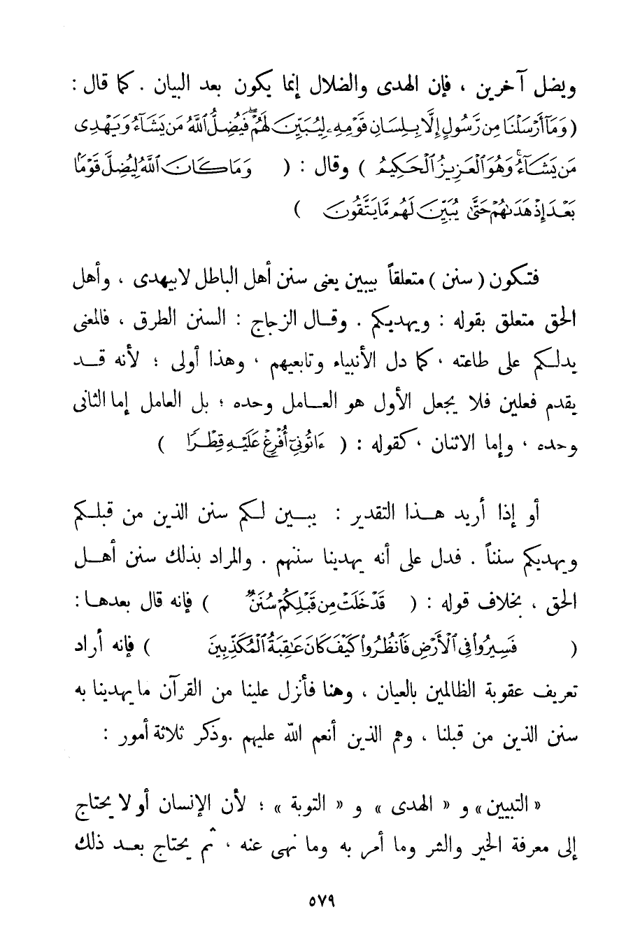 وَيُضِلُّ آخَرِينَ فَإِنَّ الْهُدَى وَالضَّلَالَ إنَّمَا يَكُونُ بَعْدَ الْبَيَانِ. كَمَا قَالَ: {وَمَا أَرْسَلْنَا مِنْ رَسُولٍ إلَّا بِلِسَانِ قَوْمِهِ لِيُبَيِّنَ لَهُمْ فَيُضِلُّ اللَّهُ مَنْ يَشَاءُ وَيَهْدِي مَنْ يَشَاءُ وَهُوَ الْعَزِيزُ الْحَكِيمُ} وَقَالَ: {وَمَا كَانَ اللَّهُ لِيُضِلَّ قَوْمًا بَعْدَ إذْ هَدَاهُمْ حَتَّى يُبَيِّنَ لَهُمْ مَا يَتَّقُونَ} فَتَكُونُ (سُنَنَ) مُتَعَلِّقًا بيبين يَعْنِي: سُنَنَ أَهْلِ الْبَاطِلِ لَا بيهدي، وَأَهْلُ الْحَقِّ مُتَعَلِّقٌ بِقَوْلِهِ: وَيَهْدِيَكُمْ. وَقَالَ الزَّجَّاجُ: السُّنَنُ الطُّرُقُ فَالْمَعْنَى يَدُلُّكُمْ عَلَى طَاعَتِهِ كَمَا دَلَّ الْأَنْبِيَاءَ وَتَابِعِيهِمْ وَهَذَا أَوْلَى؛ لِأَنَّهُ قَدْ يُقَدِّمُ فِعْلَيْنِ فَلَا يَجْعَلُ الْأَوَّلَ هُوَ الْعَامِلُ وَحْدَهُ؛ بَلْ الْعَامِلُ إمَّا الثَّانِي وَحْدَهُ وَإِمَّا الِاثْنَانِ كَقَوْلِهِ: {آتُونِي أُفْرِغْ عَلَيْهِ قِطْرًا} أَوْ إذَا أُرِيدَ هَذَا التَّقْدِيرُ: يُبَيِّنُ لَكُمْ سُنَنَ الَّذِينَ مِنْ قَبْلِكُمْ وَيَهْدِيكُمْ سُنَنًا. فَدَلَّ عَلَى أَنَّهُ يَهْدِينَا سُنَنَهُمْ. وَالْمُرَادُ بِذَلِكَ سُنَنُ أَهْلِ الْحَقِّ بِخِلَافِ قَوْلِهِ: {قَدْ خَلَتْ مِنْ قَبْلِكُمْ سُنَنٌ} فَإِنَّهُ قَالَ بَعْدَهَا: {فَسِيرُوا فِي الْأَرْضِ فَانْظُروا كَيْفَ كَانَ عَاقِبَةُ الْمُكَذِّبِينَ} فَإِنَّهُ أَرَادَ تَعْرِيفَ عُقُوبَةِ الظَّالِمِينَ بِالْعِيَانِ وَهُنَا فَأَنْزَلَ عَلَيْنَا مِنْ الْقُرْآنِ مَا يَهْدِينَا بِهِ سُنَنَ الَّذِينَ مِنْ قَبْلِنَا وَهُمْ الَّذِينَ أَنْعَمَ اللَّهُ عَلَيْهِمْ. وَذَكَرَ ثَلَاثَةَ أُمُورٍ: " التَّبْيِينَ " وَ " الْهُدَى " وَ " التَّوْبَةَ "؛ لِأَنَّ الْإِنْسَانَ أَوَّلًا يَحْتَاجُ إلَى مَعْرِفَةِ الْخَيْرِ وَالشَّرِّ وَمَا أُمِرَ بِهِ وَمَا نُهِيَ عَنْهُ ثُمَّ يَحْتَاجُ بَعْدَ ذَلِكَ
