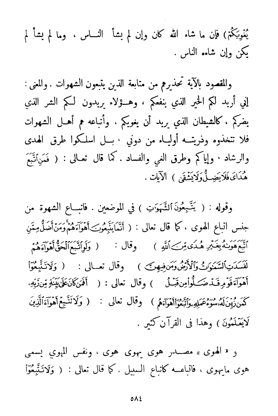 يُغْوِيَكُمْ} فَإِنَّ مَا شَاءَ اللَّهُ كَانَ وَإِنْ لَمْ يَشَأْ النَّاسُ وَمَا لَمْ يَشَأْ لَمْ يَكُنْ وَإِنْ شَاءَهُ النَّاسُ. وَالْمَقْصُودُ بِالْآيَةِ تَحْذِيرُهُمْ مِنْ مُتَابَعَةِ الَّذِينَ يَتَّبِعُونَ الشَّهَوَاتِ. وَالْمَعْنَى: إنِّي أُرِيدُ لَكُمْ الْخَيْرَ الَّذِي يَنْفَعُكُمْ وَهَؤُلَاءِ يُرِيدُونَ لَكُمْ الشَّرَّ الَّذِي يَضُرُّكُمْ كَالشَّيْطَانِ الَّذِي يُرِيدُ أَنْ يُغْوِيَكُمْ وَأَتْبَاعُهُ هُمْ أَهْلُ الشَّهَوَاتِ فَلَا تَتَّخِذُوهُ وَذُرِّيَّتَهُ أَوْلِيَاءَ مِنْ دُونِي بَلْ اُسْلُكُوا طُرُقَ الْهُدَى وَالرَّشَادِ وَإِيَّاكُمْ وَطُرُقَ الْغَيِّ وَالْفَسَادِ. كَمَا قَالَ تَعَالَى: {فَمَنِ اتَّبَعَ هُدَايَ فَلَا يَضِلُّ وَلَا يَشْقَى} الْآيَاتِ.