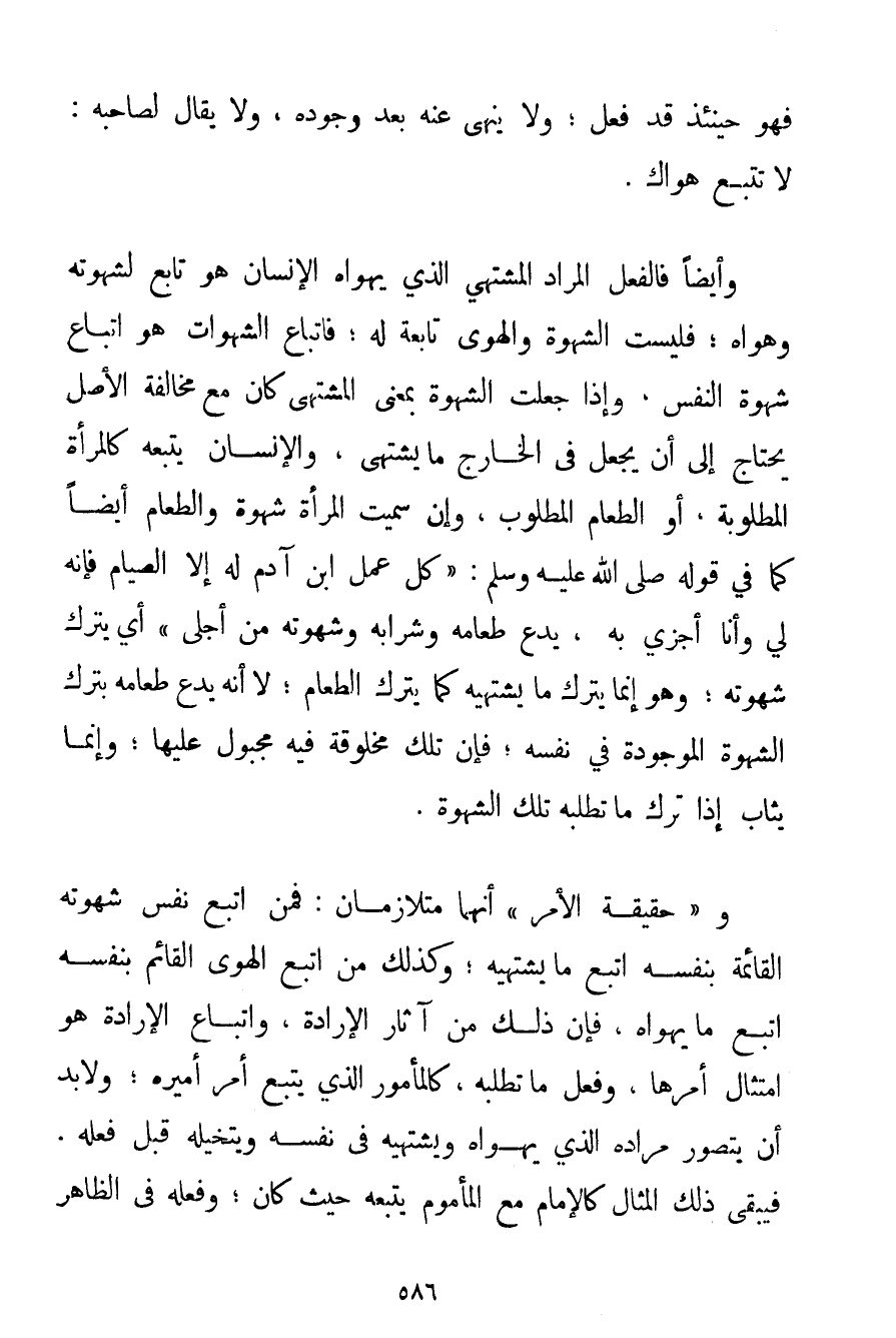 فَهُوَ حِينَئِذٍ قَدْ فَعَلَ؛ وَلَا يُنْهَى عَنْهُ بَعْدَ وُجُودِهِ وَلَا يُقَالُ لِصَاحِبِهِ: لَا تَتَّبِعْ هَوَاك. وَأَيْضًا فَالْفِعْلُ الْمُرَادُ الْمُشْتَهَى الَّذِي يَهْوَاهُ الْإِنْسَانُ هُوَ تَابِعٌ لِشَهْوَتِهِ وَهَوَاهُ؛ فَلَيْسَتْ الشَّهْوَةُ وَالْهَوَى تَابِعَةً لَهُ؛ فَاتِّبَاعُ الشَّهَوَاتِ هُوَ اتِّبَاعُ شَهْوَةِ النَّفْسِ وَإِذَا جَعَلْت الشَّهْوَةَ بِمَعْنَى الْمُشْتَهَى كَانَ مَعَ مُخَالَفَةِ الْأَصْلِ يَحْتَاجُ إلَى أَنْ يَجْعَلَ فِي الْخَارِجِ مَا يُشْتَهَى وَالْإِنْسَانُ يَتْبَعُهُ كَالْمَرْأَةِ الْمَطْلُوبَةِ أَوْ الطَّعَامِ الْمَطْلُوبِ وَإِنْ سُمِّيَتْ الْمَرْأَةُ شَهْوَةً وَالطَّعَامُ أَيْضًا كَمَا فِي قَوْلِهِ صَلَّى اللَّهُ عَلَيْهِ وَسَلَّمَ {كُلُّ عَمَلِ ابْنِ آدَمَ لَهُ إلَّا الصِّيَامَ فَإِنَّهُ لِي وَأَنَا أَجْزِي بِهِ يَدَعُ طَعَامَهُ وَشَرَابَهُ وَشَهْوَتَهُ مِنْ أَجْلِي} أَيْ يَتْرُكُ شَهْوَتَهُ؛ وَهُوَ إنَّمَا يَتْرُكُ مَا يَشْتَهِيهِ كَمَا يَتْرُكُ الطَّعَامَ؛ لَا أَنَّهُ يَدَعُ طَعَامَهُ بِتَرْكِ الشَّهْوَةِ الْمَوْجُودَةِ فِي نَفْسِهِ؛ فَإِنَّ تِلْكَ مَخْلُوقَةٌ فِيهِ مَجْبُولٌ عَلَيْهَا؛ وَإِنَّمَا يُثَابُ إذَا تَرَكَ مَا تَطْلُبُهُ تِلْكَ الشَّهْوَةُ. وَ " حَقِيقَةُ الْأَمْرِ " إنَّهُمَا مُتَلَازِمَانِ: فَمَنْ اتَّبَعَ نَفْسَ شَهْوَتِهِ الْقَائِمَةِ بِنَفْسِهِ اتَّبَعَ مَا يَشْتَهِيهِ؛ وَكَذَلِكَ مَنْ اتَّبَعَ الْهَوَى الْقَائِمَ بِنَفْسِهِ اتَّبَعَ مَا يَهْوَاهُ فَإِنَّ ذَلِكَ مِنْ آثَارِ الْإِرَادَةِ وَاتِّبَاعُ الْإِرَادَةِ هُوَ امْتِثَالُ أَمْرِهَا وَفِعْلُ مَا تَطْلُبُهُ كَالْمَأْمُورِ الَّذِي يَتْبَعُ أَمْرَ أَمِيرِهِ؛ وَلَا بُدَّ أَنْ يَتَصَوَّرَ مُرَادَهُ الَّذِي يَهْوَاهُ وَيَشْتَهِيهِ فِي نَفْسِهِ وَيَتَخَيَّلُهُ قَبْلَ فِعْلِهِ. فَيَبْقَى ذَلِكَ الْمِثَالُ كَالْإِمَامِ مَعَ الْمَأْمُومِ يَتْبَعُهُ حَيْثُ كَانَ؛ وَفِعْلُهُ فِي الظَّاهِرِ