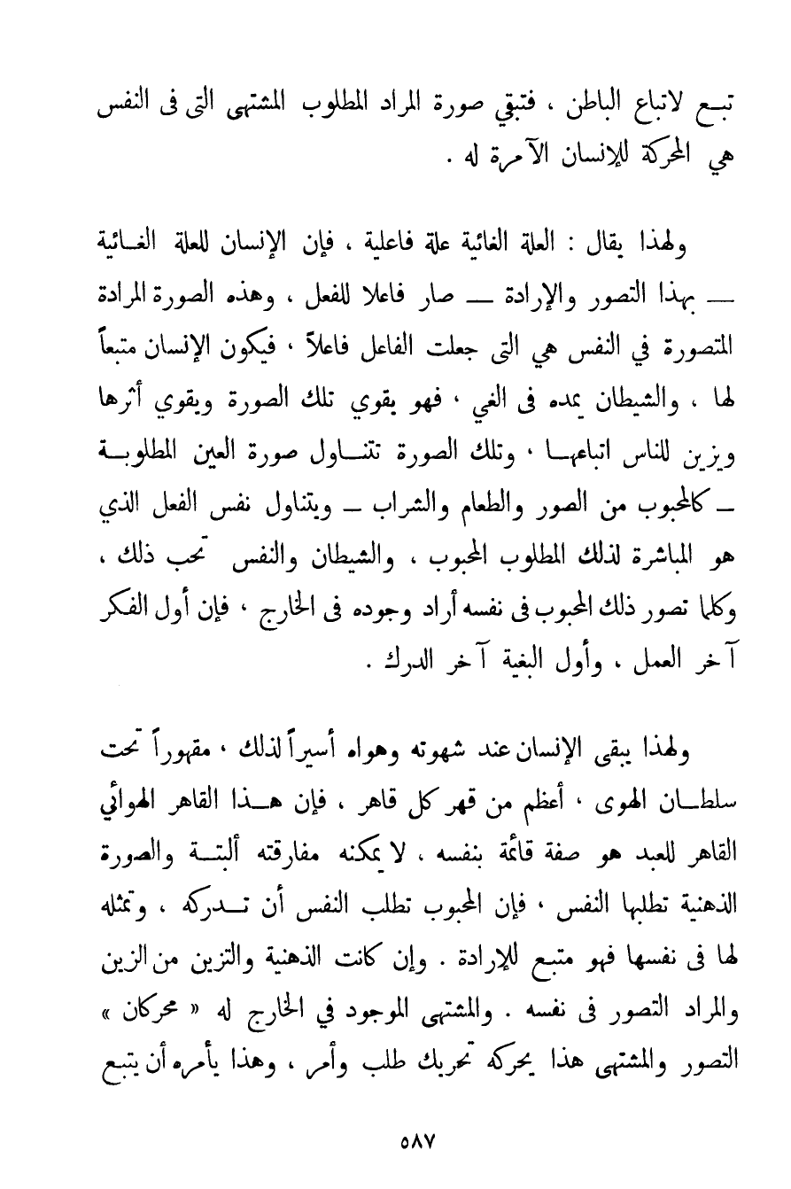 تَبَعٌ لِاتِّبَاعِ الْبَاطِنِ فَتَبْقَى صُورَةُ الْمُرَادِ الْمَطْلُوبِ الْمُشْتَهَى الَّتِي فِي النَّفْسِ هِيَ الْمُحَرِّكَةُ لِلْإِنْسَانِ الْآمِرَةُ لَهُ. وَلِهَذَا يُقَالُ: الْعِلَّةُ الغائية عِلَّةٌ فَاعِلِيَّةٌ فَإِنَّ الْإِنْسَانَ لِلْعِلَّةِ الغائية - بِهَذَا التَّصَوُّرِ وَالْإِرَادَةِ - صَارَ فَاعِلًا لِلْفِعْلِ وَهَذِهِ الصُّورَةُ الْمُرَادَةُ الْمُتَصَوَّرَةُ فِي النَّفْسِ هِيَ الَّتِي جَعَلَتْ الْفَاعِلَ فَاعِلًا فَيَكُونُ الْإِنْسَانُ مُتَّبِعًا لَهَا وَالشَّيْطَانُ يَمُدُّهُ فِي الْغَيِّ فَهُوَ يُقَوِّي تِلْكَ الصُّورَةَ وَيُقَوِّي أَثَرَهَا وَيُزَيِّنُ لِلنَّاسِ اتِّبَاعَهَا وَتِلْكَ الصُّورَةُ تَتَنَاوَلُ صُورَةَ الْعَيْنِ الْمَطْلُوبَةِ - كَالْمَحْبُوبِ مِنْ الصُّوَرِ وَالطَّعَامِ وَالشَّرَابِ - وَيَتَنَاوَلُ نَفْسَ الْفِعْلِ الَّذِي هُوَ الْمُبَاشَرَةُ لِذَلِكَ الْمَطْلُوبِ الْمَحْبُوبِ، وَالشَّيْطَانُ وَالنَّفْسُ تُحِبُّ ذَلِكَ وَكُلَّمَا تَصَوَّرَ ذَلِكَ الْمَحْبُوبَ فِي نَفْسِهِ أَرَادَ وُجُودَهُ فِي الْخَارِجِ فَإِنَّ أَوَّلَ الْفِكْرِ آخِرُ الْعَمَلِ وَأَوَّلَ الْبُغْيَةِ آخِرُ الدَّرْكِ. وَلِهَذَا يَبْقَى الْإِنْسَانُ عِنْدَ شَهْوَتِهِ وَهَوَاهُ أَسِيرًا لِذَلِكَ مَقْهُورًا تَحْتَ سُلْطَانِ الْهَوَى أَعْظَمَ مِنْ قَهْرِ كُلِّ قَاهِرٍ فَإِنَّ هَذَا الْقَاهِرَ الْهَوَائِيَّ الْقَاهِرَ لِلْعَبْدِ هُوَ صِفَةٌ قَائِمَةٌ بِنَفْسِهِ لَا يُمْكِنُهُ مُفَارَقَتُهُ أَلْبَتَّةَ وَالصُّورَةُ الذِّهْنِيَّةُ تَطْلُبُهَا النَّفْسُ فَإِنَّ الْمَحْبُوبَ تَطْلُبُ النَّفْسُ أَنْ تُدْرِكَهُ وَتُمَثِّلَهُ لَهَا فِي نَفْسِهَا فَهُوَ مُتَّبِعٌ لِلْإِرَادَةِ. وَإِنْ كَانَتْ الذِّهْنِيَّةُ وَالتَّزَيُّنُ مِنْ الزَّيْنِ وَالْمُرَادُ التَّصَوُّرُ فِي نَفْسِهِ. وَالْمُشْتَهَى الْمَوْجُودُ فِي الْخَارِجِ لَهُ " مُحَرِّكَانِ " التَّصَوُّرُ وَالْمُشْتَهَى، هَذَا يُحَرِّكُهُ تَحْرِيكَ طَلَبٍ وَأَمْرٍ، وَهَذَا يَأْمُرُهُ أَنْ يَتَّبِعَ