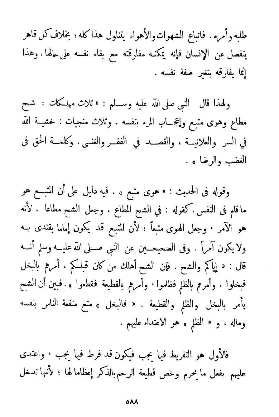طَلَبَهُ وَأَمْرَهُ، فَاتِّبَاعُ الشَّهَوَاتِ وَالْأَهْوَاءِ يَتَنَاوَلُ هَذَا كُلَّهُ؛ بِخِلَافِ كُلِّ قَاهِرٍ يَنْفَصِلُ عَنْ الْإِنْسَانِ فَإِنَّهُ يُمْكِنُهُ مُفَارَقَتُهُ مَعَ بَقَاءِ نَفْسِهِ عَلَى حَالِهَا: وَهَذَا إنَّمَا يُفَارِقُهُ بِتَغَيُّرِ صِفَةِ نَفْسِهِ. وَلِهَذَا قَالَ النَّبِيُّ صَلَّى اللَّهُ عَلَيْهِ وَسَلَّمَ {ثَلَاثٌ مُهْلِكَاتٌ: شُحٌّ مُطَاعٌ، وَهَوًى مُتَّبَعٌ وَإِعْجَابُ الْمَرْءِ بِنَفْسِهِ. وَثَلَاثٌ مُنْجِيَاتٌ: خَشْيَةُ اللَّهِ فِي السِّرِّ وَالْعَلَانِيَةِ، وَالْقَصْدُ فِي الْفَقْرِ وَالْغِنَى وَكَلِمَةُ الْحَقِّ فِي الْغَضَبِ وَالرِّضَا} وَقَوْلُهُ فِي الْحَدِيثِ: " هَوَى مُتَّبَعٌ ". فِيهِ دَلِيلٌ عَلَى أَنَّ الْمُتَّبَعَ هُوَ مَا قَامَ فِي النَّفْسِ. كَقَوْلِهِ: فِي الشُّحِّ الْمُطَاعِ وَجَعَلَ الشُّحَّ مُطَاعًا لِأَنَّهُ هُوَ الْآمِرُ وَجَعَلَ الْهَوَى مُتَّبَعًا؛ لِأَنَّ الْمُتَّبَعَ قَدْ يَكُونُ إمَامًا يُقْتَدَى بِهِ وَلَا يَكُونُ آمِرًا. وَفِي الصَّحِيحَيْنِ عَنْ النَّبِيِّ صَلَّى اللَّهُ عَلَيْهِ وَسَلَّمَ أَنَّهُ قَالَ: {إيَّاكُمْ وَالشُّحَّ. فَإِنَّ الشُّحَّ أَهْلَكَ مَنْ كَانَ قَبْلَكُمْ أَمَرَهُمْ بِالْبُخْلِ فَبَخِلُوا وَأَمَرَهُمْ بِالظُّلْمِ فَظَلَمُوا وَأَمَرَهُمْ بِالْقَطِيعَةِ فَقَطَعُوا} . فَبَيَّنَ أَنَّ الشُّحَّ يَأْمُرُ بِالْبُخْلِ وَالظُّلْمِ وَالْقَطِيعَةِ. " فَالْبُخْلُ " مَنْعُ مَنْفَعَةِ النَّاسِ بِنَفْسِهِ وَمَالِهِ وَ " الظُّلْمُ " هُوَ الِاعْتِدَاءُ عَلَيْهِمْ. فَالْأَوَّلُ هُوَ التَّفْرِيطُ فِيمَا يَجِبُ فَيَكُونُ قَدْ فَرَّطَ فِيمَا يَجِبُ وَاعْتَدَى عَلَيْهِمْ بِفِعْلِ مَا يُحَرَّمُ وَخَصَّ قَطِيعَةَ الرَّحِمِ بِالذِّكْرِ إعْظَامًا لَهَا؛ لِأَنَّهَا تَدْخُلُ
