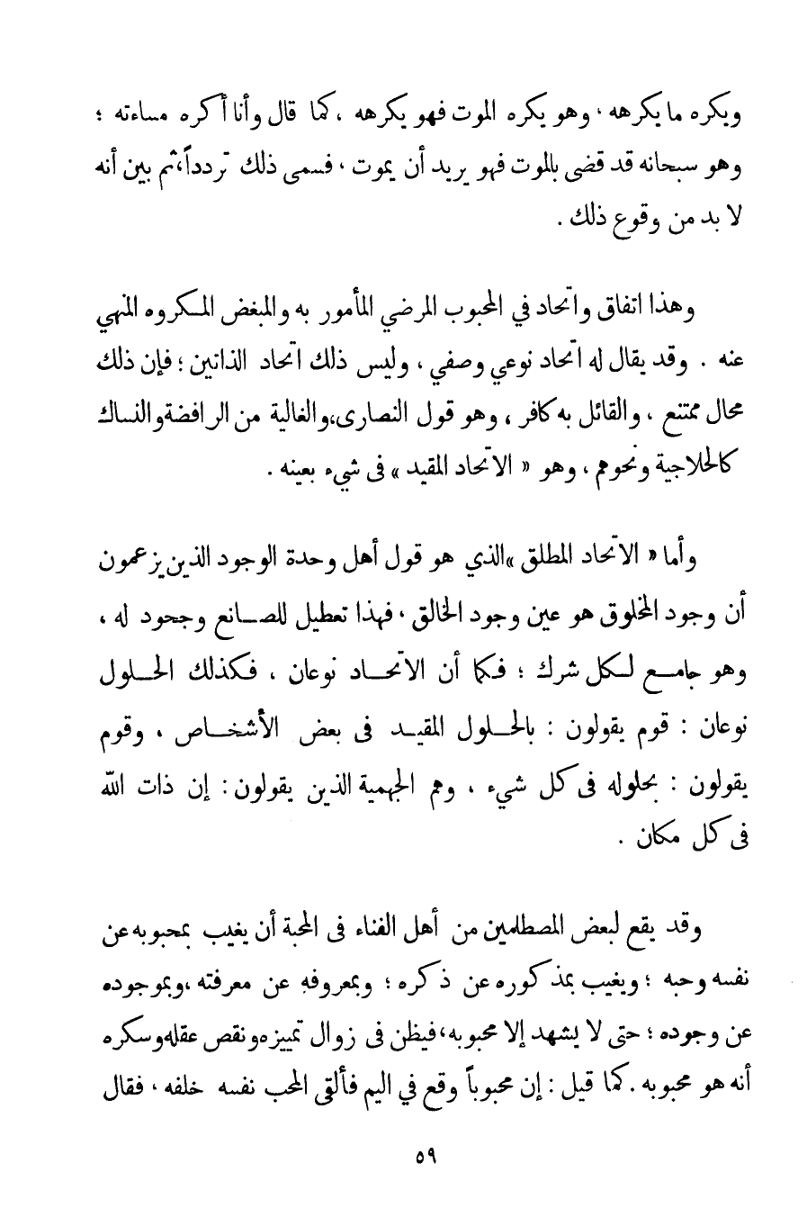 وَيَكْرَهُ مَا يَكْرَهُهُ وَهُوَ يَكْرَهُ الْمَوْتَ فَهُوَ يَكْرَهُهُ كَمَا قَالَ وَأَنَا أَكْرَهُ مُسَاءَتَهُ؛ وَهُوَ سُبْحَانَهُ قَدْ قَضَى بِالْمَوْتِ فَهُوَ يُرِيدُ أَنْ يَمُوتَ فَسَمَّى ذَلِكَ تَرَدُّدًا ثُمَّ بَيَّنَ أَنَّهُ لَا بُدَّ مِنْ وُقُوعِ ذَلِكَ. وَهَذَا اتِّفَاقٌ وَاتِّحَادٌ فِي الْمَحْبُوبِ الْمَرْضِيِّ الْمَأْمُورِ بِهِ وَالْمُبْغِضِ الْمَكْرُوهِ الْمَنْهِيِّ عَنْهُ. وَقَدْ يُقَالُ لَهُ اتِّحَادٌ نَوْعِيٌّ وَصْفِيٌّ وَلَيْسَ ذَلِكَ اتِّحَادُ الذَّاتَيْنِ؛ فَإِنَّ ذَلِكَ مُحَالٌ مُمْتَنِعٌ وَالْقَائِلُ بِهِ كَافِرٌ وَهُوَ قَوْلُ النَّصَارَى وَالْغَالِيَةِ مِنْ الرَّافِضَةِ وَالنُّسَّاكِ كَالْحَلَّاجِيَّةِ وَنَحْوِهِمْ وَهُوَ " الِاتِّحَادُ الْمُقَيَّدُ " فِي شَيْءٍ بِعَيْنِهِ.