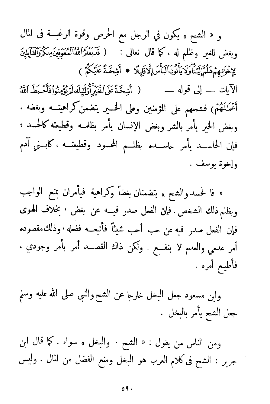 وَ " الشُّحُّ " يَكُونُ فِي الرَّجُلِ مَعَ الْحِرْصِ وَقُوَّةِ الرَّغْبَةِ فِي الْمَالِ وَبُغْضٍ لِلْغَيْرِ وَظُلْمٍ لَهُ كَمَا قَالَ تَعَالَى: {قَدْ يَعْلَمُ اللَّهُ الْمُعَوِّقِينَ مِنْكُمْ وَالْقَائِلِينَ لِإِخْوَانِهِمْ هَلُمَّ إلَيْنَا وَلَا يَأْتُونَ الْبَأْسَ إلَّا قَلِيلًا أَشِحَّةً عَلَيْكُمْ} الْآيَاتِ - إلَى قَوْلِهِ - {أَشِحَّةً عَلَى الْخَيْرِ أُولَئِكَ لَمْ يُؤْمِنُوا فَأَحْبَطَ اللَّهُ أَعْمَالَهُمْ} فَشُحُّهُمْ عَلَى الْمُؤْمِنِينَ وَعَلَى الْخَيْرِ يَتَضَمَّنُ كَرَاهِيَتَهُ وَبُغْضَهُ، وَبُغْضُ الْخَيْرِ يَأْمُرُ بِالشَّرِّ، وَبُغْضُ الْإِنْسَانِ يَأْمُرُ بِظُلْمِهِ وَقَطِيعَتِهِ كَالْحَسَدِ؛ فَإِنَّ الْحَاسِدَ يَأْمُرُ حَاسِدَهُ بِظُلْمِ الْمَحْسُودِ وَقَطِيعَتِهِ كَابْنَيْ آدَمَ وَإِخْوَةِ يُوسُفَ. " فَالْحَسَدُ وَالشُّحُّ " يَتَضَمَّنَانِ بُغْضًا وَكَرَاهِيَةً فَيَأْمُرَانِ بِمَنْعِ الْوَاجِبِ وَبِظُلْمِ ذَلِكَ الشَّخْصِ فَإِنَّ الْفِعْلَ صَدَرَ فِيهِ عَنْ بُغْضٍ بِخِلَافِ الْهَوَى فَإِنَّ الْفِعْلَ صَدَرَ فِيهِ عَنْ حُبّ أَحَبّ شَيْئًا فَأَتْبَعُهُ فَفَعَلَهُ وَذَلِكَ مَقْصُودُهُ أَمْرٌ عَدَمِيٌّ وَالْعَدَمُ لَا يَنْفَعُ. وَلَكِنَّ ذَاكَ الْقَصْدَ أَمْرٌ بِأَمْرِ وُجُودِيٍّ فَأُطِيعُ أَمْرُهُ. وَابْنُ مَسْعُودٍ جَعَلَ الْبُخْلَ خَارِجًا عَنْ الشُّحِّ وَالنَّبِيُّ صَلَّى اللَّهُ عَلَيْهِ وَسَلَّمَ جَعَلَ الشُّحَّ يَأْمُرُ بِالْبُخْلِ. وَمِنْ النَّاسِ مَنْ يَقُولُ: " الشُّحُّ وَالْبُخْلُ " سَوَاءٌ. كَمَا قَالَ ابْنُ جَرِيرٍ: الشُّحُّ فِي كَلَامِ الْعَرَبِ هُوَ الْبُخْلُ وَمَنْعُ الْفَضْلِ مِنْ الْمَالِ. وَلَيْسَ