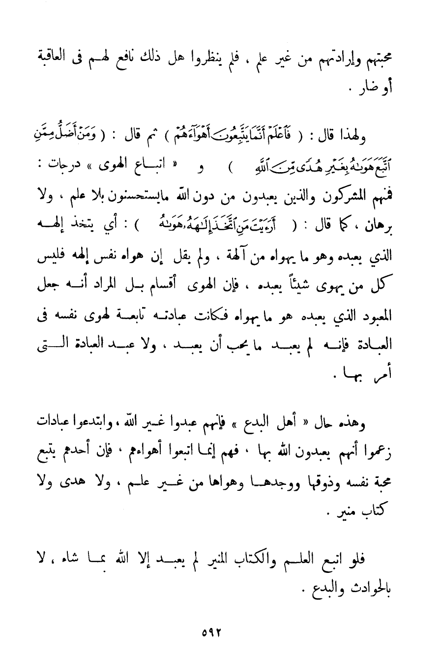 وَ " اتِّبَاعُ الْهَوَى " دَرَجَاتٌ: فَمِنْهُمْ الْمُشْرِكُونَ وَاَلَّذِينَ يَعْبُدُونَ مِنْ دُونِ اللَّهِ مَا يَسْتَحْسِنُونَ بِلَا عِلْمٍ وَلَا بُرْهَانٍ كَمَا قَالَ: {أَرَأَيْتَ مَنِ اتَّخَذَ إلَهَهُ هَوَاهُ} أَيْ يَتَّخِذُ إلَهَهُ الَّذِي يَعْبُدُهُ وَهُوَ مَا يَهْوَاهُ مِنْ آلِهَةٍ وَلَمْ يَقُلْ إنَّ هَوَاهُ نَفْسُ إلَهِهِ فَلَيْسَ كُلُّ مَنْ يَهْوَى شَيْئًا يَعْبُدُهُ فَإِنَّ الْهَوَى أَقْسَامٌ بَلْ الْمُرَادُ أَنَّهُ جَعَلَ الْمَعْبُودَ الَّذِي يَعْبُدُهُ هُوَ مَا يَهْوَاهُ فَكَانَتْ عِبَادَتُهُ تَابِعَةً لِهَوَى نَفْسِهِ فِي الْعِبَادَةِ فَإِنَّهُ لَمْ يَعْبُدْ مَا يُحِبُّ أَنْ يَعْبُدَ وَلَا عَبْدَ الْعِبَادَةَ الَّتِي أُمِرَ بِهَا. وَهَذِهِ حَالُ " أَهْلِ الْبِدَعِ " فَإِنَّهُمْ عَبَدُوا غَيْرَ اللَّهِ وَابْتَدَعُوا عِبَادَاتٍ زَعَمُوا أَنَّهُمْ يَعْبُدُونَ اللَّهَ بِهَا فَهُمْ إنَّمَا اتَّبَعُوا أَهْوَاءَهُمْ فَإِنَّ أَحَدَهُمْ يَتَّبِعُ مَحَبَّةَ نَفْسِهِ وَذَوْقَهَا وَوَجْدَهَا وَهَوَاهَا مِنْ غَيْرِ عِلْمٍ وَلَا هُدًى وَلَا كِتَابٍ مُنِيرٍ. فَلَوْ اتَّبَعَ الْعِلْمَ وَالْكِتَابَ الْمُنِيرَ لَمْ يَعْبُدْ إلَّا اللَّهَ بِمَا شَاءَ لَا بِالْحَوَادِثِ وَالْبِدَعِ.