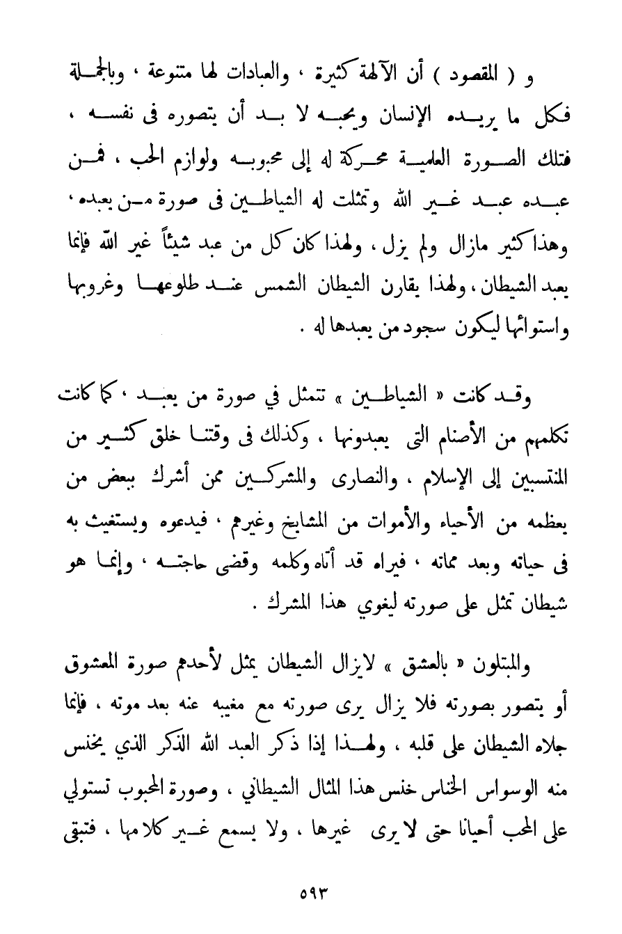 وَالْمَقْصُودُ: أَنَّ الْآلِهَةَ كَثِيرَةٌ وَالْعِبَادَاتُ لَهَا مُتَنَوِّعَةٌ وَبِالْجُمْلَةِ فَكُلُّ مَا يُرِيدُهُ الْإِنْسَانُ وَيُحِبُّهُ لَا بُدَّ أَنْ يَتَصَوَّرَهُ فِي نَفْسِهِ فَتِلْكَ الصُّورَةُ الْعِلْمِيَّةُ مُحَرِّكَةٌ لَهُ إلَى مَحْبُوبِهِ وَلَوَازِمِ الْحُبِّ فَمَنْ عَبَدَهُ عَبَدَ غَيْرَ اللَّهِ وَتَمَثَّلَتْ لَهُ الشَّيَاطِينُ فِي صُورَةِ مَنْ يَعْبُدُهُ وَهَذَا كَثِيرٌ مَا زَالَ وَلَمْ يَزَلْ وَلِهَذَا كَانَ كُلُّ مَنْ عَبَدَ شَيْئًا غَيْرَ اللَّهِ فَإِنَّمَا يَعْبُدُ الشَّيْطَانَ وَلِهَذَا يُقَارِنُ الشَّيْطَانُ الشَّمْسَ عِنْدَ طُلُوعِهَا وَغُرُوبِهَا وَاسْتِوَائِهَا لِيَكُونَ سُجُودُ مَنْ يَعْبُدُهَا لَهُ. وَقَدْ كَانَتْ " الشَّيَاطِينُ " تَتَمَثَّلُ فِي صُورَةِ مَنْ يُعْبَدُ كَمَا كَانَتْ تُكَلِّمُهُمْ مِنْ الْأَصْنَامِ الَّتِي يَعْبُدُونَهَا وَكَذَلِكَ فِي وَقْتِنَا خَلْقٌ كَثِيرٌ مِنْ الْمُنْتَسِبِينَ إلَى الْإِسْلَامِ وَالنَّصَارَى وَالْمُشْرِكِينَ مِمَّنْ أَشْرَكَ بِبَعْضِ مَنْ يُعَظِّمُهُ مِنْ الْأَحْيَاءِ وَالْأَمْوَاتِ مِنْ الْمَشَايِخِ وَغَيْرِهِمْ فَيَدْعُوهُ وَيَسْتَغِيثُ بِهِ فِي حَيَاتِهِ وَبَعْدَ مَمَاتِهِ فَيَرَاهُ قَدْ أَتَاهُ وَكَلَّمَهُ وَقَضَى حَاجَتَهُ وَإِنَّمَا هُوَ شَيْطَانٌ تَمَثَّلَ عَلَى صُورَتِهِ لِيُغْوِيَ هَذَا الْمُشْرِكَ. وَالْمُبْتَلُونَ " بِالْعِشْقِ " لَا يَزَالُ الشَّيْطَانُ يُمَثِّلُ لِأَحَدِهِمْ صُورَةَ الْمَعْشُوقِ أَوْ يَتَصَوَّرُ بِصُورَتِهِ فَلَا يَزَالُ يَرَى صُورَتَهُ مَعَ مَغِيبِهِ عَنْهُ بَعْدَ مَوْتِهِ فَإِنَّمَا جَلَاهُ الشَّيْطَانُ عَلَى قَلْبِهِ وَلِهَذَا إذَا ذَكَرَ الْعَبْدُ اللَّهَ الذِّكْرَ الَّذِي يَخْنِسُ مِنْهُ الْوَسْوَاسُ الْخَنَّاسُ خَنَسَ هَذَا الْمِثَالُ الشَّيْطَانِيُّ وَصُورَةُ الْمَحْبُوبِ تَسْتَوْلِي عَلَى الْمُحِبِّ أَحْيَانًا حَتَّى لَا يَرَى غَيْرَهَا وَلَا يَسْمَعَ غَيْرَ كَلَامِهَا فَتَبْقَى