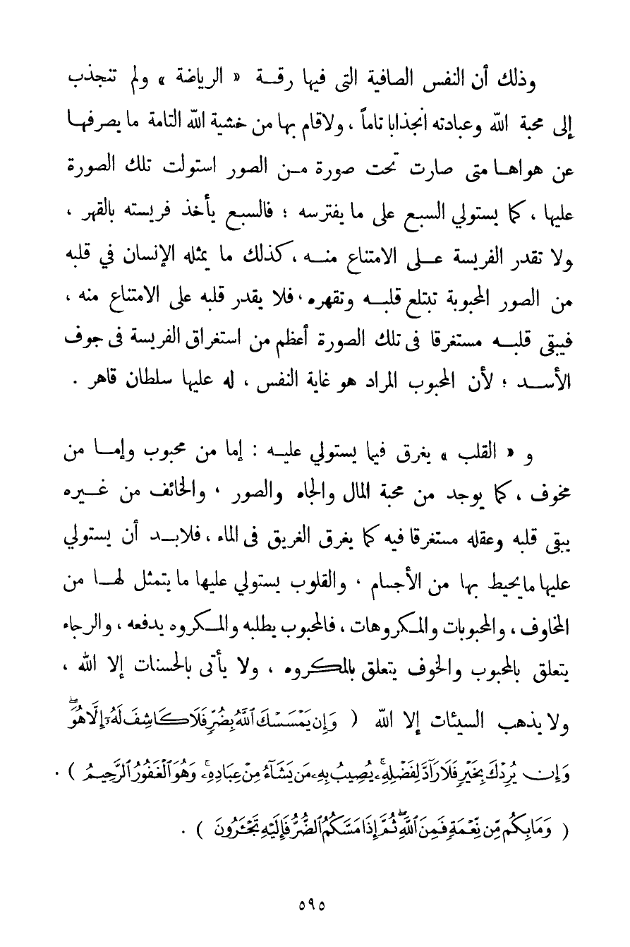 وَذَلِكَ أَنَّ النَّفْسَ الصَّافِيَةَ الَّتِي فِيهَا رِقَّةُ " الرِّيَاضَةِ " وَلَمْ تَنْجَذِبْ إلَى مَحَبَّةِ اللَّهِ وَعِبَادَتِهِ انْجِذَابًا تَامًّا وَلَا قَامَ بِهَا مِنْ خَشْيَةِ اللَّهِ التَّامَّةِ مَا يَصْرِفُهَا عَنْ هَوَاهَا مَتَى صَارَتْ تَحْتَ صُورَةٍ مِنْ الصُّوَرِ اسْتَوْلَتْ تِلْكَ الصُّورَةُ عَلَيْهَا كَمَا يَسْتَوْلِي السَّبُعُ عَلَى مَا يَفْتَرِسُهُ؛ فَالسُّبُعُ يَأْخُذُ فَرِيسَتَهُ بِالْقَهْرِ وَلَا تَقْدِرُ الْفَرِيسَةُ عَلَى الِامْتِنَاعِ مِنْهُ كَذَلِكَ مَا يُمَثِّلُهُ الْإِنْسَانُ فِي قَلْبِهِ مِنْ الصُّوَرِ الْمَحْبُوبَةِ تَبْتَلِعُ قَلْبَهُ وَتَقْهَرَهُ فَلَا يَقْدِرُ قَلْبُهُ عَلَى الِامْتِنَاعِ مِنْهُ فَيَبْقَى قَلْبُهُ مُسْتَغْرِقًا فِي تِلْكَ الصُّورَةِ أَعْظَمَ مِنْ اسْتِغْرَاقِ الْفَرِيسَةِ فِي جَوْفِ الْأَسَدِ؛ لِأَنَّ الْمَحْبُوبَ الْمُرَادَ هُوَ غَايَةُ النَّفْسِ لَهُ عَلَيْهَا سُلْطَانٌ قَاهِرٌ. وَ " الْقَلْبُ " يَغْرَقُ فِيمَا يَسْتَوْلِي عَلَيْهِ: إمَّا مِنْ مَحْبُوبٍ وَإِمَّا مِنْ مَخُوفٍ كَمَا يُوجَدُ مِنْ مَحَبَّةِ الْمَالِ وَالْجَاهِ وَالصُّوَرِ، وَالْخَائِفُ مِنْ غَيْرِهِ يَبْقَى قَلْبُهُ وَعَقْلُهُ مُسْتَغْرِقًا فِيهِ كَمَا يَغْرَقُ الْغَرِيقُ فِي الْمَاءِ فَلَا بُدَّ أَنْ يَسْتَوْلِيَ عَلَيْهَا مَا يُحِيطُ بِهَا مِنْ الْأَجْسَامِ وَالْقُلُوبِ يَسْتَوْلِي عَلَيْهَا مَا يَتَمَثَّلُ لَهَا مِنْ الْمَخَاوِفِ وَالْمَحْبُوبَاتِ وَالْمَكْرُوهَاتِ فَالْمَحْبُوبُ يَطْلُبُهُ وَالْمَكْرُوهُ يَدْفَعُهُ وَالرَّجَاءُ يَتَعَلَّقُ بِالْمَحْبُوبِ، وَالْخَوْفُ يَتَعَلَّقُ بِالْمَكْرُوهِ وَلَا يَأْتِي بِالْحَسَنَاتِ إلَّا اللَّهُ وَلَا يُذْهِبُ السَّيِّئَاتِ إلَّا اللَّهُ {وَإِنْ يَمْسَسْكَ اللَّهُ بِضُرٍّ فَلَا كَاشِفَ لَهُ إلَّا هُوَ وَإِنْ يُرِدْكَ بِخَيْرٍ فَلَا رَادَّ لِفَضْلِهِ يُصِيبُ بِهِ مَنْ يَشَاءُ مِنْ عِبَادِهِ وَهُوَ الْغَفُورُ الرَّحِيمُ} . {وَمَا بِكُمْ مِنْ نِعْمَةٍ فَمِنَ اللَّهِ ثُمَّ إذَا مَسَّكُمُ الضُّرُّ فَإِلَيْهِ تَجْأَرُونَ} .