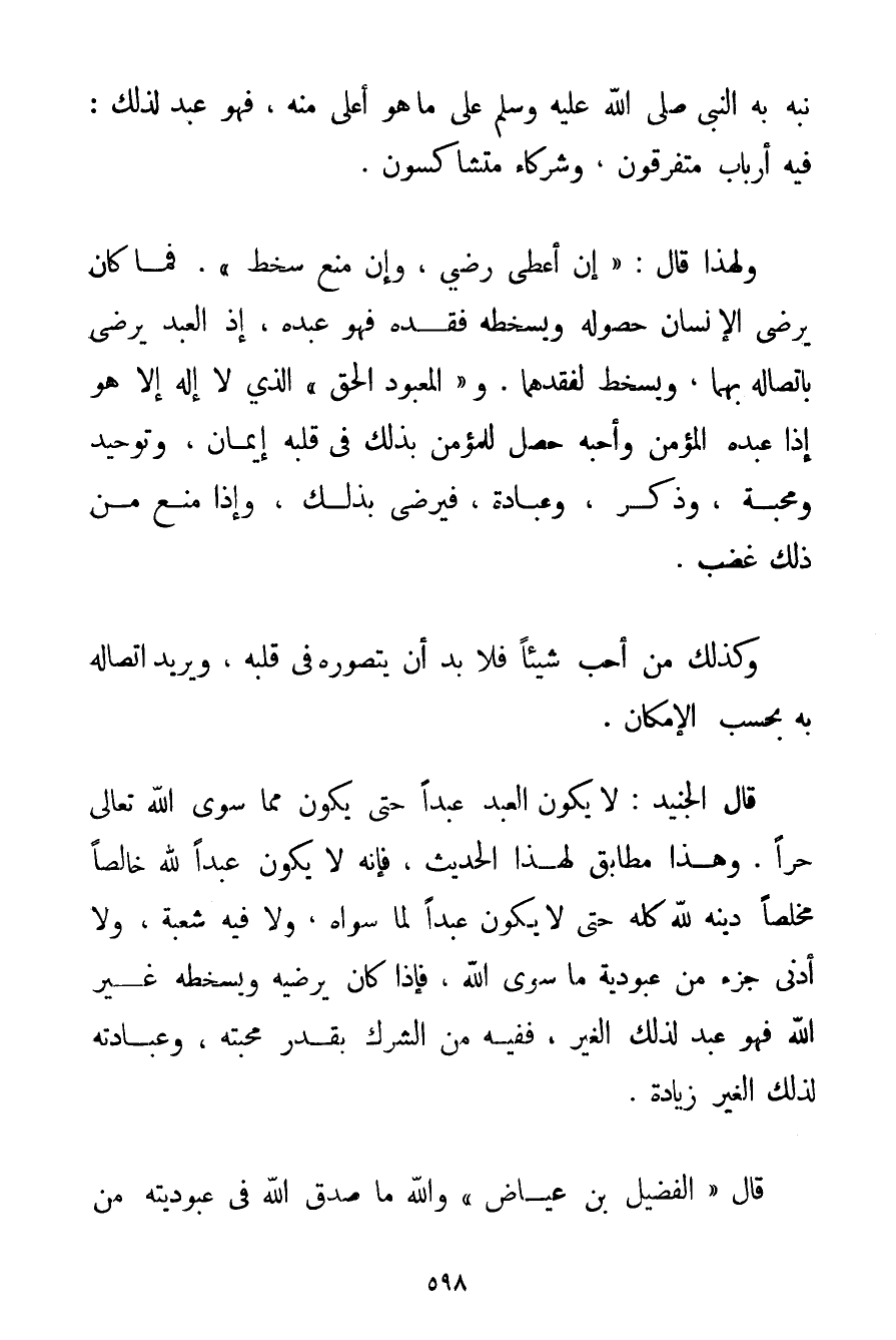 نَبَّهَ بِهِ النَّبِيُّ صَلَّى اللَّهُ عَلَيْهِ وَسَلَّمَ عَلَى مَا هُوَ أَعْلَى مِنْهُ فَهُوَ عَبْدٌ لِذَلِكَ: فِيهِ أَرْبَابٌ مُتَفَرِّقُونَ وَشُرَكَاءُ مُتَشَاكِسُونَ. وَلِهَذَا قَالَ: {إنْ أُعْطِيَ رَضِيَ وَإِنْ مُنِعَ سَخِطَ} . فَمَا كَانَ يُرْضِي الْإِنْسَانَ حُصُولُهُ، وَيُسْخِطُهُ فَقْدُهُ فَهُوَ عَبْدُهُ إذْ الْعَبْدُ يَرْضَى بِاتِّصَالِهِ بِهِمَا وَيَسْخَطُ لِفَقْدِهِمَا. وَ " الْمَعْبُودُ الْحَقُّ " الَّذِي لَا إلَهَ إلَّا هُوَ إذَا عَبَدَهُ الْمُؤْمِنُ وَأَحَبَّهُ حَصَلَ لِلْمُؤْمِنِ بِذَلِكَ فِي قَلْبِهِ إيمَانٌ وَتَوْحِيدٌ وَمَحَبَّةٌ وَذِكْرٌ وَعِبَادَةٌ فَيَرْضَى بِذَلِكَ وَإِذَا مُنِعَ مِنْ ذَلِكَ غَضِبَ. وَكَذَلِكَ مَنْ أَحَبّ شَيْئًا فَلَا بُدَّ أَنْ يَتَصَوَّرَهُ فِي قَلْبِهِ، وَيُرِيدَ اتِّصَالَهُ بِهِ بِحَسَبِ الْإِمْكَانِ. قَالَ الْجُنَيْد: لَا يَكُونُ الْعَبْدُ عَبْدًا حَتَّى يَكُونَ مِمَّا سِوَى اللَّهِ تَعَالَى حُرًّا. وَهَذَا مُطَابِقٌ لِهَذَا الْحَدِيثِ فَإِنَّهُ لَا يَكُونُ عَبْدًا لِلَّهِ خَالِصًا مُخْلِصًا دِينَهُ لِلَّهِ كُلَّهُ حَتَّى لَا يَكُونَ عَبْدًا لِمَا سِوَاهُ وَلَا فِيهِ شُعْبَةٌ وَلَا أَدْنَى جُزْءٍ مِنْ عُبُودِيَّةِ مَا سِوَى اللَّهِ فَإِذَا كَانَ يُرْضِيهِ وَيُسْخِطُهُ غَيْرُ اللَّهِ فَهُوَ عَبْدٌ لِذَلِكَ الْغَيْرِ فَفِيهِ مِنْ الشِّرْكِ بِقَدْرِ مَحَبَّتِهِ، وَعِبَادَتُهُ لِذَلِكَ الْغَيْرِ زِيَادَةٌ. قَالَ " الْفُضَيْل بْنُ عِيَاضٍ " وَاَللَّهِ مَا صَدَقَ اللَّهَ فِي عُبُودِيَّتِهِ مَنْ