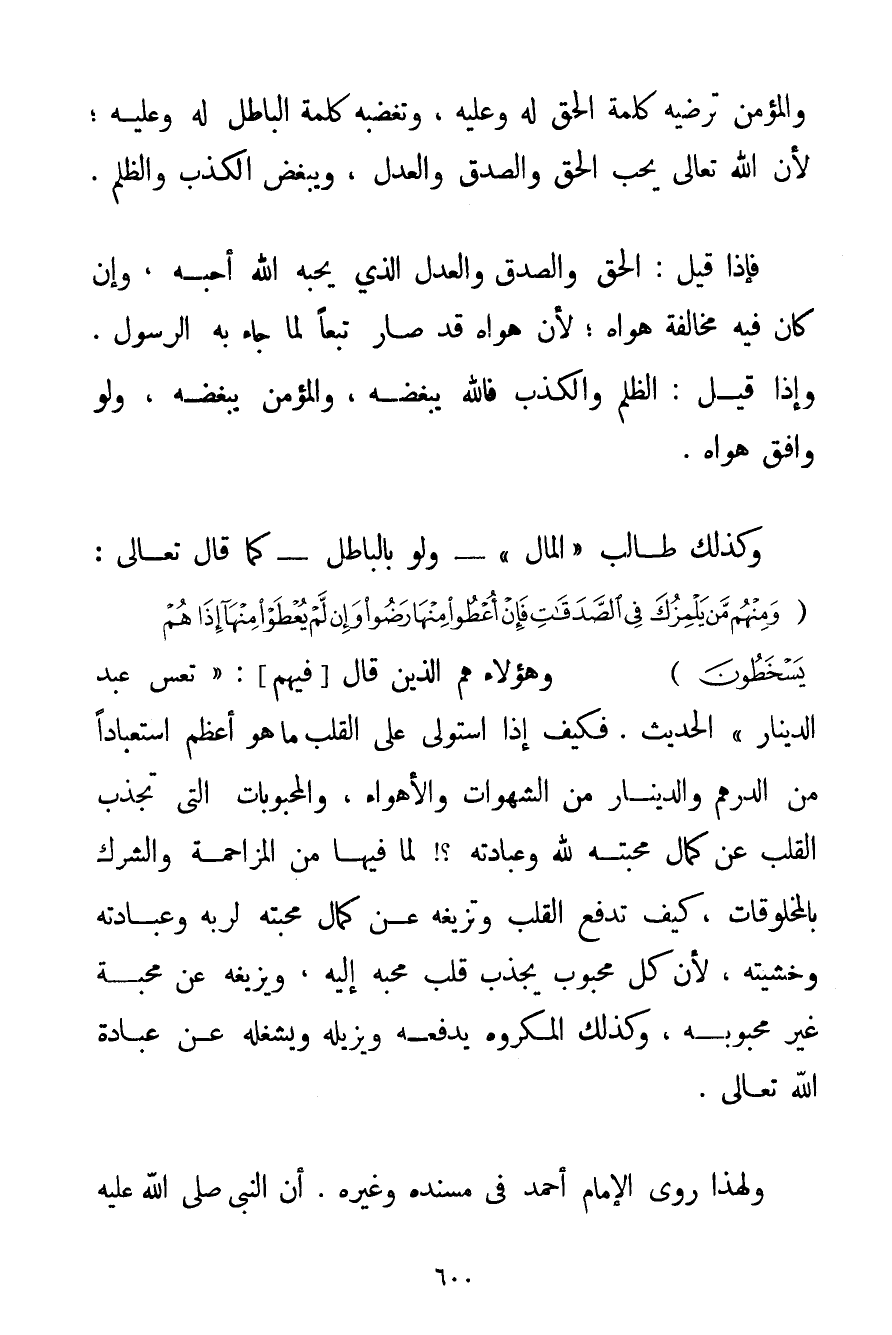 وَالْمُؤْمِنُ تُرْضِيهِ كَلِمَةُ الْحَقِّ لَهُ وَعَلَيْهِ، وَتُغْضِبُهُ كَلِمَةُ الْبَاطِلِ لَهُ وَعَلَيْهِ؛ لِأَنَّ اللَّهَ تَعَالَى يُحِبُّ الْحَقَّ وَالصِّدْقَ وَالْعَدْلَ وَيُبْغِضُ الْكَذِبَ وَالظُّلْمَ. فَإِذَا قِيلَ: الْحَقُّ وَالصِّدْقُ وَالْعَدْلُ الَّذِي يُحِبُّهُ اللَّهُ أُحِبُّهُ وَإِنْ كَانَ فِيهِ مُخَالَفَةُ هَوَاهُ. لِأَنَّ هَوَاهُ قَدْ صَارَ تَبَعًا لِمَا جَاءَ بِهِ الرَّسُولُ. وَإِذَا قِيلَ: الظُّلْمُ وَالْكَذِبُ فَاَللَّهُ يُبْغِضُهُ وَالْمُؤْمِنُ يُبْغِضُهُ وَلَوْ وَافَقَ هَوَاهُ. وَكَذَلِكَ طَالِبُ " الْمَالِ " - وَلَوْ بِالْبَاطِلِ - كَمَا قَالَ تَعَالَى: {وَمِنْهُمْ مَنْ يَلْمِزُكَ فِي الصَّدَقَاتِ فَإِنْ أُعْطُوا مِنْهَا رَضُوا وَإِنْ لَمْ يُعْطَوْا مِنْهَا إذَا هُمْ يَسْخَطُونَ} وَهَؤُلَاءِ هُمْ الَّذِينَ قَالَ فِيهِمْ: {تَعِسَ عَبْدُ الدِّينَارِ} الْحَدِيثَ. فَكَيْفَ إذَا اسْتَوْلَى عَلَى الْقَلْبِ مَا هُوَ أَعْظَمُ اسْتِعْبَادًا مِنْ الدِّرْهَمِ وَالدِّينَارِ مِنْ الشَّهَوَاتِ وَالْأَهْوَاءِ وَالْمَحْبُوبَاتِ الَّتِي تَجْذِبُ الْقَلْبَ عَنْ كَمَالِ مَحَبَّتِهِ لِلَّهِ وَعِبَادَتِهِ لِمَا فِيهَا مِنْ الْمُزَاحَمَةِ وَالشِّرْكِ بِالْمَخْلُوقَاتِ كَيْفَ تَدْفَعُ الْقَلْبَ وَتُزِيغُهُ عَنْ كَمَالِ مَحَبَّتِهِ لِرَبِّهِ وَعِبَادَتِهِ وَخَشْيَتِهِ لِأَنَّ كُلَّ مَحْبُوبٍ يَجْذِبُ قَلْبَ مُحِبِّهِ إلَيْهِ وَيُزِيغُهُ عَنْ مَحَبَّةِ غَيْرِ مَحْبُوبِهِ، وَكَذَلِكَ الْمَكْرُوهُ يَدْفَعُهُ وَيُزِيلُهُ وَيَشْغَلُهُ عَنْ عِبَادَةِ اللَّهِ تَعَالَى. وَلِهَذَا رَوَى الْإِمَامُ أَحْمَدُ فِي مُسْنَده وَغَيْرُهُ. أَنَّ النَّبِيَّ صَلَّى اللَّهُ عَلَيْهِ وَسَلَّمَ