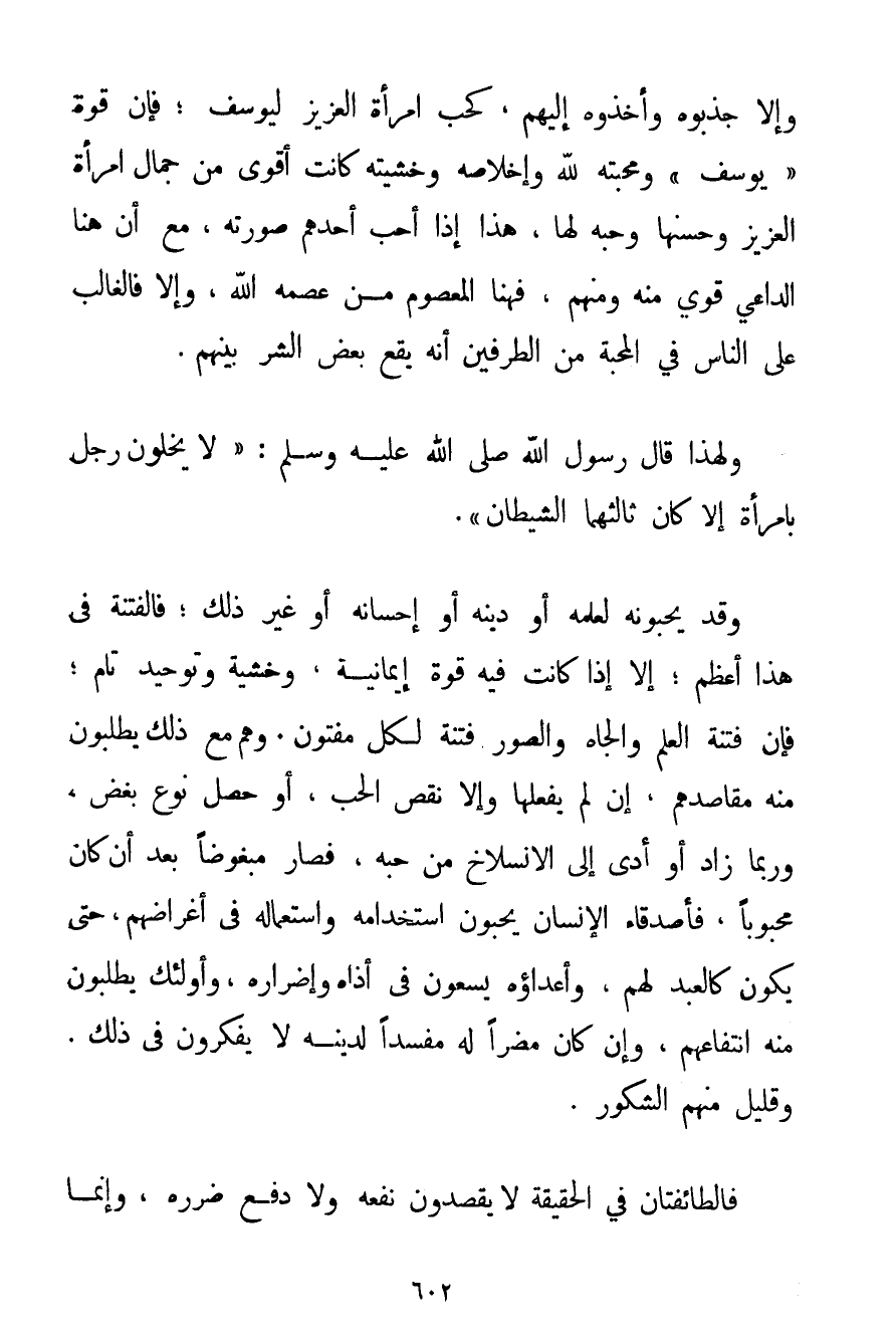 وَإِلَّا جَذَبُوهُ وَأَخَذُوهُ إلَيْهِمْ كَحُبِّ امْرَأَةِ الْعَزِيزِ لِيُوسُفَ؛ فَإِنَّ قُوَّةَ " يُوسُفَ " وَمَحَبَّتَهُ لِلَّهِ وَإِخْلَاصَهُ وَخَشْيَتَهُ كَانَتْ أَقْوَى مِنْ جَمَالِ امْرَأَةِ الْعَزِيزِ وَحُسْنِهَا وَحُبِّهِ لَهَا، هَذَا إذَا أَحَبّ أَحَدُهُمْ صُورَتَهُ مَعَ أَنَّ هُنَا الدَّاعِيَ قَوِيٌّ مِنْهُ وَمِنْهُمْ فَهُنَا الْمَعْصُومُ مَنْ عَصَمَهُ اللَّهُ وَإِلَّا فَالْغَالِبُ عَلَى النَّاسِ فِي الْمَحَبَّةِ مِنْ الطَّرَفَيْنِ أَنَّهُ يَقَعُ بَعْضُ الشَّرِّ بَيْنَهُمْ. وَلِهَذَا قَالَ رَسُولُ اللَّهِ صَلَّى اللَّهُ عَلَيْهِ وَسَلَّمَ {لَا يَخْلُوَنَّ رَجُلٌ بِامْرَأَةٍ إلَّا كَانَ ثَالِثَهُمَا الشَّيْطَانُ} . وَقَدْ يُحِبُّونَهُ لِعِلْمِهِ أَوْ دِينِهِ أَوْ إحْسَانِهِ أَوْ غَيْرِ ذَلِكَ؛ فَالْفِتْنَةُ فِي هَذَا أَعْظَمُ؛ إلَّا إذَا كَانَتْ فِيهِ قُوَّةٌ إيمَانِيَّةٌ وَخَشْيَةٌ وَتَوْحِيدٌ تَامٌّ؛ فَإِنَّ فِتْنَةَ الْعِلْمِ وَالْجَاهِ وَالصُّوَرِ فِتْنَةٌ لِكُلِّ مَفْتُونٍ. وَهُمْ مَعَ ذَلِكَ يَطْلُبُونَ مِنْهُ مَقَاصِدَهُمْ إنْ لَمْ يَفْعَلْهَا وَإِلَّا نَقَصَ الْحُبُّ. أَوْ حَصَلَ نَوْعُ بُغْضٍ وَرُبَّمَا زَادَ أَوْ أَدَّى إلَى الِانْسِلَاخِ مِنْ حُبِّهِ فَصَارَ مَبْغُوضًا بَعْدَ أَنْ كَانَ مَحْبُوبًا فَأَصْدِقَاءُ الْإِنْسَانِ يُحِبُّونَ اسْتِخْدَامَهُ وَاسْتِعْمَالَهُ فِي أَغْرَاضِهِمْ حَتَّى يَكُونَ كَالْعَبْدِ لَهُمْ وَأَعْدَاؤُهُ يَسْعَوْنَ فِي أَذَاهُ وَإِضْرَارِهِ وَأُولَئِكَ يَطْلُبُونَ مِنْهُ انْتِفَاعَهُمْ وَإِنْ كَانَ مُضِرًّا لَهُ مُفْسِدًا لِدِينِهِ لَا يُفَكِّرُونَ فِي ذَلِكَ. وَقَلِيلٌ مِنْهُمْ الشَّكُورُ. فَالطَّائِفَتَانِ فِي الْحَقِيقَةِ لَا يَقْصِدُونَ نَفْعَهُ وَلَا دَفْعَ ضَرَرِهِ وَإِنَّمَا