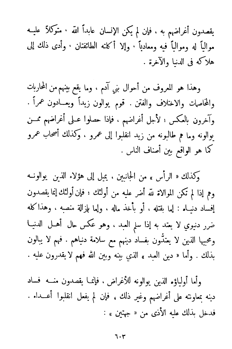 يَقْصِدُونَ أَغْرَاضَهُمْ بِهِ فَإِنْ لَمْ يَكُنْ الْإِنْسَانُ عَابِدًا اللَّهَ مُتَوَكِّلًا عَلَيْهِ مُوَالِيًا لَهُ وَمُوَالِيًا فِيهِ وَمُعَادِيًا وَإِلَّا أَكَلَتْهُ الطَّائِفَتَانِ وَأَدَّى ذَلِكَ إلَى هَلَاكِهِ فِي الدُّنْيَا وَالْآخِرَةِ. وَهَذَا هُوَ الْمَعْرُوفُ مِنْ أَحْوَالِ بَنِي آدَمَ وَمَا يَقَعُ بَيْنَهُمْ مِنْ الْمُحَارَبَاتِ وَالْمُخَاصَمَاتِ وَالِاخْتِلَافِ وَالْفِتَنِ. قَوْمٌ يُوَالُونَ زَيْدًا وَيُعَادُونَ عَمْرًا. وَآخَرُونَ بِالْعَكْسِ؛ لِأَجْلِ أَغْرَاضِهِمْ فَإِذَا حَصَلُوا عَلَى أَغْرَاضِهِمْ مِمَّنْ يُوَالُونَهُ وَمَا هُمْ طالبونه مِنْ زَيْدٍ انْقَلَبُوا إلَى عَمْرٍو، وَكَذَلِكَ أَصْحَابُ عَمْرو كَمَا هُوَ الْوَاقِعُ بَيْنَ أَصْنَافِ النَّاسِ. وَكَذَلِكَ " الرَّأْسُ " مِنْ الْجَانِبَيْنِ يَمِيلُ إلَى هَؤُلَاءِ الَّذِينَ يُوَالُونَهُ وَهُمْ إذَا لَمْ تَكُنْ الْمُوَالَاةُ لِلَّهِ أَضَرَّ عَلَيْهِ مِنْ أُولَئِكَ؛ فَإِنَّ أُولَئِكَ إنَّمَا يَقْصِدُونَ إفْسَادَ دُنْيَاهُ: إمَّا بِقَتْلِهِ أَوْ بِأَخْذِ مَالِهِ، وَإِمَّا بِإِزَالَةِ مَنْصِبِهِ وَهَذَا كُلُّهُ ضَرَرٌ دُنْيَوِيٌّ لَا يُعْتَدُّ بِهِ إذَا سَلَّمَ الْعَبْدُ وَهُوَ عَكْسُ حَالِ أَهْلِ الدُّنْيَا وَمُحِبِّيهَا الَّذِينَ لَا يَعْتَدُّونَ بِفَسَادِ دِينِهِمْ مَعَ سَلَامَةِ دُنْيَاهُمْ. فَهُمْ لَا يُبَالُونَ بِذَلِكَ. وَأَمَّا " دِينُ الْعَبْدِ " الَّذِي بَيْنَهُ وَبَيْنَ اللَّهِ فَهُمْ لَا يَقْدِرُونَ عَلَيْهِ. وَأَمَّا أَوْلِيَاؤُهُ الَّذِينَ يُوَالُونَهُ لِلْأَغْرَاضِ فَإِنَّمَا يَقْصِدُونَ مِنْهُ فَسَادَ دِينِهِ بِمُعَاوَنَتِهِ عَلَى أَغْرَاضِهِمْ وَغَيْرِ ذَلِكَ فَإِنْ لَمْ يَفْعَلْ انْقَلَبُوا أَعْدَاءً. فَدَخَلَ بِذَلِكَ عَلَيْهِ الْأَذَى مِنْ " جِهَتَيْنِ ":
