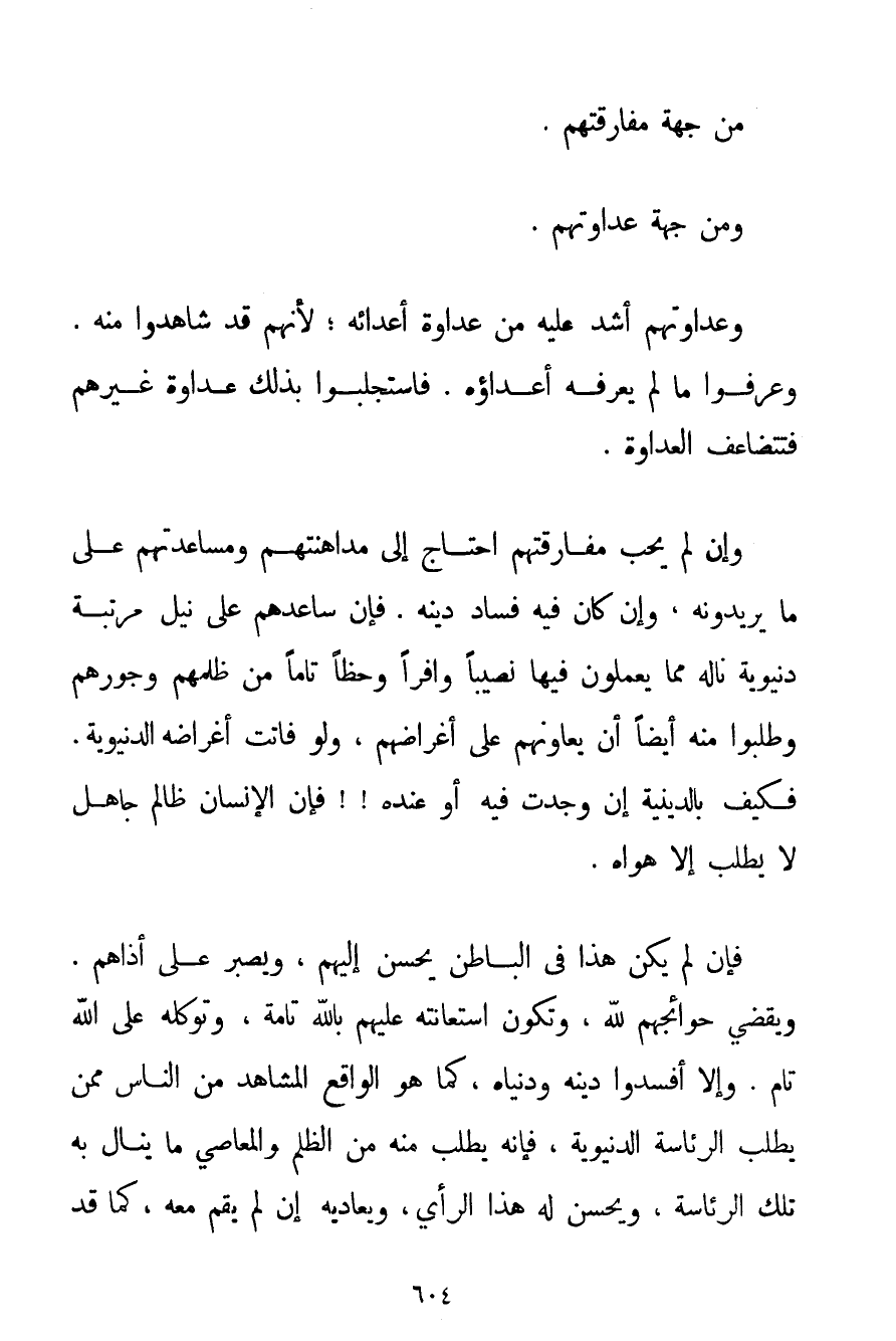 وَعَدَاوَتُهُمْ أَشَدُّ عَلَيْهِ مِنْ عَدَاوَةِ أَعْدَائِهِ؛ لِأَنَّهُمْ قَدْ شَاهَدُوا مِنْهُ. وَعَرَفُوا مَا لَمْ يَعْرِفْهُ أَعْدَاؤُهُ. فَاسْتَجْلَبُوا بِذَلِكَ عَدَاوَةَ غَيْرِهِمْ فَتَتَضَاعَفُ الْعَدَاوَةُ. وَإِنْ لَمْ يُحِبّ مُفَارَقَتَهُمْ احْتَاجَ إلَى مُدَاهَنَتِهِمْ وَمُسَاعَدَتِهِمْ عَلَى مَا يُرِيدُونَهُ وَإِنْ كَانَ فِيهِ فَسَادُ دِينِهِ. فَإِنْ سَاعَدَهُمْ عَلَى نَيْلِ مَرْتَبَةٍ دُنْيَوِيَّةٍ نَالَهُ مِمَّا يَعْمَلُونَ فِيهَا نَصِيبًا وَافِرًا وَحَظًّا تَامًّا مِنْ ظُلْمِهِمْ وَجَوْرِهِمْ وَطَلَبُوا مِنْهُ أَيْضًا أَنْ يُعَاوِنَهُمْ عَلَى أَغْرَاضِهِمْ وَلَوْ فَاتَتْ أَغْرَاضُهُ الدُّنْيَوِيَّةُ. فَكَيْفَ بِالدِّينِيَّةِ إنْ وُجِدَتْ فِيهِ أَوْ عِنْدَهُ فَإِنَّ الْإِنْسَانَ ظَالِمٌ جَاهِلٌ لَا يَطْلُبُ إلَّا هَوَاهُ. فَإِنْ لَمْ يَكُنْ هَذَا فِي الْبَاطِنِ يُحْسِنُ إلَيْهِمْ وَيَصْبِرُ عَلَى أَذَاهُمْ. وَيَقْضِي حَوَائِجَهُمْ لِلَّهِ وَتَكُونُ اسْتِعَانَتُهُ عَلَيْهِمْ بِاَللَّهِ تَامَّةً وَتَوَكُّلُهُ عَلَى اللَّهِ تَامٌّ. وَإِلَّا أَفْسَدُوا دِينَهُ وَدُنْيَاهُ كَمَا هُوَ الْوَاقِعُ الْمُشَاهَدُ مِنْ النَّاسِ مِمَّنْ يَطْلُبُ الرِّئَاسَةَ الدُّنْيَوِيَّةَ فَإِنَّهُ يَطْلُبُ مِنْهُ مِنْ الظُّلْمِ وَالْمَعَاصِي مَا يَنَالُ بِهِ تِلْكَ الرِّئَاسَةَ وَيُحْسِنُ لَهُ هَذَا الرَّأْيَ، وَيُعَادِيهِ إنْ لَمْ يَقُمْ مَعَهُ كَمَا قَدْ