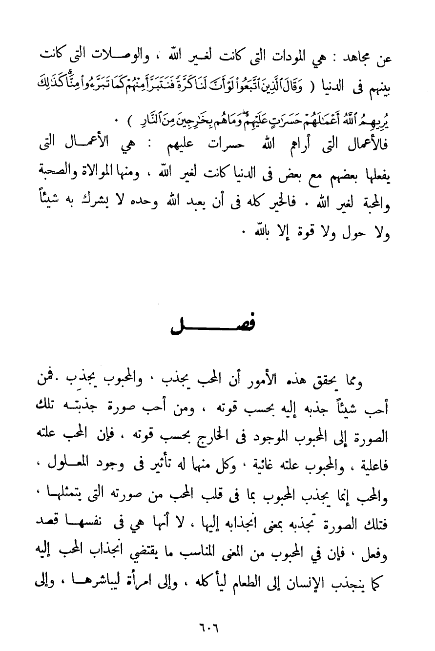 وَمِمَّا يُحَقِّقُ هَذِهِ الْأُمُورَ أَنَّ الْمُحِبَّ يَجْذِبُ وَالْمَحْبُوبَ يُجْذَبُ. فَمَنْ أَحَبَّ شَيْئًا جَذَبَهُ إلَيْهِ بِحَسَبِ قُوَّتِهِ وَمَنْ أَحَبَّ صُورَةً جَذَبَتْهُ تِلْكَ الصُّورَةُ إلَى الْمَحْبُوبِ الْمَوْجُودِ فِي الْخَارِجِ بِحَسَبِ قُوَّتِهِ فَإِنَّ الْمُحِبَّ عِلَّتُهُ فَاعِلِيَّةٌ وَالْمَحْبُوبَ عِلَّتُهُ غائية وَكُلٌّ مِنْهُمَا لَهُ تَأْثِيرٌ فِي وُجُودِ الْمَعْلُولِ وَالْمُحِبُّ إنَّمَا يَجْذِبُ الْمَحْبُوبَ بِمَا فِي قَلْبِ الْمُحِبِّ مِنْ صُورَتِهِ الَّتِي يَتَمَثَّلُهَا؛ فَتِلْكَ الصُّورَةُ تَجْذِبُهُ بِمَعْنَى انْجِذَابِهِ إلَيْهَا، لَا أَنَّهَا هِيَ فِي نَفْسِهَا قَصْدٌ وَفِعْلٌ؛ فَإِنَّ فِي الْمَحْبُوبِ مِنْ الْمَعْنَى الْمُنَاسِبِ مَا يَقْتَضِي انْجِذَابَ الْمُحِبِّ إلَيْهِ كَمَا يَنْجَذِبُ الْإِنْسَانُ إلَى الطَّعَامِ لِيَأْكُلَهُ وَإِلَى امْرَأَةٍ لِيُبَاشِرَهَا وَإِلَى