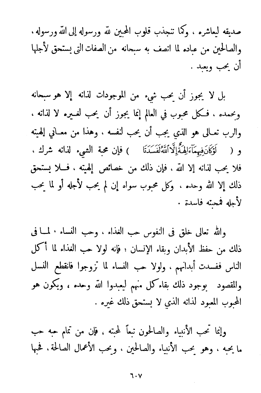 صَدِيقِهِ لِيُعَاشِرَهُ وَكَمَا تَنْجَذِبُ قُلُوبُ الْمُحِبِّينَ لِلَّهِ وَرَسُولِهِ إلَى اللَّهِ وَرَسُولِهِ وَالصَّالِحِينَ مِنْ عِبَادِهِ لِمَا اتَّصَفَ بِهِ سُبْحَانَهُ مِنْ الصِّفَاتِ الَّتِي يَسْتَحِقُّ لِأَجْلِهَا أَنْ يُحَبّ وَيُعْبَدَ. بَلْ لَا يَجُوزُ أَنْ يُحَبّ شَيْءٌ مِنْ الْمَوْجُودَاتِ لِذَاتِهِ إلَّا هُوَ سُبْحَانَهُ وَبِحَمْدِهِ فَكُلُّ مَحْبُوبٍ فِي الْعَالَمِ إنَّمَا يَجُوزُ أَنْ يُحَبّ لِغَيْرِهِ لَا لِذَاتِهِ وَالرَّبُّ تَعَالَى هُوَ الَّذِي يَجِبُ أَنْ يُحَبّ لِنَفْسِهِ وَهَذَا مِنْ مَعَانِي إلَهِيَّتِهِ و {لَوْ كَانَ فِيهِمَا آلِهَةٌ إلَّا اللَّهُ لَفَسَدَتَا} فَإِنَّ مَحَبَّةَ الشَّيْءِ لِذَاتِهِ شِرْكٌ فَلَا يُحَبُّ لِذَاتِهِ إلَّا اللَّهُ، فَإِنَّ ذَلِكَ مِنْ خَصَائِصِ إلَهِيَّتِهِ فَلَا يَسْتَحِقُّ ذَلِكَ إلَّا اللَّهُ وَحْدَهُ وَكُلُّ مَحْبُوبٍ سِوَاهُ إنْ لَمْ يُحَبّ لِأَجْلِهِ أَوْ لِمَا يُحَبُّ لِأَجْلِهِ فَمَحَبَّتُهُ فَاسِدَةٌ. وَاَللَّهُ تَعَالَى خَلَقَ فِي النُّفُوسِ حُبّ الْغِذَاءِ وَحُبَّ النِّسَاءِ لِمَا فِي ذَلِكَ مِنْ حِفْظِ الْأَبْدَانِ، وَبَقَاءِ الْإِنْسَانِ؛ فَإِنَّهُ لَوْلَا حُبّ الْغِذَاءِ لَمَا أَكَلَ النَّاسُ فَفَسَدَتْ أَبْدَانُهُمْ وَلَوْلَا حُبُّ النِّسَاءِ لَمَا تَزَوَّجُوا فَانْقَطَعَ النَّسْلُ. وَالْمَقْصُودُ بِوُجُودِ ذَلِكَ بَقَاءُ كُلٍّ مِنْهُمْ لِيَعْبُدُوا اللَّهَ وَحْدَهُ وَيَكُونُ هُوَ الْمَحْبُوبَ الْمَعْبُودَ لِذَاتِهِ الَّذِي لَا يَسْتَحِقُّ ذَلِكَ غَيْرُهُ. وَإِنَّمَا تُحَبُّ الْأَنْبِيَاءُ وَالصَّالِحُونَ تَبَعًا لِمَحَبَّتِهِ فَإِنَّ مِنْ تَمَامِ حُبِّهِ حُبّ مَا يُحِبُّهُ وَهُوَ يُحِبُّ الْأَنْبِيَاءَ وَالصَّالِحِينَ وَيُحِبُّ الْأَعْمَالَ الصَّالِحَةَ، فَحُبُّهَا