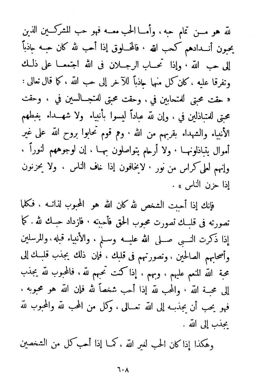لِلَّهِ هُوَ مِنْ تَمَامِ حُبِّهِ وَأَمَّا الْحُبُّ مَعَهُ فَهُوَ حُبُّ الْمُشْرِكِينَ الَّذِينَ يُحِبُّونَ أَنْدَادَهُمْ كَحُبِّ اللَّهِ، فَالْمَخْلُوقُ إذَا أَحَبَّ لِلَّهِ كَانَ حُبُّهُ جَاذِبًا إلَى حُبِّ اللَّهِ وَإِذَا تَحَابَّ الرَّجُلَانِ فِي اللَّهِ اجْتَمَعَا عَلَى ذَلِكَ وَتَفَرَّقَا عَلَيْهِ؛ كَانَ كُلٌّ مِنْهُمَا جَاذِبًا لِلْآخَرِ إلَى حُبّ اللَّهِ كَمَا قَالَ تَعَالَى: {حَقَّتْ مَحَبَّتِي لِلْمُتَحَابِّينَ فِيَّ وَحَقَّتْ مَحَبَّتِي لِلْمُتَجَالِسِينَ فِيَّ وَحَقَّتْ مَحَبَّتِي لِلْمُتَبَاذِلِينَ فِيَّ وَإِنَّ لِلَّهِ عِبَادًا لَيْسُوا بِأَنْبِيَاءِ وَلَا شُهَدَاءَ يَغْبِطُهُمْ الْأَنْبِيَاءُ وَالشُّهَدَاءُ بِقُرْبِهِمْ مِنْ اللَّهِ وَهُمْ قَوْمٌ تَحَابُّوا بِرَوْحِ اللَّهِ عَلَى غَيْرِ أَمْوَالٍ يتباذلونها وَلَا أَرْحَامٍ يَتَوَاصَلُونَ بِهَا إنَّ لِوُجُوهِهِمْ لَنُورًا وَإِنَّهُمْ لَعَلَى كَرَاسٍ مِنْ نُورٍ لَا يَخَافُونَ إذَا خَافَ النَّاسُ وَلَا يَحْزَنُونَ إذَا حَزِنَ النَّاسُ} فَإِنَّك إذَا أَحْبَبْت الشَّخْصَ لِلَّهِ كَانَ اللَّهُ هُوَ الْمَحْبُوبُ لِذَاتِهِ فَكُلَّمَا تَصَوَّرْته فِي قَلْبِك تَصَوَّرْت مَحْبُوبَ الْحَقِّ فَأَحْبَبْته فَازْدَادَ حُبُّك لِلَّهِ. كَمَا إذَا ذَكَرْت النَّبِيَّ صَلَّى اللَّهُ عَلَيْهِ وَسَلَّمَ وَالْأَنْبِيَاءَ قَبْلَهُ وَالْمُرْسَلِينَ وَأَصْحَابَهُمْ الصَّالِحِينَ وَتَصَوَّرْتهمْ فِي قَلْبِك فَإِنَّ ذَلِكَ يَجْذِبُ قَلْبَك إلَى مَحَبَّةِ اللَّهِ الْمُنْعِمِ عَلَيْهِمْ وَبِهِمْ إذَا كُنْت تُحِبُّهُمْ لِلَّهِ فَالْمَحْبُوبُ لِلَّهِ يُجْذَبُ إلَى مَحَبَّةِ اللَّهِ وَالْمُحِبُّ لِلَّهِ إذَا أَحَبّ شَخْصًا لِلَّهِ فَإِنَّ اللَّهَ هُوَ مَحْبُوبُهُ فَهُوَ يُحِبُّ أَنْ يَجْذِبَهُ إلَى اللَّهِ تَعَالَى وَكُلٌّ مِنْ الْمُحِبِّ لِلَّهِ وَالْمَحْبُوبِ لِلَّهِ يُجْذَبُ إلَى اللَّهِ. وَهَكَذَا إذَا كَانَ الْحُبُّ لِغَيْرِ اللَّهِ كَمَا إذَا أَحَبّ كُلٌّ مِنْ الشَّخْصَيْنِ