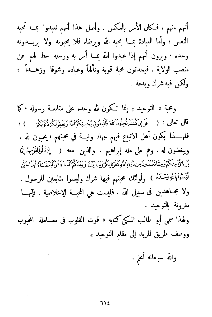 أَنَّهُمْ مِنْهُمْ فَكَانَ الْأَمْرُ بِالْعَكْسِ. وَأَصْلُ هَذَا أَنَّهُمْ تَعَبَّدُوا بِمَا تُحِبُّهُ النَّفْسُ؛ وَأَمَّا الْعِبَادَةُ بِمَا يُحِبُّهُ اللَّهُ وَيَرْضَاهُ فَلَا يُحِبُّونَهُ وَلَا يُرِيدُونَهُ وَحْدَهُ وَيَرَوْنَ أَنَّهُمْ إذَا عَبَدُوا اللَّهَ بِمَا أَمَرَ بِهِ وَرُسُلُهُ حَطَّ لَهُمْ عَنْ مَنْصِبِ الْوِلَايَةِ فَيُحْدِثُونَ مَحَبَّةً قَوِيَّةً وَتَأَلُّهًا وَعِبَادَةً وَشَوْقًا وَزُهْدًا؛ وَلَكِنْ فِيهِ شِرْكٌ وَبِدْعَةٌ. وَمَحَبَّةُ " التَّوْحِيدِ " إنَّمَا تَكُونُ لِلَّهِ وَحْدَهُ عَلَى مُتَابَعَةِ رَسُولِهِ؛ كَمَا قَالَ تَعَالَى: {قُلْ إنْ كُنْتُمْ تُحِبُّونَ اللَّهَ فَاتَّبِعُونِي يُحْبِبْكُمُ اللَّهُ وَيَغْفِرْ لَكُمْ ذُنُوبَكُمْ} فَلِهَذَا يَكُونُ أَهْلُ الِاتِّبَاعِ فِيهِمْ جِهَادٌ وَنِيَّةٌ فِي مَحَبَّتِهِمْ؛ يُحِبُّونَ لِلَّهِ وَيَبْغَضُونَ لَهُ. وَهُمْ عَلَى مِلَّةِ إبْرَاهِيمَ. وَاَلَّذِينَ مَعَهُ {إذْ قَالُوا لِقَوْمِهِمْ إنَّا بُرَآءُ مِنْكُمْ وَمِمَّا تَعْبُدُونَ مِنْ دُونِ اللَّهِ كَفَرْنَا بِكُمْ وَبَدَا بَيْنَنَا وَبَيْنَكُمُ الْعَدَاوَةُ وَالْبَغْضَاءُ أَبَدًا حَتَّى تُؤْمِنُوا بِاللَّهِ وَحْدَهُ} وَأُولَئِكَ مَحَبَّتُهُمْ فِيهَا شِرْكٌ وَلَيْسُوا مُتَابِعِينَ لِلرَّسُولِ وَلَا مُجَاهِدِينَ فِي سَبِيلِ اللَّهِ فَلَيْسَتْ هِيَ الْمَحَبَّةُ الإخلاصية. فَإِنَّهَا مَقْرُونَةٌ بِالتَّوْحِيدِ. وَلِهَذَا سَمَّى أَبُو طَالِبٍ الْمَكِّيُّ كِتَابَهُ " قُوتَ الْقُلُوبِ فِي مُعَامَلَةِ الْمَحْبُوبِ وَوَصْفِ طَرِيقِ الْمُرِيدِ إلَى مَقَامِ التَّوْحِيدِ " وَاَللَّهُ سُبْحَانَهُ أَعْلَمُ.