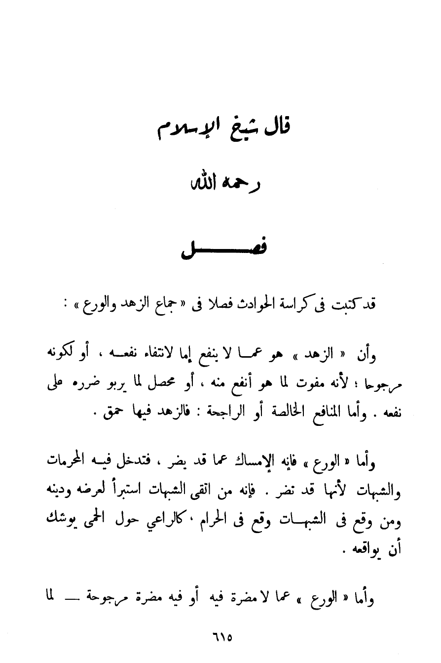 فَصْل قَدْ كَتَبْت فِي كُرَّاسَةِ الْحَوَادِثِ فَصْلًا فِي " جِمَاعِ الزُّهْدِ وَالْوَرَعِ ": وَأَنَّ " الزُّهْدَ " هُوَ عَمَّا لَا يَنْفَعُ إمَّا لِانْتِفَاءِ نَفْعِهِ أَوْ لِكَوْنِهِ مَرْجُوحًا؛ لِأَنَّهُ مُفَوِّتٌ لِمَا هُوَ أَنْفَعُ مِنْهُ أَوْ مُحَصِّلٌ لِمَا يَرْبُو ضَرَرُهُ عَلَى نَفْعِهِ. وَأَمَّا الْمَنَافِعُ الْخَالِصَةُ أَوْ الرَّاجِحَةُ: فَالزُّهْدُ فِيهَا حُمْقٌ. وَأَمَّا " الْوَرَعُ " فَإِنَّهُ الْإِمْسَاكُ عَمَّا قَدْ يَضُرُّ فَتَدْخُلُ فِيهِ الْمُحَرَّمَاتُ وَالشُّبُهَاتُ لِأَنَّهَا قَدْ تَضُرُّ. فَإِنَّهُ مَنْ اتَّقَى الشُّبُهَات اسْتَبْرَأَ لِعِرْضِهِ وَدِينِهِ وَمَنْ وَقَعَ فِي الشُّبُهَات وَقَعَ فِي الْحَرَامِ كَالرَّاعِي حَوْلَ الْحِمَى يُوشِكُ أَنْ يُوَاقِعَهُ. وَأَمَّا " الْوَرَعُ " عَمَّا لَا مَضَرَّةَ فِيهِ أَوْ فِيهِ مَضَرَّةٌ مَرْجُوحَةٌ - لِمَا