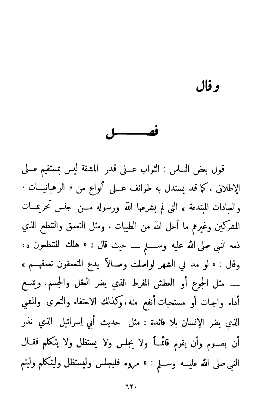 قَوْلُ بَعْضِ النَّاسِ: الثَّوَابُ عَلَى قَدْرِ الْمَشَقَّةِ لَيْسَ بِمُسْتَقِيمِ عَلَى الْإِطْلَاقِ كَمَا قَدْ يَسْتَدِلُّ بِهِ طَوَائِفُ عَلَى أَنْوَاعٍ مِنْ " الرَّهْبَانِيّاتِ وَالْعِبَادَاتِ الْمُبْتَدَعَةِ " الَّتِي لَمْ يَشْرَعْهَا اللَّهُ وَرَسُولُهُ مِنْ جِنْسِ تَحْرِيمَاتِ الْمُشْرِكِينَ وَغَيْرِهِمْ مَا أَحَلَّ اللَّهُ مِنْ الطَّيِّبَاتِ وَمِثْلُ التَّعَمُّقِ وَالتَّنَطُّعِ الَّذِي ذَمَّهُ النَّبِيُّ صَلَّى اللَّهُ عَلَيْهِ وَسَلَّمَ حَيْثُ قَالَ: {هَلَكَ الْمُتَنَطِّعُونَ} وَقَالَ: {لَوْ مُدَّ لِي الشَّهْرُ لَوَاصَلْت وِصَالًا يَدَعُ الْمُتَعَمِّقُونَ تَعَمُّقَهُمْ} - مِثْلُ الْجُوعِ أَوْ الْعَطَشِ الْمُفْرِطِ الَّذِي يَضُرُّ الْعَقْلَ وَالْجِسْمَ وَيَمْنَعُ أَدَاءَ وَاجِبَاتٍ أَوْ مُسْتَحَبَّاتٍ أَنْفَع مِنْهُ وَكَذَلِكَ الِاحْتِفَاءُ وَالتَّعَرِّي وَالْمَشْيُ الَّذِي يَضُرُّ الْإِنْسَانَ بِلَا فَائِدَةٍ: مِثْلُ {حَدِيثِ أَبِي إسْرَائِيلَ الَّذِي نَذَرَ أَنْ يَصُومَ وَأَنْ يَقُومَ قَائِمًا وَلَا يَجْلِسُ وَلَا يَسْتَظِلُّ وَلَا يَتَكَلَّمُ فَقَالَ النَّبِيُّ صَلَّى اللَّهُ عَلَيْهِ وَسَلَّمَ مُرُوهُ فَلْيَجْلِسْ وَلْيَسْتَظِلَّ وَلْيَتَكَلَّمْ وَلْيُتِمَّ