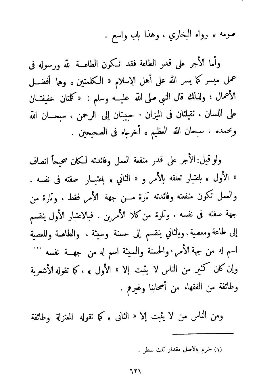 صَوْمَهُ} رَوَاهُ الْبُخَارِيُّ. وَهَذَا بَابٌ وَاسِعٌ. وَأَمَّا الْأَجْرُ عَلَى قَدْرِ الطَّاعَةِ فَقَدْ تَكُونُ الطَّاعَةُ لِلَّهِ وَرَسُولِهِ فِي عَمَلٍ مُيَسَّرٍ كَمَا يَسَّرَ اللَّهُ عَلَى أَهْلِ الْإِسْلَامِ " الْكَلِمَتَيْنِ " وَهُمَا أَفْضَلُ الْأَعْمَالِ؛ وَلِذَلِكَ قَالَ النَّبِيُّ صَلَّى اللَّهُ عَلَيْهِ وَسَلَّمَ {كَلِمَتَانِ خَفِيفَتَانِ عَلَى اللِّسَانِ ثَقِيلَتَانِ فِي الْمِيزَانِ حَبِيبَتَانِ إلَى الرَّحْمَنِ سُبْحَانَ اللَّهِ وَبِحَمْدِهِ سُبْحَانَ اللَّهِ الْعَظِيمِ} أَخْرَجَاهُ فِي الصَّحِيحَيْنِ. وَلَوْ قِيلَ: الْأَجْرُ عَلَى قَدْرِ مَنْفَعَةِ الْعَمَلِ وَفَائِدَتِهِ لَكَانَ صَحِيحًا اتِّصَافُ " الْأَوَّلِ " بِاعْتِبَارِ تَعَلُّقِهِ بِالْأَمْرِ. وَ " الثَّانِي " بِاعْتِبَارِ صِفَتِهِ فِي نَفْسِهِ. وَالْعَمَلُ تَكُونُ مَنْفَعَتُهُ وَفَائِدَتُهُ تَارَةً مِنْ جِهَةِ الْأَمْرِ فَقَطْ وَتَارَةً مِنْ جِهَةِ صِفَتِهِ فِي نَفْسِهِ وَتَارَةً مِنْ كِلَا الْأَمْرَيْنِ. فَبِالِاعْتِبَارِ الْأَوَّلِ يَنْقَسِمُ إلَى طَاعَةٍ وَمَعْصِيَةٍ وَبِالثَّانِي يَنْقَسِمُ إلَى حَسَنَةٍ وَسَيِّئَةٍ، وَالطَّاعَةُ وَالْمَعْصِيَةُ اسْمٌ لَهُ مِنْ جِهَةِ الْأَمْرِ وَالْحَسَنَةُ وَالسَّيِّئَةُ اسْمٌ لَهُ مِنْ جِهَةِ نَفْسِهِ. . . (1) وَإِنْ كَانَ كَثِيرٌ مِنْ النَّاسِ لَا يُثْبِتُ إلَّا " الْأَوَّلَ " كَمَا تَقُولُهُ الْأَشْعَرِيَّةُ وَطَائِفَةٌ مِنْ الْفُقَهَاءِ مِنْ أَصْحَابِنَا وَغَيْرِهِمْ. وَمِنْ النَّاسِ مَنْ لَا يُثْبِتُ إلَّا " الثَّانِيَ " كَمَا تَقُولُهُ الْمُعْتَزِلَةُ وَطَائِفَةٌ