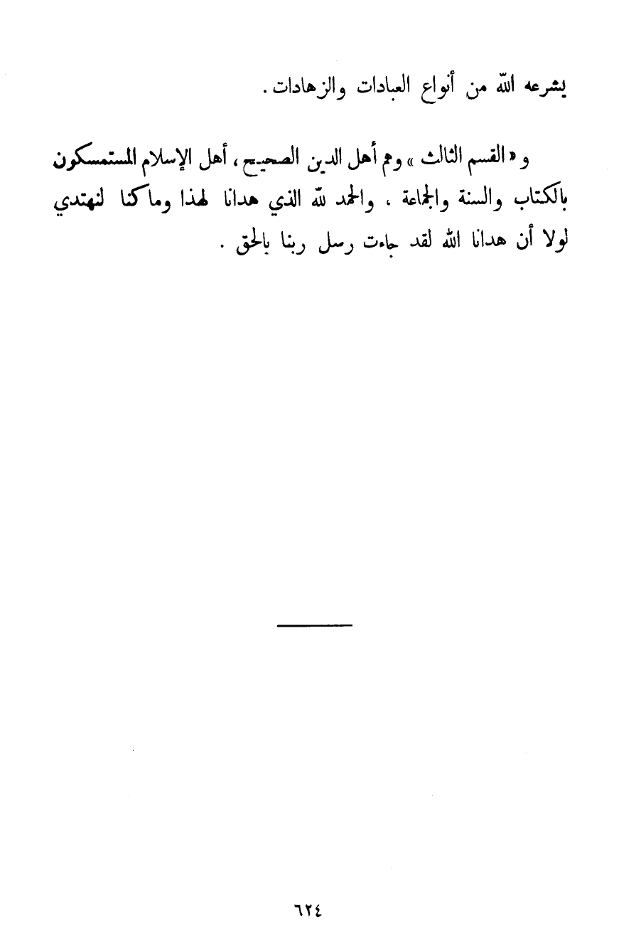 يُشَرِّعْهُ اللَّهُ مِنْ أَنْوَاعِ الْعِبَادَاتِ والزهادات. وَ " الْقِسْمُ الثَّالِثُ " وَهُمْ أَهْلُ الدِّينِ الصَّحِيحِ أَهْلُ الْإِسْلَامِ الْمُسْتَمْسِكُونَ بِالْكِتَابِ وَالسُّنَّةِ وَالْجَمَاعَةِ وَالْحَمْدُ لِلَّهِ الَّذِي هَدَانَا لِهَذَا وَمَا كُنَّا لِنَهْتَدِيَ لَوْلَا أَنْ هَدَانَا اللَّهُ لَقَدْ جَاءَتْ رُسُلُ رَبِّنَا بِالْحَقِّ.