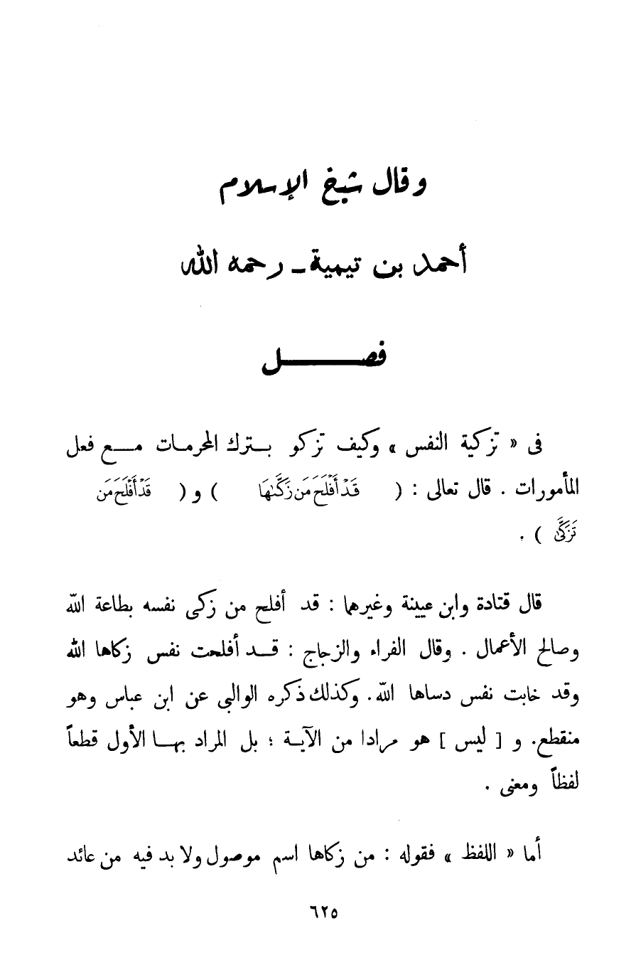 قَالَ تَعَالَى: {قَدْ أَفْلَحَ مَنْ زَكَّاهَا} و {قَدْ أَفْلَحَ مَنْ تَزَكَّى} . قَالَ قتادة وَابْنُ عُيَيْنَة وَغَيْرُهُمَا: قَدْ أَفْلَحَ مَنْ زَكَّى نَفْسَهُ بِطَاعَةِ اللَّهِ وَصَالِحِ الْأَعْمَالِ. وَقَالَ الْفَرَّاءُ وَالزَّجَّاجُ: قَدْ أَفْلَحَتْ نَفْسٌ زَكَّاهَا اللَّهُ وَقَدْ خَابَتْ نَفْسٌ دَسَّاهَا اللَّهُ. وَكَذَلِكَ ذَكَرَهُ الوالبي عَنْ ابْنِ عَبَّاسٍ وَهُوَ مُنْقَطِعٌ. وَلَيْسَ هُوَ مُرَادُ الْآيَةِ (1) ؛ بَلْ الْمُرَادُ بِهَا الْأَوَّلُ قَطْعًا لَفْظًا وَمَعْنًى. أَمَّا " اللَّفْظُ " فَقَوْلُهُ: مَنْ زَكَّاهَا اسْمٌ مَوْصُولٌ وَلَا بُدَّ فِيهِ مِنْ عَائِدٍ