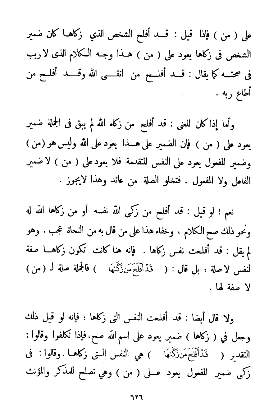 عَلَى مَنْ فَإِذَا قِيلَ: قَدْ أَفْلَحَ الشَّخْصُ الَّذِي زَكَّاهَا كَانَ ضَمِيرُ الشَّخْصِ فِي زَكَّاهَا يَعُودُ عَلَى (مَنْ) هَذَا وَجْهُ الْكَلَامِ الَّذِي لَا رَيْبَ فِي صِحَّتِهِ كَمَا يُقَالُ: قَدْ أَفْلَحَ مَنْ اتَّقَى اللَّهَ وَقَدْ أَفْلَحَ مَنْ أَطَاعَ رَبَّهُ. وَأَمَّا إذَا كَانَ الْمَعْنَى: قَدْ أَفْلَحَ مَنْ زَكَّاهُ اللَّهُ لَمْ يَبْقَ فِي الْجُمْلَةِ ضَمِيرٌ يَعُودُ عَلَى (مَنْ فَإِنَّ الضَّمِيرَ عَلَى هَذَا يَعُودُ عَلَى اللَّهِ وَلَيْسَ هُوَ (مَنْ) وَضَمِيرُ الْمَفْعُولِ يَعُودُ عَلَى النَّفْسِ الْمُتَقَدِّمَةِ فَلَا يَعُودُ عَلَى (مَنْ) لَا ضَمِيرُ الْفَاعِلِ وَلَا الْمَفْعُولِ. فَتَخْلُو الصِّلَةُ مِنْ عَائِدٍ وَهَذَا لَا يَجُوزُ. نَعَمْ لَوْ قِيلَ: قَدْ أَفْلَحَ مَنْ زَكَّى اللَّهُ نَفْسَهُ أَوْ مَنْ زَكَّاهَا اللَّهُ لَهُ وَنَحْوُ ذَلِكَ صَحَّ الْكَلَامُ وَخَفَاءُ هَذَا عَلَى مَنْ قَالَ بِهِ مِنْ النُّحَاةِ عَجَبٌ. وَهُوَ لَمْ يَقُلْ: قَدْ أَفْلَحَتْ نَفْسٌ زَكَّاهَا. فَإِنَّهُ هنا كانت تَكُونُ زَكَّاهَا صِفَةً لِنَفْسِ لَا صِلَةً؛ بَلْ قَالَ: {قَدْ أَفْلَحَ مَنْ زَكَّاهَا} فَالْجُمْلَةُ صِلَةٌ لِـ (مَنْ) لَا صِفَةَ لَهَا. وَلَا قَالَ أَيْضًا: قَدْ أَفْلَحَتْ النَّفْسُ الَّتِي زَكَّاهَا؛ فَإِنَّهُ لَوْ قِيلَ ذَلِكَ وَجُعِلَ فِي زَكَّاهَا ضَمِيرٌ يَعُودُ عَلَى اسْمِ اللَّهِ صَحَّ فَإِذَا تَكَلَّفُوا وَقَالُوا: التَّقْدِيرُ {قَدْ أَفْلَحَ مَنْ زَكَّاهَا} هِيَ النَّفْسُ الَّتِي زَكَّاهَا. وَقَالُوا: فِي زَكَّى ضَمِيرُ الْمَفْعُولِ يَعُودُ عَلَى (مَنْ وَهِيَ تَصْلُحُ لِلْمُذَكَّرِ وَالْمُؤَنَّثِ