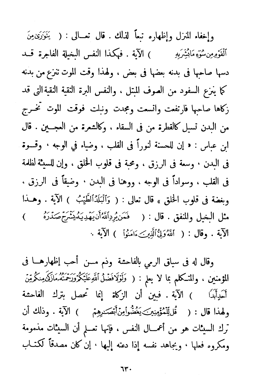 وَإِخْفَاءُ الْمَنْزِلِ وَإِظْهَارُهُ تَبَعًا لِذَلِكَ. قَالَ تَعَالَى: {يَتَوَارَى مِنَ الْقَوْمِ مِنْ سُوءِ مَا بُشِّرَ بِهِ} الْآيَةَ. فَهَكَذَا النَّفْسُ الْبَخِيلَةُ الْفَاجِرَةُ قَدْ دَسَّهَا صَاحِبُهَا فِي بَدَنِهِ بَعْضِهَا فِي بَعْضٍ وَلِهَذَا وَقْتَ الْمَوْتِ تُنْزَعُ مِنْ بَدَنِهِ كَمَا يُنْزَعُ السَّفُّودُ مِنْ الصُّوفِ الْمُبْتَلِّ وَالنَّفْسُ الْبَرَّةُ التَّقِيَّةُ النَّقِيَّةُ الَّتِي قَدْ زَكَّاهَا صَاحِبُهَا فَارْتَفَعَتْ وَاتَّسَعَتْ وَمَجَّدَتْ وَنَبُلَتْ فَوَقْتَ الْمَوْتِ تَخْرُجُ مِنْ الْبَدَنِ تَسِيلُ كَالْقَطْرَةِ مِنْ فِي السِّقَاءِ وَكَالشَّعْرَةِ مِنْ الْعَجِينِ. قَالَ ابْنُ عَبَّاسٍ: " إنَّ لِلْحَسَنَةِ لَنُورًا فِي الْقَلْبِ وَضِيَاءً فِي الْوَجْهِ وَقُوَّةً فِي الْبَدَنِ وَسَعَةً فِي الرِّزْقِ وَمَحَبَّةً فِي قُلُوبِ الْخَلْقِ وَإِنَّ لِلسَّيِّئَةِ لَظُلْمَةً فِي الْقَلْبِ وَسَوَادًا فِي الْوَجْهِ وَوَهَنًا فِي الْبَدَنِ وَضِيقًا فِي الرِّزْقِ وبغضة فِي قُلُوبِ الْخَلْقِ " قَالَ تَعَالَى: {وَالْبَلَدُ الطَّيِّبُ} الْآيَةَ. وَهَذَا مَثَلُ الْبَخِيلِ وَالْمُنْفِقِ. قَالَ: {فَمَنْ يُرِدِ اللَّهُ أَنْ يَهدِيَهُ يَشْرَحْ صَدْرَهُ} الْآيَةَ. وَقَالَ: {اللَّهُ وَلِيُّ الَّذِينَ آمَنُوا} الْآيَةَ. وَقَالَ لَهُ فِي سِيَاقِ الرَّمْيِ بِالْفَاحِشَةِ وَذَمِّ مَنْ أَحَبّ إظْهَارَهَا فِي الْمُؤْمِنِينَ وَالْمُتَكَلِّمِ بِمَا لَا يَعْلَمُ: {وَلَوْلَا فَضْلُ اللَّهِ عَلَيْكُمْ وَرَحْمَتُهُ مَا زَكَا مِنْكُمْ مِنْ أَحَدٍ أَبَدًا} الْآيَةَ. فَبَيَّنَ أَنَّ الزَّكَاةَ إنَّمَا تَحْصُلُ بِتَرْكِ الْفَاحِشَةِ وَلِهَذَا قَالَ: {قُلْ لِلْمُؤْمِنِينَ يَغُضُّوا مِنْ أَبْصَارِهِمْ} الْآيَةَ. وَذَلِكَ أَنَّ تَرْكَ السَّيِّئَاتِ هُوَ مِنْ أَعْمَالِ النَّفْسِ فَإِنَّهَا تَعْلَمُ أَنَّ السَّيِّئَاتِ مَذْمُومَةٌ وَمَكْرُوهٌ فِعْلُهَا وَيُجَاهِدُ نَفْسَهُ إذَا دَعَتْهُ إلَيْهَا إنْ كَانَ مُصَدِّقًا لِكِتَابِ