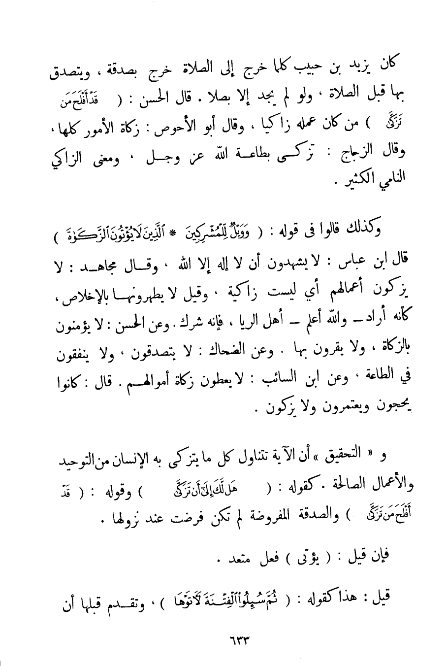 كَانَ يَزِيدُ بْنُ حَبِيبٍ كُلَّمَا خَرَجَ إلَى الصَّلَاةِ خَرَجَ بِصَدَقَةِ وَيَتَصَدَّقُ بِهَا قَبْلَ الصَّلَاةِ وَلَوْ لَمْ يَجِدْ إلَّا بَصَلًا. قَالَ الْحَسَنُ: {قَدْ أَفْلَحَ مَنْ تَزَكَّى} مَنْ كَانَ عَمَلُهُ زَاكِيًا وَقَالَ أَبُو الْأَحْوَصِ: زَكَاةُ الْأُمُورِ كُلِّهَا وَقَالَ الزَّجَّاجُ: تَزَكَّى بِطَاعَةِ اللَّهِ عَزَّ وَجَلَّ وَمَعْنَى الزَّاكِي النَّامِي الْكَثِيرُ. وَكَذَلِكَ قَالُوا فِي قَوْلِهِ: {وَوَيْلٌ لِلْمُشْرِكِينَ} {الَّذِينَ لَا يُؤْتُونَ الزَّكَاةَ} قَالَ ابْنُ عَبَّاسٍ: لَا يَشْهَدُونَ أَنْ لَا إلَهَ إلَّا اللَّهُ وَقَالَ مُجَاهِدٌ: لَا يُزَكُّونَ أَعْمَالَهُمْ أَيْ لَيْسَتْ زَاكِيَةً وَقِيلَ لَا يُطَهِّرُونَهَا بِالْإِخْلَاصِ كَأَنَّهُ أَرَادَ - وَاَللَّهُ أَعْلَم - أَهْلَ الرِّيَاءِ فَإِنَّهُ شِرْكٌ. وَعَنْ الْحَسَنِ: لَا يُؤْمِنُونَ بِالزَّكَاةِ وَلَا يُقِرُّونَ بِهَا. وَعَنْ الضَّحَّاكِ: لَا يَتَصَدَّقُونَ وَلَا يُنْفِقُونَ فِي الطَّاعَةِ وَعَنْ ابْنِ السَّائِبِ: لَا يُعْطُونَ زَكَاةَ أَمْوَالِهِمْ. قَالَ: كَانُوا يَحُجُّونَ وَيَعْتَمِرُونَ وَلَا يُزَكُّونَ. وَ " التَّحْقِيقُ " أَنَّ الْآيَةَ تَتَنَاوَلُ كُلَّ مَا يَتَزَكَّى بِهِ الْإِنْسَانُ مِنْ التَّوْحِيدِ وَالْأَعْمَالِ الصَّالِحَةِ. كَقَوْلِهِ: {هَلْ لَكَ إلَى أَنْ تَزَكَّى} وَقَوْلُهُ: {قَدْ أَفْلَحَ مَنْ تَزَكَّى} وَالصَّدَقَةُ الْمَفْرُوضَةُ لَمْ تَكُنْ فُرِضَتْ عِنْدَ نُزُولِهَا. فَإِنْ قِيلَ: (يُؤْتَى فِعْلٌ مُتَعَدٍّ. قِيلَ: هَذَا كَقَوْلِهِ: {ثُمَّ سُئِلُوا الْفِتْنَةَ لَآتَوْهَا} وَتَقَدَّمَ قَبْلَهَا أَنَّ