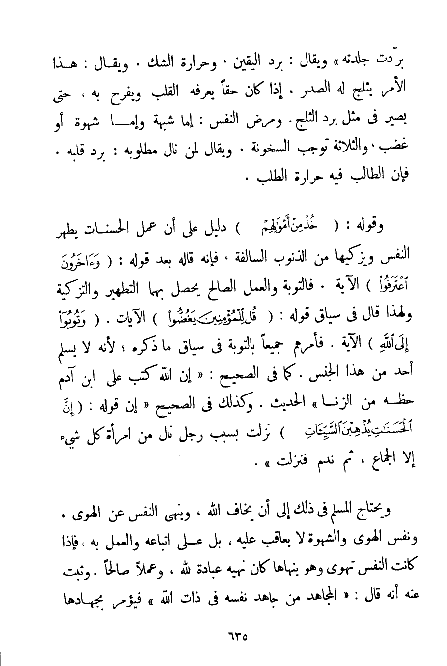 بَرَّدْت جِلْدَتَهُ} وَيُقَالُ: بَرْدُ الْيَقِينِ وَحَرَارَةُ الشَّكِّ. وَيُقَالُ: هَذَا الْأَمْرُ يُثْلَجُ لَهُ الصَّدْرُ إذَا كَانَ حَقًّا يَعْرِفُهُ الْقَلْبُ وَيَفْرَحُ بِهِ حَتَّى يَصِيرَ فِي مِثْلِ بَرْدِ الثَّلْجِ. وَمَرَضُ النَّفْسِ: إمَّا شُبْهَةٌ وَإِمَّا شَهْوَةٌ أَوْ غَضَبٌ وَالثَّلَاثَةُ تُوجِبُ السُّخُونَةَ. وَيُقَالُ لِمَنْ نَالَ مَطْلُوبَهُ: بَرَدَ قَلْبُهُ. فَإِنَّ الطَّالِبَ فِيهِ حَرَارَةُ الطَّلَبِ. وَقَوْلُهُ: {خُذْ مِنْ أَمْوَالِهِمْ} دَلِيلٌ عَلَى أَنَّ عَمَلَ الْحَسَنَاتِ يُطَهِّرُ النَّفْسَ وَيُزَكِّيهَا مِنْ الذُّنُوبِ السَّالِفَةِ فَإِنَّهُ قَالَهُ بَعْدَ قَوْلِهِ: {وَآخَرُونَ اعْتَرَفُوا} الْآيَةَ. فَالتَّوْبَةُ وَالْعَمَلُ الصَّالِحُ يَحْصُلُ بِهِمَا التَّطْهِيرُ وَالتَّزْكِيَةُ وَلِهَذَا قَالَ فِي سِيَاقِ قَوْلِهِ. {قُلْ لِلْمُؤْمِنِينَ يَغُضُّوا} الْآيَاتِ. {وَتُوبُوا إلَى اللَّهِ} الْآيَةَ. فَأَمَرَهُمْ جَمِيعًا بِالتَّوْبَةِ فِي سِيَاقِ مَا ذَكَرَهُ؛ لِأَنَّهُ لَا يَسْلَمُ أَحَدٌ مِنْ هَذَا الْجِنْسِ. كَمَا فِي الصَّحِيحِ: {إنَّ اللَّهَ كَتَبَ عَلَى ابْنِ آدَمَ حَظَّهُ مِنْ الزِّنَا} الْحَدِيثَ. وَكَذَلِكَ فِي الصَّحِيحِ إنَّ قَوْلَهُ: {إنَّ الْحَسَنَاتِ يُذْهِبْنَ السَّيِّئَاتِ} نَزَلَتْ بِسَبَبِ رَجُلٍ نَالَ مِنْ امْرَأَةٍ كُلَّ شَيْءٍ إلَّا الْجِمَاعَ ثُمَّ نَدِمَ فَنَزَلَتْ} وَيَحْتَاجُ الْمُسْلِمُ فِي ذَلِكَ إلَى أَنْ يَخَافَ اللَّهَ وَيَنْهَى النَّفْسَ عَنْ الْهَوَى وَنَفْسُ الْهَوَى وَالشَّهْوَةِ لَا يُعَاقَبُ عَلَيْهِ بَلْ عَلَى اتِّبَاعِهِ وَالْعَمَلِ بِهِ فَإِذَا كَانَتْ النَّفْسُ تَهْوَى وَهُوَ يَنْهَاهَا كَانَ نَهْيُهُ عِبَادَةً لِلَّهِ وَعَمَلًا صَالِحًا. وَثَبَتَ عَنْهُ أَنَّهُ قَالَ: {الْمُجَاهِدُ مَنْ جَاهَدَ نَفْسَهُ فِي ذَاتِ اللَّهِ} فَيُؤْمَرُ بِجِهَادِهَا