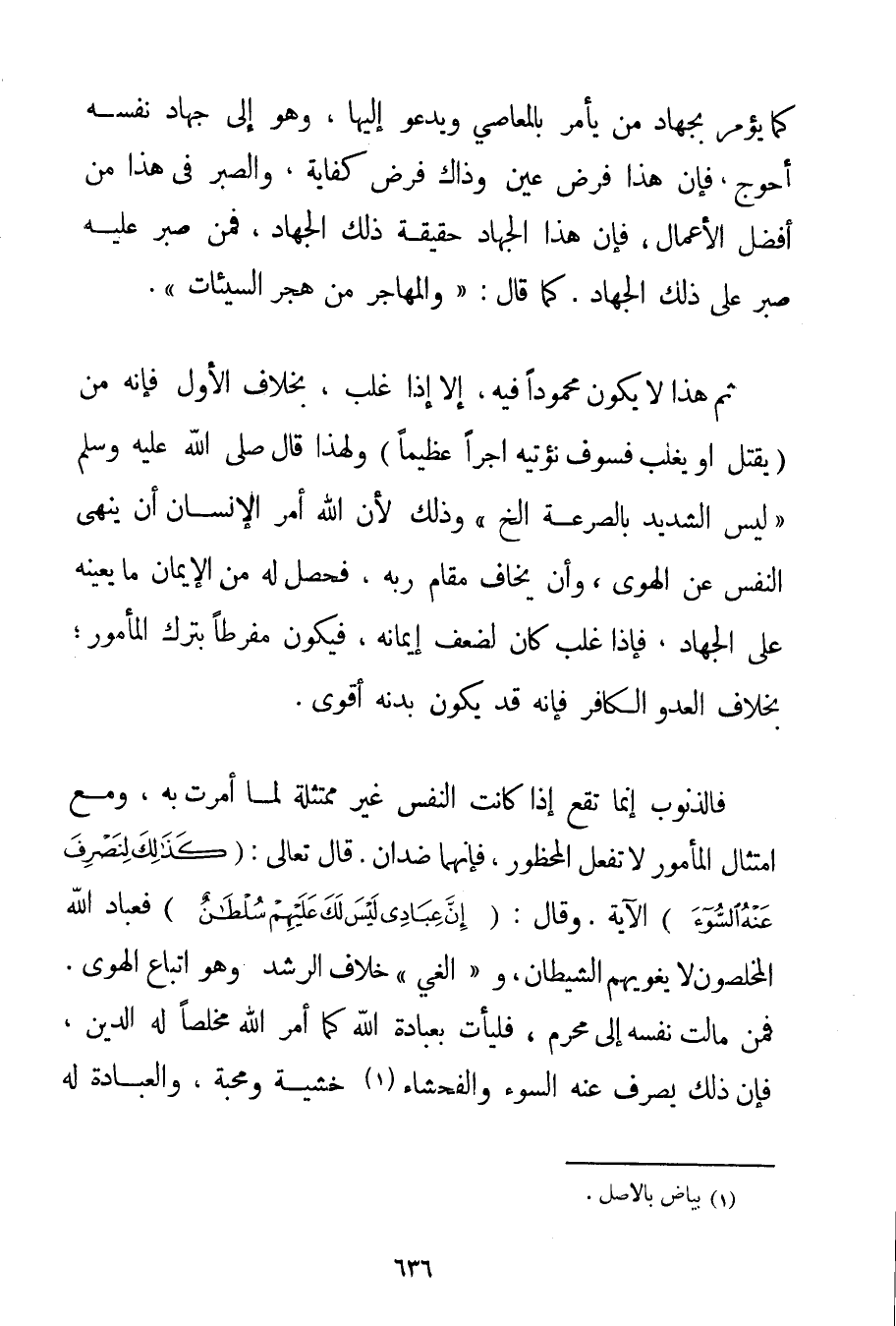 كَمَا يُؤْمَرُ بِجِهَادِ مَنْ يَأْمُرُ بِالْمَعَاصِي وَيَدْعُو إلَيْهَا وَهُوَ إلَى جِهَادِ نَفْسِهِ أَحْوَجُ فَإِنَّ هَذَا فَرْضُ عَيْنٍ وَذَاكَ فَرْضُ كِفَايَةٍ وَالصَّبْرُ فِي هَذَا مِنْ أَفْضَلِ الْأَعْمَالِ فَإِنَّ هَذَا الْجِهَادَ حَقِيقَةُ ذَلِكَ الْجِهَادِ فَمَنْ صَبَرَ عَلَيْهِ صَبَرَ عَلَى ذَلِكَ الْجِهَادِ. كَمَا قَالَ: {وَالْمُهَاجِرُ مَنْ هَجَرَ السَّيِّئَاتِ} . ثُمَّ هَذَا لَا يَكُونُ مَحْمُودًا فِيهِ إلَّا إذَا غَلَبَ بِخِلَافِ الْأَوَّلِ فَإِنَّهُ مَنْ يُقْتَلْ أَوْ يَغْلِبْ فَسَوْفَ نُؤْتِيهِ أَجْرًا عَظِيمًا} وَلِهَذَا قَالَ صَلَّى اللَّهُ عَلَيْهِ وَسَلَّمَ {لَيْسَ الشَّدِيدُ بِالصُّرَعَةِ} إلَخْ " وَذَلِكَ لِأَنَّ اللَّهَ أَمَرَ الْإِنْسَانَ أَنْ يَنْهَى النَّفْسَ عَنْ الْهَوَى وَأَنْ يَخَافَ مَقَامَ رَبِّهِ فَحَصَلَ لَهُ مِنْ الْإِيمَانِ مَا يُعِينُهُ عَلَى الْجِهَادِ فَإِذَا غَلَبَ كَانَ لِضَعْفِ إيمَانِهِ فَيَكُونُ مُفَرِّطًا بِتَرْكِ الْمَأْمُورِ؛ بِخِلَافِ الْعَدُوِّ الْكَافِرِ فَإِنَّهُ قَدْ يَكُونُ بَدَنُهُ أَقْوَى فَالذُّنُوبُ إنَّمَا تَقَعُ إذَا كَانَتْ النَّفْسُ غَيْرَ مُمْتَثِلَةٍ لِمَا أُمِرَتْ بِهِ وَمَعَ امْتِثَالِ الْمَأْمُورِ لَا تَفْعَلُ الْمَحْظُورَ فَإِنَّهُمَا ضِدَّانِ. قَالَ تَعَالَى: {كَذَلِكَ لِنَصْرِفَ عَنْهُ السُّوءَ} الْآيَةَ. وَقَالَ: صَلَّى اللَّهُ عَلَيْهِ وَسَلَّمَ {إنَّ عِبَادِي لَيْسَ لَكَ عَلَيْهِمْ سُلْطَانٌ} فَعِبَادُ اللَّهِ الْمُخْلِصُونَ لَا يُغْوِيهِمْ الشَّيْطَانُ وَ " الْغَيُّ " خِلَافُ الرُّشْدِ وَهُوَ اتِّبَاعُ الْهَوَى. فَمَنْ مَالَتْ نَفْسُهُ إلَى مُحَرَّمٍ فَلْيَأْتِ بِعِبَادَةِ اللَّهِ كَمَا أَمَرَ اللَّهُ مُخْلِصًا لَهُ الدِّينَ فَإِنَّ ذَلِكَ يَصْرِفُ عَنْهُ السُّوءَ وَالْفَحْشَاءَ. . . (1) خَشْيَةً وَمَحَبَّةً وَالْعِبَادَةُ لَهُ