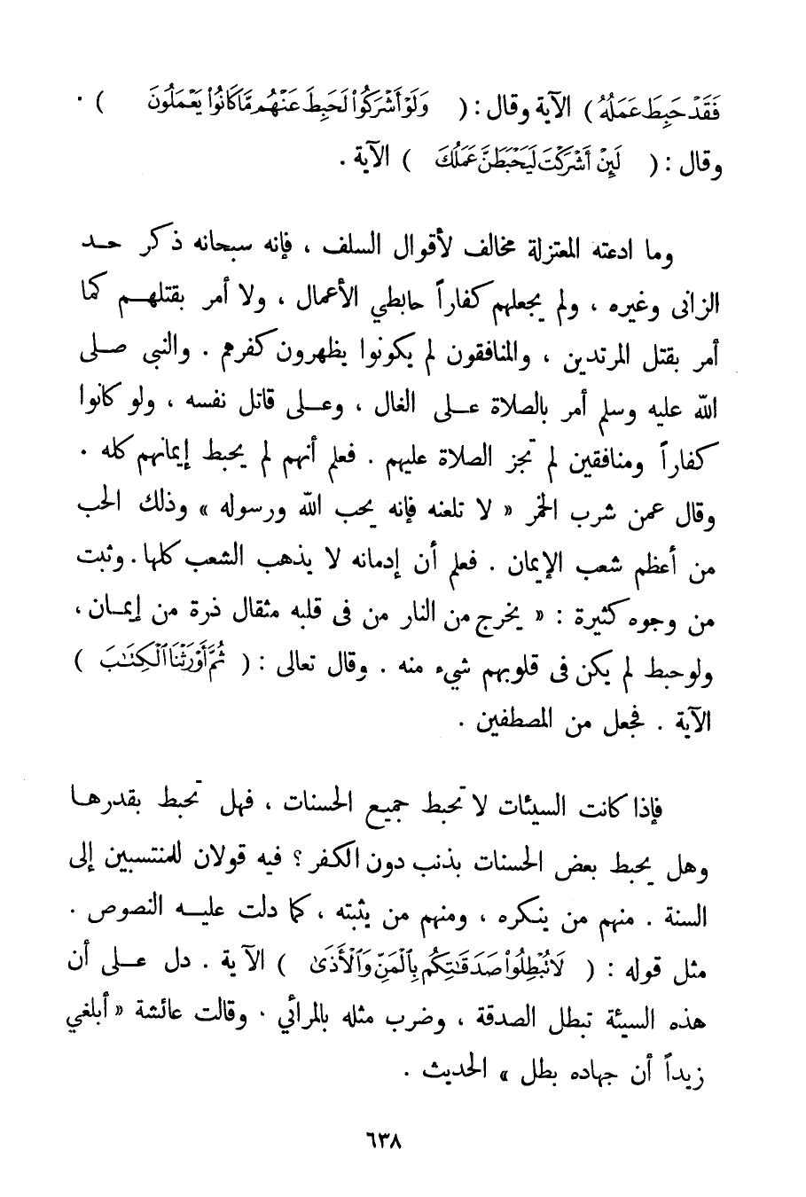 فَقَدْ حَبِطَ عَمَلُهُ} الْآيَةَ وَقَالَ: {وَلَوْ أَشْرَكُوا لَحَبِطَ عَنْهُمْ مَا كَانُوا يَعْمَلُونَ} . وَقَالَ: {لَئِنْ أَشْرَكْتَ لَيَحْبَطَنَّ عَمَلُكَ} الْآيَةَ. وَمَا ادَّعَتْهُ الْمُعْتَزِلَةُ مُخَالِفٌ لِأَقْوَالِ السَّلَفِ فَإِنَّهُ سُبْحَانَهُ ذَكَرَ حَدَّ الزَّانِي وَغَيْرِهِ وَلَمْ يَجْعَلْهُمْ كُفَّارًا حَابِطِي الْأَعْمَالِ وَلَا أَمَرَ بِقَتْلِهِمْ كَمَا أَمَرَ بِقَتْلِ الْمُرْتَدِّينَ وَالْمُنَافِقُونَ لَمْ يَكُونُوا يُظْهِرُونَ كُفْرَهُمْ. وَالنَّبِيُّ صَلَّى اللَّهُ عَلَيْهِ وَسَلَّمَ أَمَرَ بِالصَّلَاةِ عَلَى الْغَالِّ وَعَلَى قَاتِلِ نَفْسِهِ وَلَوْ كَانُوا كُفَّارًا وَمُنَافِقِينَ لَمْ تَجُزْ الصَّلَاةُ عَلَيْهِمْ. فَعُلِمَ أَنَّهُمْ لَمْ يُحْبَطْ إيمَانُهُمْ كُلُّهُ. {وَقَالَ عَمَّنْ شَرِبَ الْخَمْرَ لَا تَلْعَنْهُ فَإِنَّهُ يُحِبُّ اللَّهَ وَرَسُولَهُ} وَذَلِكَ الْحُبُّ مِنْ أَعْظَمِ شُعَبِ الْإِيمَانِ. فَعُلِمَ أَنَّ إدْمَانَهُ لَا يُذْهِبُ الشُّعَبَ كُلَّهَا. وَثَبَتَ مِنْ وُجُوهٍ كَثِيرَةٍ: {يَخْرُجُ مِنْ النَّارِ مَنْ فِي قَلْبِهِ مِثْقَالُ ذَرَّةٍ مِنْ إيمَانٍ} وَلَوْ حَبِطَ لَمْ يَكُنْ فِي قُلُوبِهِمْ شَيْءٌ مِنْهُ. وَقَالَ تَعَالَى: {ثُمَّ أَوْرَثْنَا الْكِتَابَ} الْآيَةَ. فَجُعِلَ مِنْ الْمُصْطَفَيْنَ. فَإِذَا كَانَتْ السَّيِّئَاتُ لَا تُحْبِطُ جَمِيعَ الْحَسَنَاتِ فَهَلْ تُحْبَطُ بِقَدْرِهَا وَهَلْ يُحْبَطُ بَعْضُ الْحَسَنَاتِ بِذَنْبِ دُونَ الْكُفْرِ؟ فِيهِ قَوْلَانِ لِلْمُنْتَسِبِينَ إلَى السُّنَّةِ. مِنْهُمْ مَنْ يُنْكِرُهُ وَمِنْهُمْ مَنْ يُثْبِتُهُ كَمَا دَلَّتْ عَلَيْهِ النُّصُوصُ. مِثْلُ قَوْلِهِ: {لَا تُبْطِلُوا صَدَقَاتِكُمْ بِالْمَنِّ وَالْأَذَى} الْآيَةَ. دَلَّ عَلَى أَنَّ هَذِهِ السَّيِّئَةَ تُبْطِلُ الصَّدَقَةَ وَضَرَبَ مَثَلَهُ بِالْمُرَائِي وَقَالَتْ عَائِشَةُ " أَبْلِغِي زَيْدًا أَنَّ جِهَادَهُ بَطَلَ " الْحَدِيثَ.