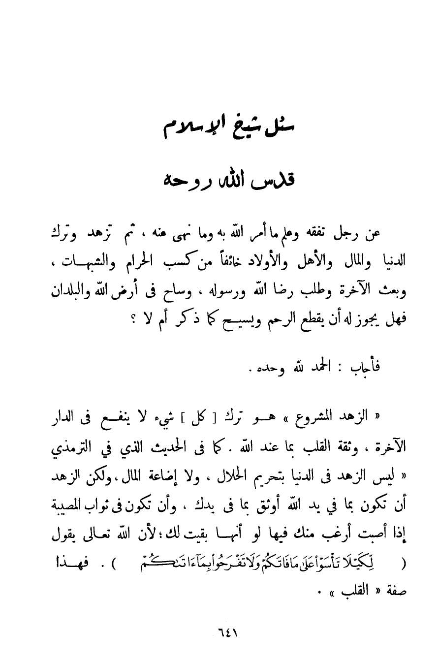 الْحَمْدُ لِلَّهِ وَحْدَهُ، " الزُّهْدُ الْمَشْرُوعُ " هُوَ تَرْكُ كُلِّ شَيْءٍ لَا يَنْفَعُ فِي الدَّارِ الْآخِرَةِ وَثِقَةُ الْقَلْبِ بِمَا عِنْدَ اللَّهِ. كَمَا فِي الْحَدِيثِ الَّذِي فِي التِّرْمِذِيِّ {لَيْسَ الزُّهْدُ فِي الدُّنْيَا بِتَحْرِيمِ الْحَلَالِ وَلَا إضَاعَةِ الْمَالِ وَلَكِنَّ الزُّهْدَ أَنْ تَكُونَ بِمَا فِي يَدِ اللَّهِ أَوْثَقَ بِمَا فِي يَدِك وَأَنْ تَكُونَ فِي ثَوَابِ الْمُصِيبَةِ إذَا أَصَبْت أَرْغَبَ مِنْك فِيهَا لَوْ أَنَّهَا بَقِيَتْ لَك} لَأَنَّ اللَّهَ تَعَالَى يَقُولُ {لِكَيْ لَا تَأْسَوْا عَلَى مَا فَاتَكُمْ وَلَا تَفْرَحُوا بِمَا آتَاكُمْ} . فَهَذَا صِفَةُ " الْقَلْبِ ".