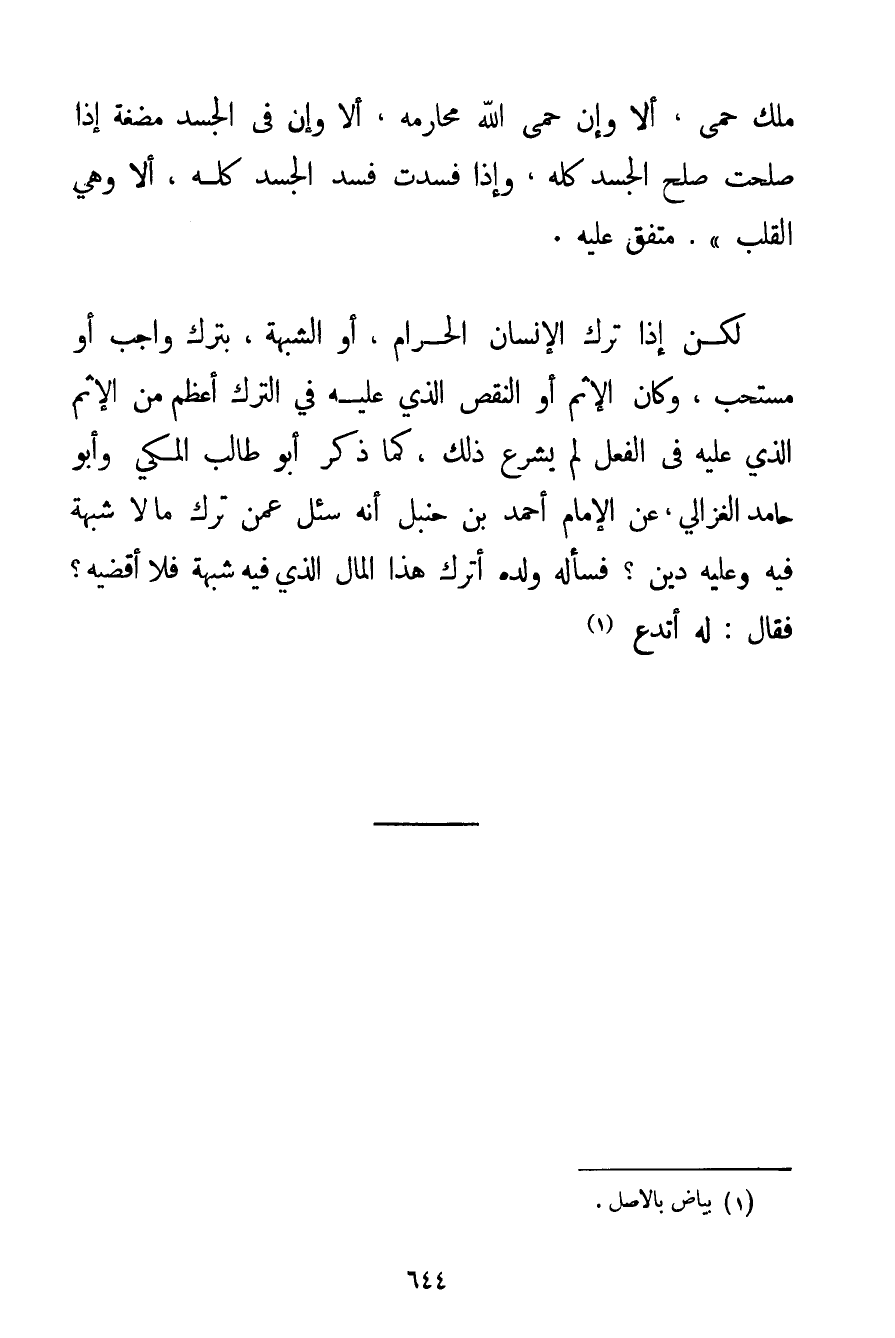 مَلِكٍ حِمًى أَلَا وَإِنَّ حِمَى اللَّهِ مَحَارِمُهُ أَلَا وَإِنَّ فِي الْجَسَدِ مُضْغَةً إذَا صَلَحَتْ صَلَحَ الْجَسَدُ كُلُّهُ وَإِذَا فَسَدَتْ فَسَدَ الْجَسَدُ كُلُّهُ أَلَا وَهِيَ الْقَلْبُ} . مُتَّفَقٌ عَلَيْهِ] (*) .