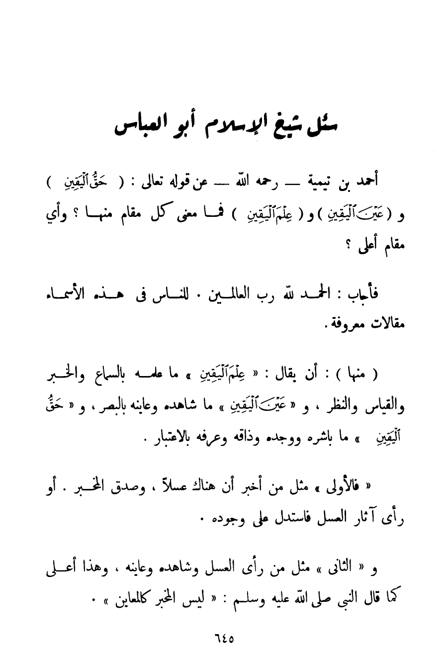 الْحَمْدُ لِلَّهِ رَبِّ الْعَالَمِينَ، لِلنَّاسِ فِي هَذِهِ الْأَسْمَاءِ مَقَالَاتٌ مَعْرُوفَةٌ. (مِنْهَا: أَنْ يُقَالَ: {عِلْمَ الْيَقِينِ} مَا عَلِمَهُ بِالسَّمَاعِ وَالْخَبَرِ وَالْقِيَاسِ وَالنَّظَرِ وَ {عَيْنَ الْيَقِينِ} مَا شَاهَدَهُ وَعَايَنَهُ بِالْبَصَرِ وَ {حَقُّ الْيَقِينِ} مَا بَاشَرَهُ وَوَجَدَهُ وَذَاقَهُ وَعَرَفَهُ بِالِاعْتِبَارِ. " فَالْأُولَى " مِثْلُ مَنْ أَخْبَرَ أَنَّ هُنَاكَ عَسَلًا وَصَدَّقَ الْمُخْبِرَ. أَوْ رَأَى آثَارَ الْعَسَلِ فَاسْتَدَلَّ عَلَى وُجُودِهِ. وَ " الثَّانِي " مِثْلُ مَنْ رَأَى الْعَسَلَ وَشَاهَدَهُ وَعَايَنَهُ وَهَذَا أَعْلَى كَمَا قَالَ النَّبِيُّ صَلَّى اللَّهُ عَلَيْهِ وَسَلَّمَ {لَيْسَ الْمُخْبِرُ كَالْمُعَايِنِ} .