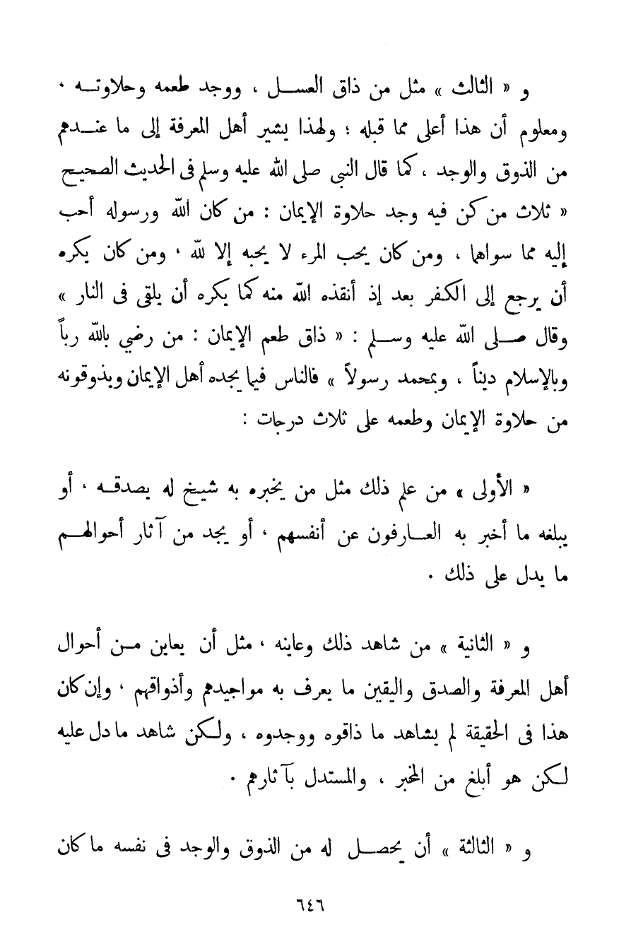 وَ " الثَّالِثُ " مِثْلُ مَنْ ذَاقَ الْعَسَلَ وَوَجَدَ طَعْمَهُ وَحَلَاوَتَهُ وَمَعْلُومٌ أَنَّ هَذَا أَعْلَى مِمَّا قَبْلَهُ؛ وَلِهَذَا يُشِيرُ أَهْلُ الْمَعْرِفَةِ إلَى مَا عِنْدَهُمْ مِنْ الذَّوْقِ وَالْوَجْدِ كَمَا قَالَ النَّبِيُّ صَلَّى اللَّهُ عَلَيْهِ وَسَلَّمَ فِي الْحَدِيثِ الصَّحِيحِ {ثَلَاثٌ مَنْ كُنَّ فِيهِ وَجَدَ حَلَاوَةَ الْإِيمَانِ: مَنْ كَانَ اللَّهُ وَرَسُولُهُ أَحَبّ إلَيْهِ مِمَّا سِوَاهُمَا وَمَنْ كَانَ يُحِبُّ الْمَرْءَ لَا يُحِبُّهُ إلَّا لِلَّهِ وَمَنْ كَانَ يَكْرَهُ أَنْ يَرْجِعَ إلَى الْكُفْرِ بَعْدَ إذْ أَنْقَذَهُ اللَّهُ مِنْهُ كَمَا يَكْرَهُ أَنْ يُلْقَى فِي النَّارِ} وَقَالَ صَلَّى اللَّهُ عَلَيْهِ وَسَلَّمَ {ذَاقَ طَعْمَ الْإِيمَانِ: مَنْ رَضِيَ بِاَللَّهِ رَبًّا وَبِالْإِسْلَامِ دِينًا وَبِمُحَمَّدِ رَسُولًا} فَالنَّاسُ فِيمَا يَجِدُهُ أَهْلُ الْإِيمَانِ وَيَذُوقُونَهُ مِنْ حَلَاوَةِ الْإِيمَانِ وَطَعْمُهُ عَلَى ثَلَاثِ دَرَجَاتٍ: " الْأُولَى " مَنْ عَلِمَ ذَلِكَ مِثْلُ مَنْ يُخْبِرُهُ بِهِ شَيْخٌ لَهُ يُصَدِّقُهُ أَوْ يُبَلِّغُهُ مَا أَخْبَرَ بِهِ الْعَارِفُونَ عَنْ أَنْفُسِهِمْ أَوْ يَجِدُ مِنْ آثَارِ أَحْوَالِهِمْ مَا يَدُلُّ عَلَى ذَلِكَ. وَ " الثَّانِيَةُ " مَنْ شَاهَدَ ذَلِكَ وَعَايَنَهُ مِثْلُ أَنْ يُعَايِنَ مِنْ أَحْوَالِ أَهْلِ الْمَعْرِفَةِ وَالصِّدْقِ وَالْيَقِينِ مَا يَعْرِفُ بِهِ مَوَاجِيدَهُمْ وَأَذْوَاقَهُمْ وَإِنْ كَانَ هَذَا فِي الْحَقِيقَةِ لَمْ يُشَاهِدْ مَا ذَاقُوهُ وَوَجَدُوهُ وَلَكِنْ شَاهَدَ مَا دَلَّ عَلَيْهِ لَكِنْ هُوَ أَبْلَغُ مِنْ الْمُخْبِرِ وَالْمُسْتَدِلِّ بِآثَارِهِمْ. وَ " الثَّالِثَةُ " أَنْ يَحْصُلَ لَهُ مِنْ الذَّوْقِ وَالْوَجْدِ فِي نَفْسِهِ مَا كَانَ