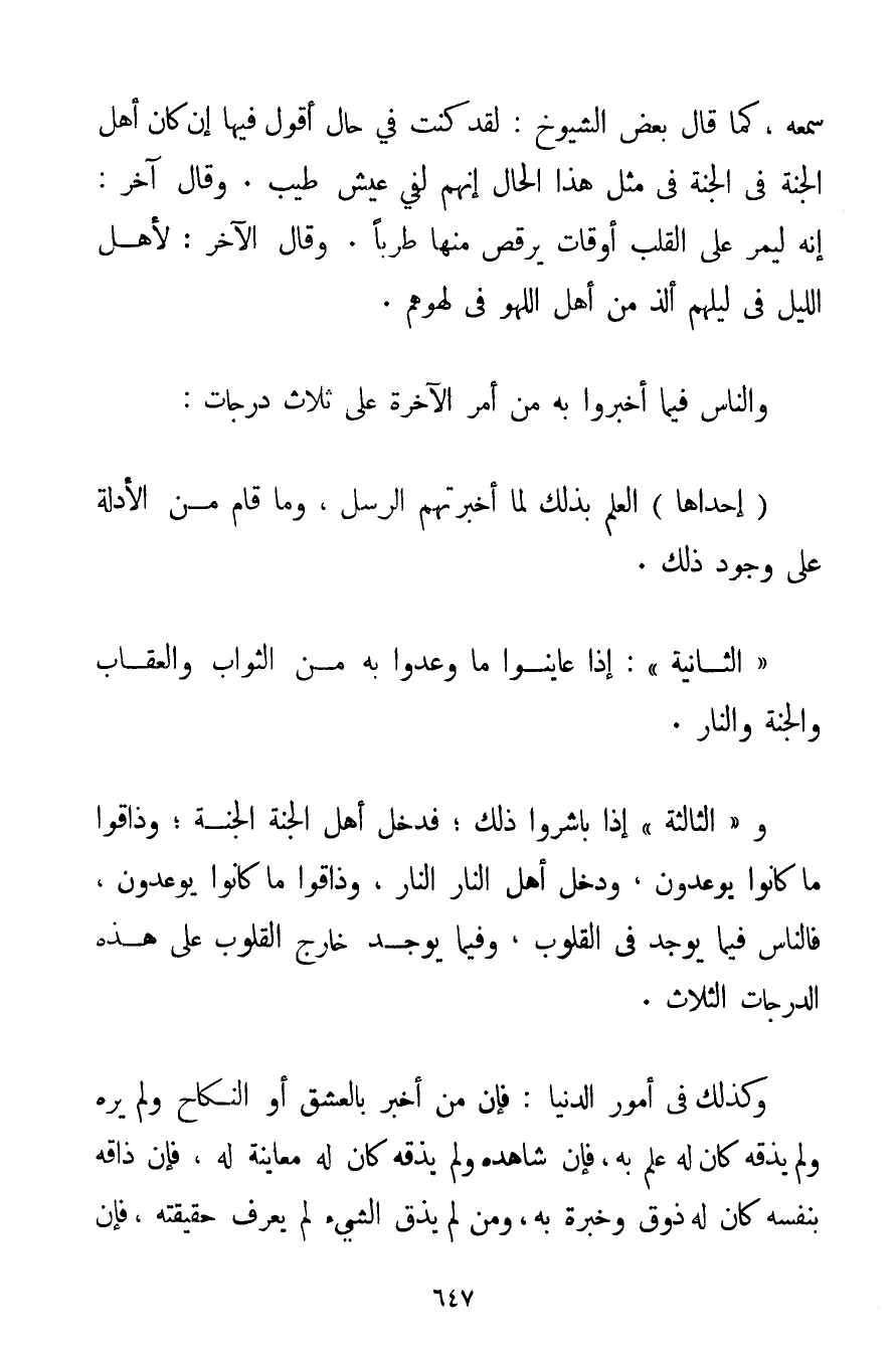 سَمِعَهُ كَمَا قَالَ بَعْضُ الشُّيُوخِ: لَقَدْ كُنْت فِي حَالٍ أَقُولُ فِيهَا إنْ كَانَ أَهْلُ الْجَنَّةِ فِي الْجَنَّةِ فِي مِثْلِ هَذَا الْحَالِ إنَّهُمْ لَفِي عَيْشٍ طَيِّبٍ. وَقَالَ آخَرُ: إنَّهُ لَيَمُرُّ عَلَى الْقَلْبِ أَوْقَاتٌ يَرْقُصُ مِنْهَا طَرَبًا. وَقَالَ الْآخَرُ: لَأَهْلُ اللَّيْلِ فِي لَيْلِهِمْ أَلَذُّ مِنْ أَهْلِ اللَّهْوِ فِي لَهْوِهِمْ. وَالنَّاسُ فِيمَا أُخْبِرُوا بِهِ مِنْ أَمْرِ الْآخِرَةِ عَلَى ثَلَاثِ دَرَجَاتٍ: