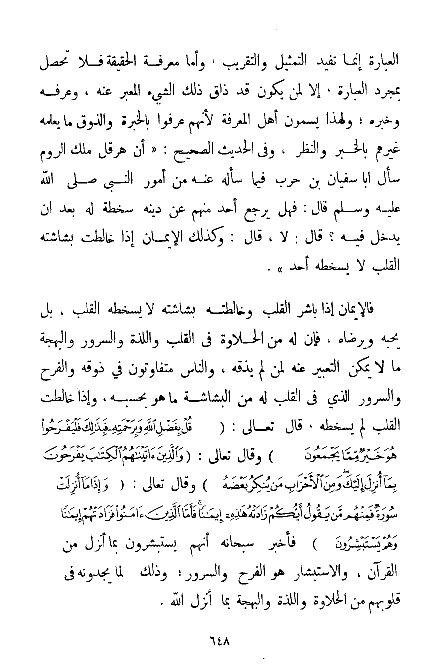 الْعِبَارَةَ إنَّمَا تُفِيدُ التَّمْثِيلَ وَالتَّقْرِيبَ وَأَمَّا مَعْرِفَةُ الْحَقِيقَةِ فَلَا تَحْصُلُ بِمُجَرَّدِ الْعِبَارَةِ إلَّا لِمَنْ يَكُونُ قَدْ ذَاقَ ذَلِكَ الشَّيْءَ الْمُعَبَّرَ عَنْهُ وَعَرَفَهُ وَخَبَرَهُ؛ وَلِهَذَا يُسَمُّونَ أَهْلَ الْمَعْرِفَةِ لِأَنَّهُمْ عُرِفُوا بِالْخِبْرَةِ وَالذَّوْقِ مَا يَعْلَمُهُ غَيْرُهُمْ بِالْخَبَرِ وَالنَّظَرِ وَفِي الْحَدِيثِ الصَّحِيحِ: {أَنَّ هِرَقْلَ مَلِكَ الرُّومِ سَأَلَ أَبَا سُفْيَانَ بْنَ حَرْبٍ فِيمَا سَأَلَهُ عَنْهُ مِنْ أُمُورِ النَّبِيِّ صَلَّى اللَّهُ عَلَيْهِ وَسَلَّمَ قَالَ: فَهَلْ يَرْجِعُ أَحَدٌ مِنْهُمْ عَنْ دِينِهِ سخطة لَهُ بَعْدَ أَنْ يَدْخُلَ فِيهِ؟ قَالَ: لَا قَالَ: وَكَذَلِكَ الْإِيمَانُ إذَا خَالَطَتْ بَشَاشَتُهُ الْقَلْبَ لَا يُسْخِطُهُ أَحَدٌ} . فَالْإِيمَانُ إذَا بَاشَرَ الْقَلْبَ وَخَالَطَتْهُ بَشَاشَتُهُ لَا يُسْخِطُهُ الْقَلْبُ بَلْ يُحِبُّهُ وَيَرْضَاهُ فَإِنَّ لَهُ مِنْ الْحَلَاوَةِ فِي الْقَلْبِ وَاللَّذَّةِ وَالسُّرُورِ وَالْبَهْجَةِ مَا لَا يُمْكِنُ التَّعْبِيرُ عَنْهُ لِمَنْ لَمْ يَذُقْهُ وَالنَّاسُ مُتَفَاوِتُونَ فِي ذَوْقِهِ وَالْفَرَحِ وَالسُّرُورِ الَّذِي فِي الْقَلْبِ لَهُ مِنْ الْبَشَاشَةِ مَا هُوَ بِحَسَبِهِ وَإِذَا خَالَطَتْ الْقَلْبَ لَمْ يُسْخِطْهُ قَالَ تَعَالَى: {قُلْ بِفَضْلِ اللَّهِ وَبِرَحْمَتِهِ فَبِذَلِكَ فَلْيَفْرَحُوا هُوَ خَيْرٌ مِمَّا يَجْمَعُونَ} وَقَالَ تَعَالَى: {وَالَّذِينَ آتَيْنَاهُمُ الْكِتَابَ يَفْرَحُونَ بِمَا أُنْزِلَ إلَيْكَ وَمِنَ الْأَحْزَابِ مَنْ يُنْكِرُ بَعْضَهُ} وَقَالَ تَعَالَى: {وَإِذَا مَا أُنْزِلَتْ سُورَةٌ فَمِنْهُمْ مَنْ يَقُولُ أَيُّكُمْ زَادَتْهُ هَذِهِ إيمَانًا فَأَمَّا الَّذِينَ آمَنُوا فَزَادَتْهُمْ إيمَانًا وَهُمْ يَسْتَبْشِرُونَ} فَأَخْبَرَ سُبْحَانَهُ أَنَّهُمْ يَسْتَبْشِرُونَ بِمَا أُنْزِلَ مِنْ الْقُرْآنِ وَالِاسْتِبْشَارُ هُوَ الْفَرَحُ وَالسُّرُورُ؛ وَذَلِكَ لِمَا يَجِدُونَهُ فِي قُلُوبِهِمْ مِنْ الْحَلَاوَةِ وَاللَّذَّةِ وَالْبَهْجَةِ بِمَا أَنْزَلَ اللَّهُ.