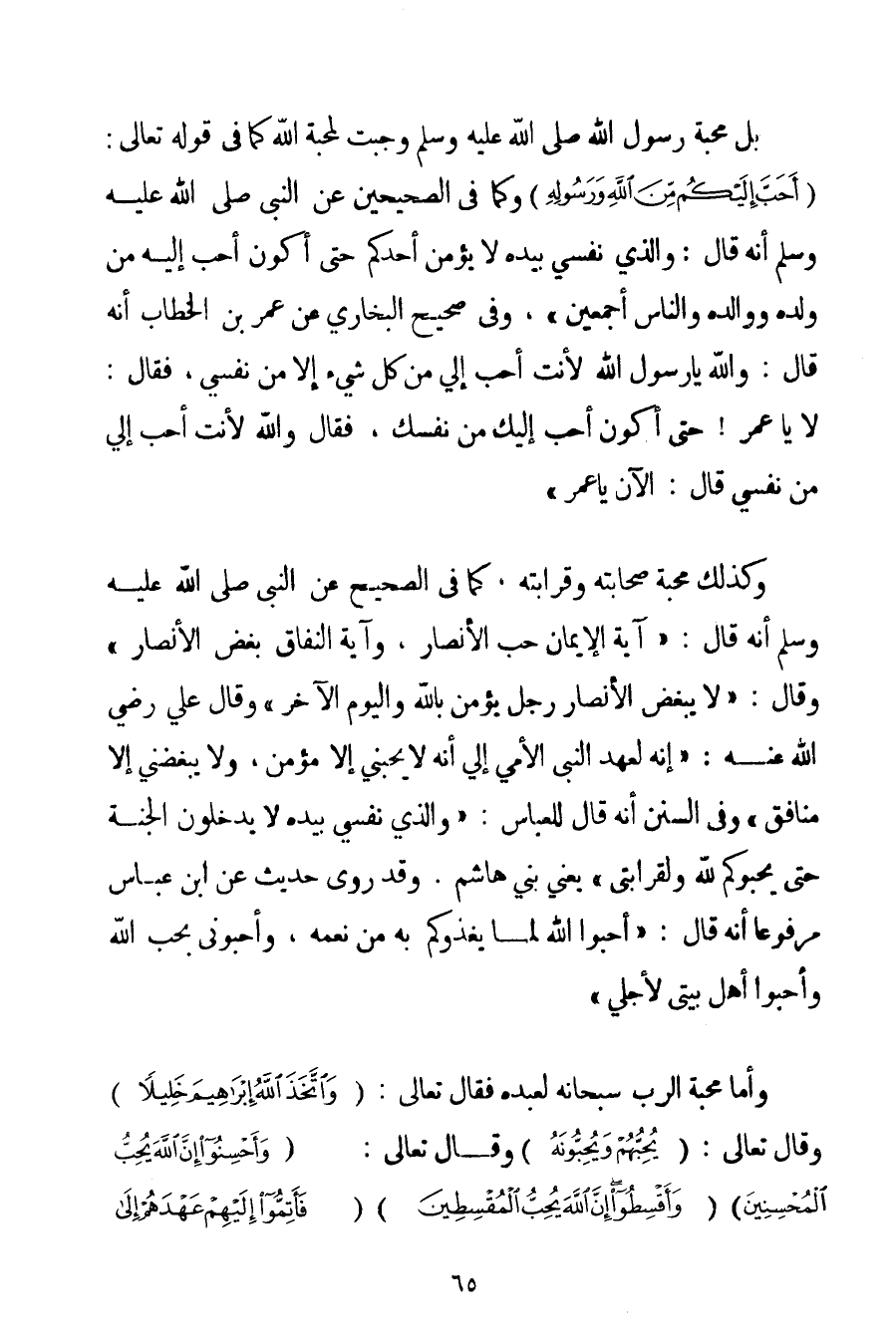 بَلْ مَحَبَّةُ رَسُولِ اللَّهِ صَلَّى اللَّهُ عَلَيْهِ وَسَلَّمَ وَجَبَتْ لِمَحَبَّةِ اللَّهِ كَمَا فِي قَوْله تَعَالَى {أَحَبَّ إلَيْكُمْ مِنَ اللَّهِ وَرَسُولِهِ} وَكَمَا فِي الصَّحِيحَيْنِ عَنْ النَّبِيِّ صَلَّى اللَّهُ عَلَيْهِ وَسَلَّمَ أَنَّهُ قَالَ: {وَاَلَّذِي نَفْسِي بِيَدِهِ لَا يُؤْمِنُ أَحَدُكُمْ حَتَّى أَكُونَ أَحَبَّ إلَيْهِ مِنْ وَلَدِهِ وَوَالِدِهِ وَالنَّاسِ أَجْمَعِينَ} وَفِي صَحِيحِ الْبُخَارِيِّ {عَنْ عُمَرَ بْنِ الْخَطَّابِ أَنَّهُ قَالَ: وَاَللَّهِ يَا رَسُولَ اللَّهِ لِأَنْتَ أَحَبُّ إلَيَّ مِنْ كُلِّ شَيْءٍ إلَّا مِنْ نَفْسِي فَقَالَ: لَا يَا عُمَرُ حَتَّى أَكُونَ أَحَبَّ إلَيْك مِنْ نَفْسِك فَقَالَ وَاَللَّهِ لِأَنْتَ أَحَبُّ إلَيَّ مِنْ نَفْسِي قَالَ: الْآنَ يَا عُمَرُ} وَكَذَلِكَ مَحَبَّةُ صَحَابَتِهِ وَقَرَابَتِهِ كَمَا فِي الصَّحِيحِ عَنْ {النَّبِيِّ صَلَّى اللَّهُ عَلَيْهِ وَسَلَّمَ أَنَّهُ قَالَ: آيَةُ الْإِيمَانِ حُبُّ الْأَنْصَارِ وَآيَةُ النِّفَاقِ بُغْضُ الْأَنْصَارِ} وَقَالَ: {لَا يُبْغِضُ الْأَنْصَارَ رَجُلٌ يُؤْمِنُ بِاَللَّهِ وَالْيَوْمِ الْآخِرِ} وَقَالَ عَلِيٌّ رَضِيَ اللَّهُ عَنْهُ " إنَّهُ لَعَهْدُ النَّبِيِّ الْأُمِّيِّ إلَيَّ أَنَّهُ لَا يُحِبُّنِي إلَّا مُؤْمِنٌ وَلَا يُبْغِضُنِي إلَّا مُنَافِقٌ " وَفِي السُّنَنِ أَنَّهُ {قَالَ لِلْعَبَّاسِ: وَاَلَّذِي نَفْسِي بِيَدِهِ لَا يَدْخُلُونَ الْجَنَّةَ حَتَّى يُحِبُّوكُمْ لِلَّهِ وَلِقَرَابَتِي} يَعْنِي بَنِي هَاشِمٍ. وَقَدْ رُوِيَ حَدِيثٌ عَنْ ابْنِ عَبَّاسٍ مَرْفُوعًا أَنَّهُ قَالَ: {أَحِبُّوا اللَّهَ لِمَا يَغْذُوكُمْ بِهِ مَنْ نِعَمِهِ وَأَحِبُّونِي بِحُبِّ اللَّهِ وَأَحِبُّوا أَهْلَ بَيْتِي لِأَجْلِي} وَأَمَّا مَحَبَّةُ الرَّبِّ سُبْحَانَهُ لِعَبْدِهِ فَقَالَ تَعَالَى: {وَاتَّخَذَ اللَّهُ إبْرَاهِيمَ خَلِيلًا} وَقَالَ تَعَالَى: {يُحِبُّهُمْ وَيُحِبُّونَهُ} وَقَالَ تَعَالَى: {وَأَحْسِنُوا إنَّ اللَّهَ يُحِبُّ الْمُحْسِنِينَ} {وَأَقْسِطُوا إنَّ اللَّهَ يُحِبُّ الْمُقْسِطِينَ} {فَأَتِمُّوا إلَيْهِمْ عَهْدَهُمْ إلَى