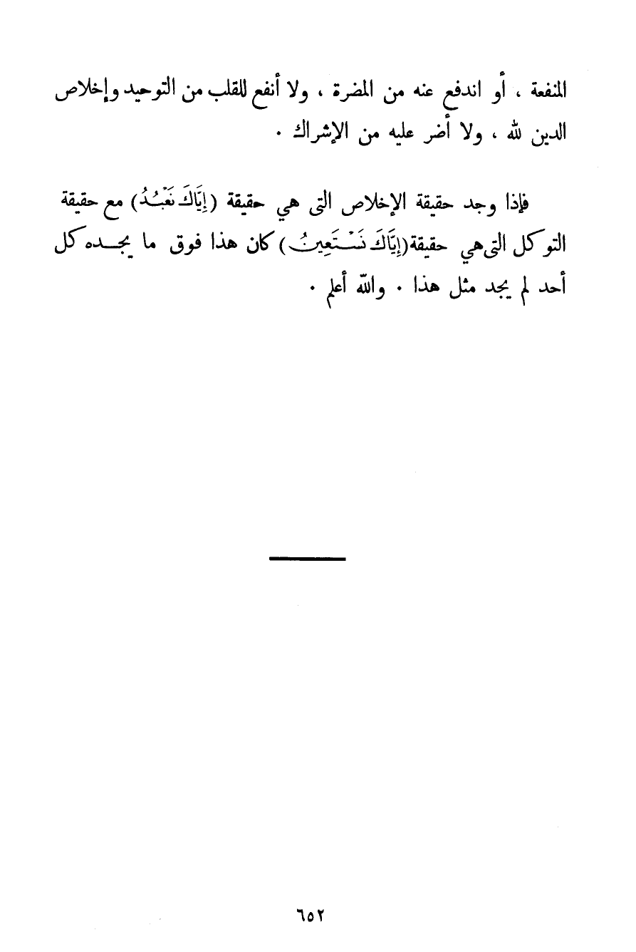 الْمَنْفَعَةِ أَوْ انْدَفَعَ عَنْهُ مِنْ الْمَضَرَّةِ وَلَا أَنْفَع لِلْقَلْبِ مِنْ التَّوْحِيدِ وَإِخْلَاصِ الدِّينِ لِلَّهِ وَلَا أَضَرَّ عَلَيْهِ مِنْ الْإِشْرَاكِ. فَإِذَا وَجَدَ حَقِيقَةَ الْإِخْلَاصِ الَّتِي هِيَ حَقِيقَةُ {إيَّاكَ نَعْبُدُ} مَعَ حَقِيقَةِ التَّوَكُّلِ الَّتِي هِيَ حَقِيقَةُ {وَإِيَّاكَ نَسْتَعِينُ} كَانَ هَذَا فَوْقَ مَا يَجِدُهُ كُلُّ أَحَدٍ لَمْ يَجِدْ مِثْلَ هَذَا. وَاَللَّهُ أَعْلَمُ.