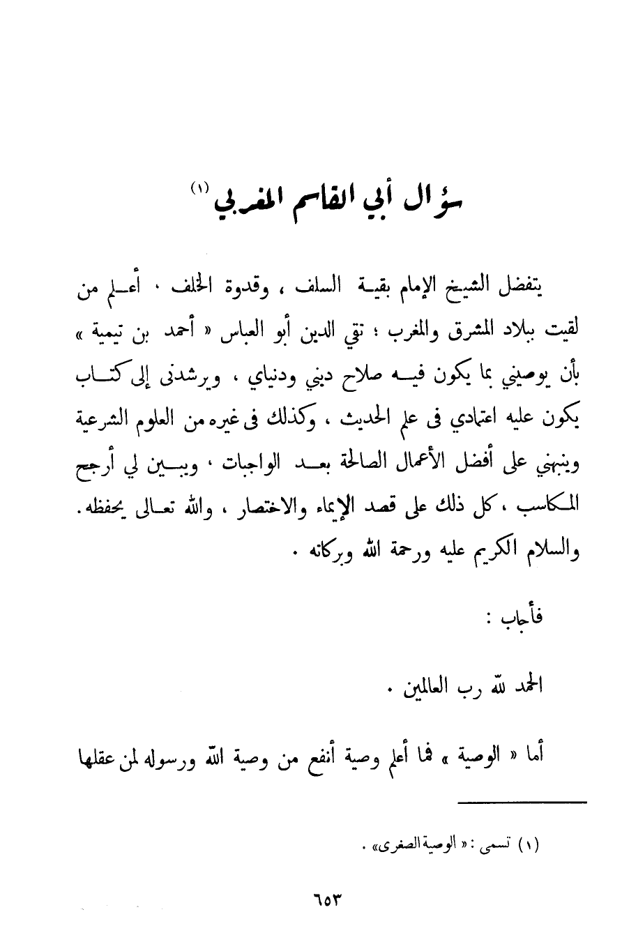 يَتَفَضَّلُ الشَّيْخُ الْإِمَامُ بَقِيَّةُ السَّلَفِ وَقُدْوَةُ الْخَلَفِ أَعْلَمُ مَنْ لَقِيت بِبِلَادِ الْمَشْرِقِ وَالْمَغْرِبِ؛ تَقِيُّ الدِّينِ أَبُو الْعَبَّاسِ أَحْمَد بْنُ تَيْمِيَّة " بِأَنْ يُوصِيَنِي بِمَا يَكُونُ فِيهِ صَلَاحُ دِينِي وَدُنْيَايَ؟ وَيُرْشِدُنِي إلَى كِتَابٍ يَكُونُ عَلَيْهِ اعْتِمَادِي فِي عِلْمِ الْحَدِيثِ وَكَذَلِكَ فِي غَيْرِهِ مِنْ الْعُلُومِ الشَّرْعِيَّةِ وَيُنَبِّهُنِي عَلَى أَفْضَلِ الْأَعْمَالِ الصَّالِحَةِ بَعْدَ الْوَاجِبَاتِ وَيُبَيِّنُ لِي أَرْجَحَ الْمَكَاسِبِ كُلُّ ذَلِكَ عَلَى قَصْدِ الْإِيمَاءِ وَالِاخْتِصَارِ وَاَللَّهُ تَعَالَى يَحْفَظُهُ. وَالسَّلَامُ الْكَرِيمُ عَلَيْهِ وَرَحْمَةُ اللَّهِ وَبَرَكَاتُهُ.