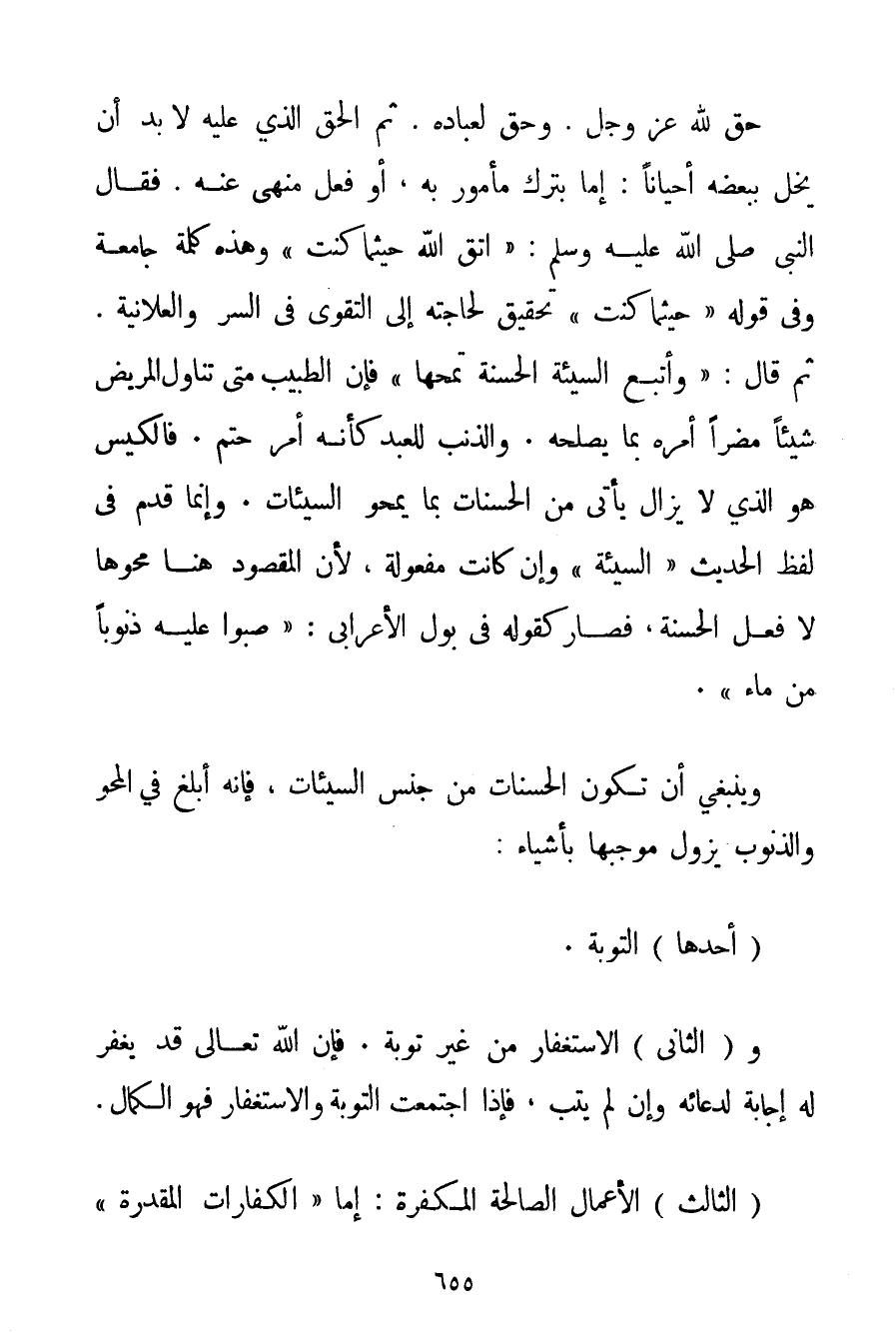 حَقٌّ لِلَّهِ عَزَّ وَجَلَّ. وَحَقٌّ لِعِبَادِهِ. ثُمَّ الْحَقُّ الَّذِي عَلَيْهِ لَا بُدَّ أَنْ يُخِلَّ بِبَعْضِهِ أَحْيَانًا: إمَّا بِتَرْكِ مَأْمُورٍ بِهِ أَوْ فِعْلِ مَنْهِيٍّ عَنْهُ. فَقَالَ النَّبِيُّ صَلَّى اللَّهُ عَلَيْهِ وَسَلَّمَ {اتَّقِ اللَّهَ حَيْثُمَا كُنْت} وَهَذِهِ كَلِمَةٌ جَامِعَةٌ وَفِي قَوْلِهِ " حَيْثُمَا كُنْت " تَحْقِيقٌ لِحَاجَتِهِ إلَى التَّقْوَى فِي السِّرِّ وَالْعَلَانِيَةِ. ثُمَّ قَالَ: {وَأَتْبِعْ السَّيِّئَةَ الْحَسَنَةَ تَمْحُهَا} فَإِنَّ الطَّبِيبَ متى تَنَاوَلَ الْمَرِيضُ شَيْئًا مُضِرًّا أَمَرَهُ بِمَا يُصْلِحُهُ. وَالذَّنْبُ لِلْعَبْدِ كَأَنَّهُ أَمْرٌ حَتْمٌ. فَالْكَيِّسُ هُوَ الَّذِي لَا يَزَالُ يَأْتِي مِنْ الْحَسَنَاتِ بِمَا يَمْحُو السَّيِّئَاتِ. وَإِنَّمَا قَدَّمَ فِي لَفْظِ الْحَدِيثِ " السَّيِّئَةَ " وَإِنْ كَانَتْ مَفْعُولَةً لِأَنَّ الْمَقْصُودَ هُنَا مَحْوُهَا لَا فِعْلُ الْحَسَنَةِ فَصَارَ {كَقَوْلِهِ فِي بَوْلِ الْأَعْرَابِيِّ: صُبُّوا عَلَيْهِ ذَنُوبًا مِنْ مَاءٍ} . وَيَنْبَغِي أَنْ تَكُونَ الْحَسَنَاتُ مِنْ جِنْسِ السَّيِّئَاتِ فَإِنَّهُ أَبْلَغُ فِي الْمَحْوِ وَالذُّنُوبُ يَزُولُ مُوجِبُهَا بِأَشْيَاءَ: (أَحَدُهَا) التَّوْبَةُ. وَ (الثَّانِي) الِاسْتِغْفَارُ مِنْ غَيْرِ تَوْبَةٍ. فَإِنَّ اللَّهَ تَعَالَى قَدْ يَغْفِرُ لَهُ إجَابَةً لِدُعَائِهِ وَإِنْ لَمْ يَتُبْ فَإِذَا اجْتَمَعَتْ التَّوْبَةُ وَالِاسْتِغْفَارُ فَهُوَ الْكَمَالُ. (الثَّالِثُ) الْأَعْمَالُ الصَّالِحَةُ الْمُكَفِّرَةُ: أَمَّا " الْكَفَّارَاتُ الْمُقَدَّرَةُ "
