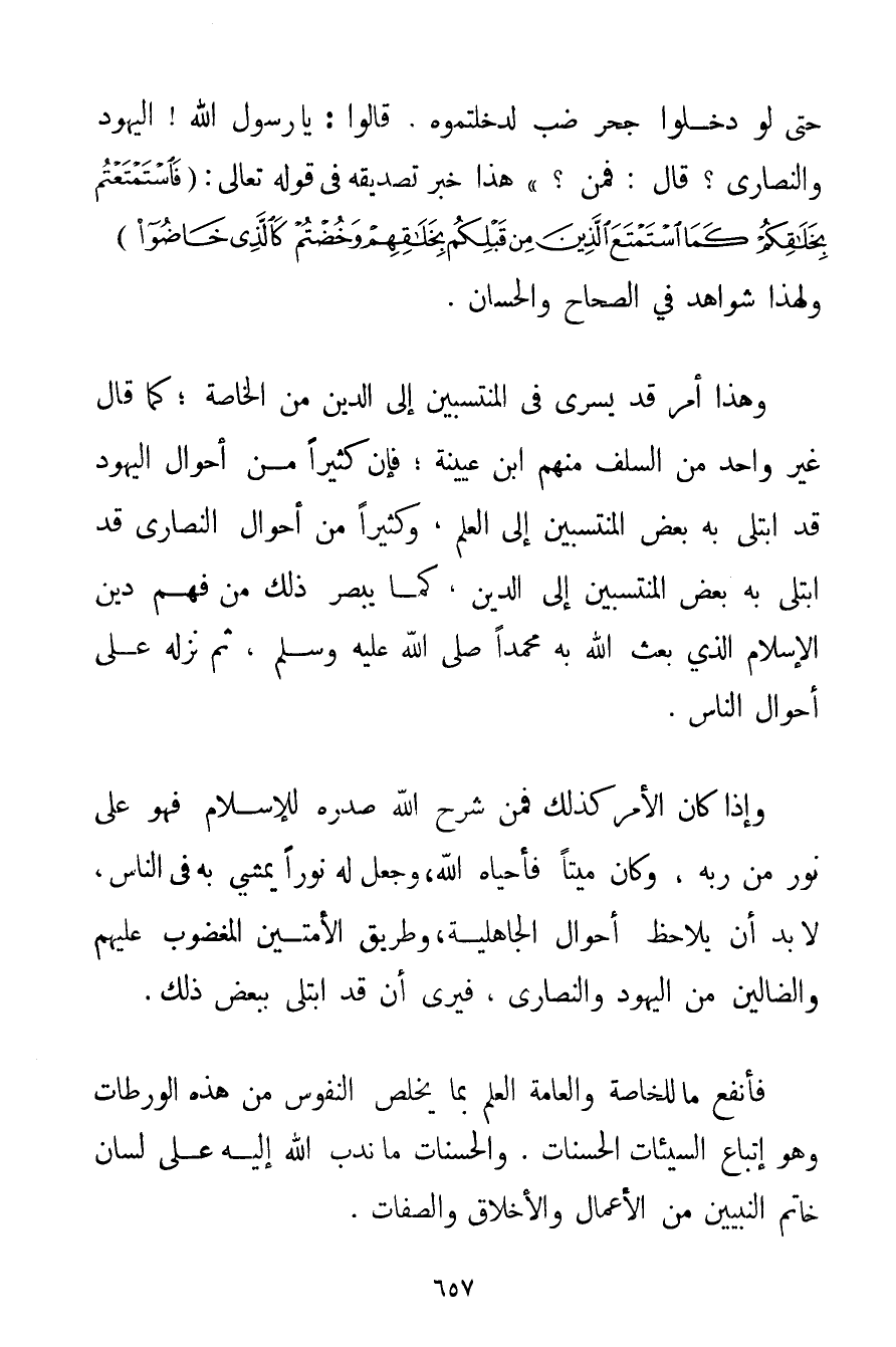 حَتَّى لَوْ دَخَلُوا جُحْرَ ضَبٍّ لَدَخَلْتُمُوهُ. قَالُوا: يَا رَسُولَ اللَّهِ الْيَهُودُ وَالنَّصَارَى؟ قَالَ: فَمَنْ؟} هَذَا خَبَرٌ تَصْدِيقُهُ فِي قَوْله تَعَالَى {فَاسْتَمْتَعْتُمْ بِخَلَاقِكُمْ كَمَا اسْتَمْتَعَ الَّذِينَ مِنْ قَبْلِكُمْ بِخَلَاقِهِمْ وَخُضْتُمْ كَالَّذِي خَاضُوا} وَلِهَذَا شَوَاهِدُ فِي الصِّحَاحِ وَالْحِسَانِ. وَهَذَا أَمْرٌ قَدْ يَسْرِي فِي الْمُنْتَسِبِينَ إلَى الدِّينِ مِنْ الْخَاصَّةِ؛ كَمَا قَالَ غَيْرُ وَاحِدٍ مِنْ السَّلَفِ مِنْهُمْ ابْنُ عُيَيْنَة؛ فَإِنَّ كَثِيرًا مِنْ أَحْوَالِ الْيَهُودِ قَدْ اُبْتُلِيَ بِهِ بَعْضُ الْمُنْتَسِبِينَ إلَى الْعِلْمِ وَكَثِيرًا مِنْ أَحْوَالِ النَّصَارَى قَدْ اُبْتُلِيَ بِهِ بَعْضُ الْمُنْتَسِبِينَ إلَى الدِّينِ كَمَا يُبْصِرُ ذَلِكَ مَنْ فَهِمَ دِينَ الْإِسْلَامِ الَّذِي بَعَثَ اللَّهُ بِهِ مُحَمَّدًا صَلَّى اللَّهُ عَلَيْهِ وَسَلَّمَ ثُمَّ نَزَّلَهُ عَلَى أَحْوَالِ النَّاسِ. وَإِذَا كَانَ الْأَمْرُ كَذَلِكَ فَمَنْ شَرَحَ اللَّهُ صَدْرَهُ لِلْإِسْلَامِ فَهُوَ عَلَى نُورٍ مِنْ رَبِّهِ وَكَانَ مَيِّتًا فَأَحْيَاهُ اللَّهُ وَجَعَلَ لَهُ نُورًا يَمْشِي بِهِ فِي النَّاسِ لَا بُدَّ أَنْ يُلَاحِظَ أَحْوَالَ الْجَاهِلِيَّةِ وَطَرِيقَ الْأُمَّتَيْنِ الْمَغْضُوبِ عَلَيْهِمْ وَالضَّالِّينَ مِنْ الْيَهُودِ وَالنَّصَارَى فَيَرَى أَنْ قَدْ اُبْتُلِيَ بِبَعْضِ ذَلِكَ. فَأَنْفَعُ مَا لِلْخَاصَّةِ وَالْعَامَّةِ الْعِلْمُ بِمَا يُخَلِّصُ النُّفُوسَ مِنْ هَذِهِ الْوَرَطَاتِ وَهُوَ إتْبَاعُ السَّيِّئَاتِ الْحَسَنَاتِ. وَالْحَسَنَاتُ مَا نَدَبَ اللَّهُ إلَيْهِ عَلَى لِسَانِ خَاتَمِ النَّبِيِّينَ مِنْ الْأَعْمَالِ وَالْأَخْلَاقِ وَالصِّفَاتِ.