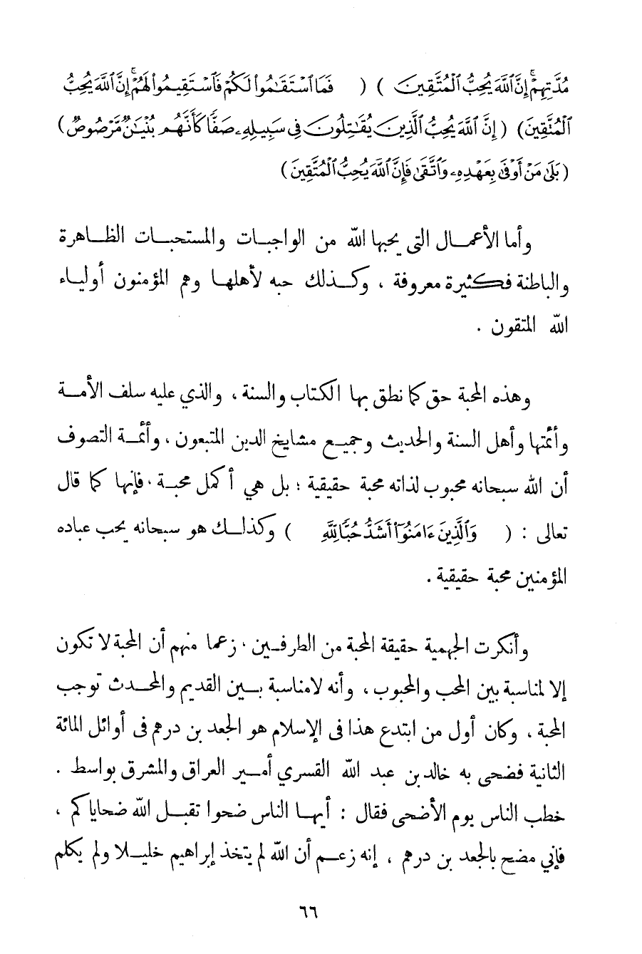 مُدَّتِهِمْ إنَّ اللَّهَ يُحِبُّ الْمُتَّقِينَ} {فَمَا اسْتَقَامُوا لَكُمْ فَاسْتَقِيمُوا لَهُمْ إنَّ اللَّهَ يُحِبُّ الْمُتَّقِينَ} {إنَّ اللَّهَ يُحِبُّ الَّذِينَ يُقَاتِلُونَ فِي سَبِيلِهِ صَفًّا كَأَنَّهُمْ بُنْيَانٌ مَرْصُوصٌ} {بَلَى مَنْ أَوْفَى بِعَهْدِهِ وَاتَّقَى فَإِنَّ اللَّهَ يُحِبُّ الْمُتَّقِينَ} وَأَمَّا الْأَعْمَالُ الَّتِي يُحِبُّهَا اللَّهُ مِنْ الْوَاجِبَاتِ وَالْمُسْتَحَبَّات الظَّاهِرَةِ وَالْبَاطِنَةِ فَكَثِيرَةٌ مَعْرُوفَةٌ وَكَذَلِكَ حُبُّهُ لِأَهْلِهَا وَهُمْ الْمُؤْمِنُونَ أَوْلِيَاءُ اللَّهِ الْمُتَّقُونَ. وَهَذِهِ الْمَحَبَّةُ حَقٌّ كَمَا نَطَقَ بِهَا الْكِتَابُ وَالسُّنَّةُ وَاَلَّذِي عَلَيْهِ سَلَفُ الْأُمَّةِ وَأَئِمَّتُهَا وَأَهْلُ السُّنَّةِ وَالْحَدِيثِ وَجَمِيعُ مَشَايِخِ الدِّينِ الْمُتَّبَعُونَ وَأَئِمَّةُ التَّصَوُّفِ أَنَّ اللَّهَ سُبْحَانَهُ مَحْبُوبٌ لِذَاتِهِ مَحَبَّةً حَقِيقِيَّةً؛ بَلْ هِيَ أَكْمَلُ مَحَبَّةٍ فَإِنَّهَا كَمَا قَالَ تَعَالَى: {وَالَّذِينَ آمَنُوا أَشَدُّ حُبًّا لِلَّهِ} وَكَذَلِكَ هُوَ سُبْحَانَهُ يُحِبُّ عِبَادَهُ الْمُؤْمِنِينَ مَحَبَّةً حَقِيقِيَّةً. وَأَنْكَرَتْ الْجَهْمِيَّة حَقِيقَةَ الْمَحَبَّةِ مِنْ الطَّرَفَيْنِ زَعْمًا مِنْهُمْ أَنَّ الْمَحَبَّةَ لَا تَكُونُ إلَّا لِمُنَاسَبَةِ بَيْنَ الْمُحِبِّ وَالْمَحْبُوبِ وَأَنَّهُ لَا مُنَاسَبَةَ بَيْنَ الْقَدِيمِ وَالْمُحْدَثِ تُوجِبُ الْمَحَبَّةَ وَكَانَ أَوَّلُ مَنْ ابْتَدَعَ هَذَا فِي الْإِسْلَامِ هُوَ الْجَعْدُ بْنُ دِرْهَمٍ فِي أَوَائِلِ الْمِائَةِ الثَّانِيَةِ فَضَحَّى بِهِ خَالِدُ بْنُ عَبْدِ اللَّهِ الْقَسْرِيُّ أَمِيرُ الْعِرَاقِ وَالْمَشْرِقِ بواسط. خَطَبَ النَّاسَ يَوْمَ الْأَضْحَى فَقَالَ: أَيُّهَا النَّاسُ ضَحُّوا تَقَبَّلْ اللَّهُ ضَحَايَاكُمْ فَإِنِّي مُضَحٍّ بِالْجَعْدِ بْنِ دِرْهَمٍ إنَّهُ زَعَمَ أَنَّ اللَّهَ لَمْ يَتَّخِذْ إبْرَاهِيمَ خَلِيلًا وَلَمْ يُكَلِّمْ