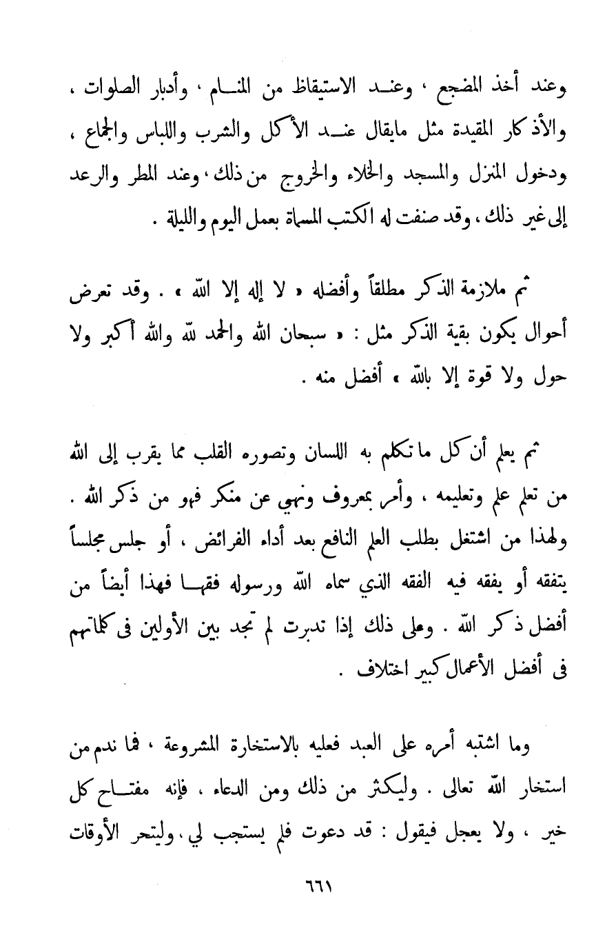 وَعِنْدَ أَخْذِ الْمَضْجَعِ وَعِنْدَ الِاسْتِيقَاظِ مِنْ الْمَنَامِ وَأَدْبَارِ الصَّلَوَاتِ وَالْأَذْكَارِ الْمُقَيَّدَةِ مِثْلُ مَا يُقَالُ عِنْدَ الْأَكْلِ وَالشُّرْبِ وَاللِّبَاسِ وَالْجِمَاعِ وَدُخُولِ الْمَنْزِلِ وَالْمَسْجِدِ وَالْخَلَاءِ وَالْخُرُوجِ مِنْ ذَلِكَ وَعِنْدَ الْمَطَرِ وَالرَّعْدِ إلَى غَيْرِ ذَلِكَ وَقَدْ صُنِّفَتْ لَهُ الْكُتُبُ الْمُسَمَّاةُ بِعَمَلِ الْيَوْمِ وَاللَّيْلَةِ. ثُمَّ مُلَازَمَةُ الذِّكْرِ مُطْلَقًا وَأَفْضَلُهُ " لَا إلَهَ إلَّا اللَّهُ ". وَقَدْ تَعْرِضُ أَحْوَالٌ يَكُونُ بَقِيَّةُ الذِّكْرِ مِثْلُ: " سُبْحَانَ اللَّهِ وَالْحَمْدُ لِلَّهِ وَاَللَّهُ أَكْبَرُ وَلَا حَوْلَ وَلَا قُوَّةَ إلَّا بِاَللَّهِ " أَفْضَلُ مِنْهُ. ثُمَّ يَعْلَمُ أَنَّ كُلَّ مَا تَكَلَّمَ بِهِ اللِّسَانُ وَتَصَوَّرَهُ الْقَلْبُ مِمَّا يُقَرِّبُ إلَى اللَّهِ مِنْ تَعَلُّمِ عِلْمٍ وَتَعْلِيمِهِ وَأَمْرٍ بِمَعْرُوفِ وَنَهْيٍ عَنْ مُنْكَرٍ فَهُوَ مِنْ ذِكْرِ اللَّهِ. وَلِهَذَا مَنْ اشْتَغَلَ بِطَلَبِ الْعِلْمِ النَّافِعِ بَعْدَ أَدَاءِ الْفَرَائِضِ أَوْ جَلَسَ مَجْلِسًا يَتَفَقَّهُ أَوْ يُفَقِّهُ فِيهِ الْفِقْهَ الَّذِي سَمَّاهُ اللَّهُ وَرَسُولُهُ فِقْهًا فَهَذَا أَيْضًا مِنْ أَفْضَلِ ذِكْرِ اللَّهِ. وَعَلَى ذَلِكَ إذَا تَدَبَّرْت لَمْ تَجِدْ بَيْنَ الْأَوَّلِينَ فِي كَلِمَاتِهِمْ فِي أَفْضَلِ الْأَعْمَالِ كَبِيرَ اخْتِلَافٍ. وَمَا اشْتَبَهَ أَمْرُهُ عَلَى الْعَبْدِ فَعَلَيْهِ بِالِاسْتِخَارَةِ الْمَشْرُوعَةِ فَمَا نَدِمَ مَنْ اسْتَخَارَ اللَّهَ تَعَالَى. وَلْيُكْثِرْ مِنْ ذَلِكَ وَمِنْ الدُّعَاءِ فَإِنَّهُ مِفْتَاحُ كُلِّ خَيْرٍ وَلَا يُعَجِّلُ فَيَقُولُ: قَدْ دَعَوْت فَلَمْ يُسْتَجَبْ لِي وَلْيَتَحَرَّ الْأَوْقَاتَ