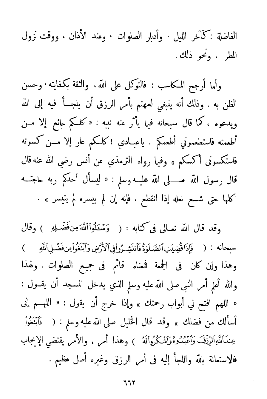 الْفَاضِلَةَ: كَآخِرِ اللَّيْلِ وَأَدْبَارِ الصَّلَوَاتِ وَعِنْدَ الْأَذَانِ وَوَقْتَ نُزُولِ الْمَطَرِ وَنَحْوَ ذَلِكَ. وَأَمَّا أَرْجَحُ الْمَكَاسِبِ: فَالتَّوَكُّلُ عَلَى اللَّهِ وَالثِّقَةُ بِكِفَايَتِهِ وَحُسْنُ الظَّنِّ بِهِ. وَذَلِكَ أَنَّهُ يَنْبَغِي لِلْمُهْتَمِّ بِأَمْرِ الرِّزْقِ أَنْ يَلْجَأَ فِيهِ إلَى اللَّهِ وَيَدْعُوَهُ كَمَا قَالَ سُبْحَانَهُ فِيمَا يَأْثُرُ عَنْهُ نَبِيُّهُ: {كُلُّكُمْ جَائِعٌ إلَّا مَنْ أَطْعَمْته فَاسْتَطْعِمُونِي أُطْعِمْكُمْ. يَا عِبَادِي كُلُّكُمْ عَارٍ إلَّا مَنْ كَسَوْته فَاسْتَكْسُونِي أَكْسُكُمْ} وَفِيمَا رَوَاهُ التِّرْمِذِيُّ عَنْ أَنَسٍ رَضِيَ اللَّهُ عَنْهُ قَالَ قَالَ رَسُولُ اللَّهِ صَلَّى اللَّهُ عَلَيْهِ وَسَلَّمَ {لِيَسْأَلْ أَحَدُكُمْ رَبَّهُ حَاجَتَهُ كُلَّهَا حَتَّى شِسْعَ نَعْلِهِ إذَا انْقَطَعَ فَإِنَّهُ إنْ لَمْ يُيَسِّرْهُ لَمْ يَتَيَسَّرْ} . وَقَدْ قَالَ اللَّهُ تَعَالَى فِي كِتَابِهِ: {وَاسْأَلُوا اللَّهَ مِنْ فَضْلِهِ} وَقَالَ سُبْحَانَهُ. {فَإِذَا قُضِيَتِ الصَّلَاةُ فَانْتَشِرُوا فِي الْأَرْضِ وَابْتَغُوا مِنْ فَضْلِ اللَّهِ} وَهَذَا وَإِنْ كَانَ فِي الْجُمْعَةِ فَمَعْنَاهُ قَائِمٌ فِي جَمِيعِ الصَّلَوَاتِ. وَلِهَذَا وَاَللَّهُ أَعْلَم {أَمَرَ النَّبِيُّ صَلَّى اللَّهُ عَلَيْهِ وَسَلَّمَ الَّذِي يَدْخُلُ الْمَسْجِدَ أَنْ يَقُولَ: اللَّهُمَّ افْتَحْ لِي أَبْوَابَ رَحْمَتِك وَإِذَا خَرَجَ أَنْ يَقُولَ: اللَّهُمَّ إنِّي أَسْأَلُك مِنْ فَضْلِك} وَقَدْ قَالَ الْخَلِيلُ صَلَّى اللَّهُ عَلَيْهِ وَسَلَّمَ (فَابْتَغُوا عِنْدَ اللَّهِ الرِّزْقَ وَاعْبُدُوهُ وَاشْكُرُوا لَهُ وَهَذَا أَمْرٌ وَالْأَمْرُ يَقْتَضِي الْإِيجَابَ فَالِاسْتِعَانَةُ بِاَللَّهِ وَاللَّجَأُ إلَيْهِ فِي أَمْرِ الرِّزْقِ وَغَيْرِهِ أَصْلٌ عَظِيمٌ.