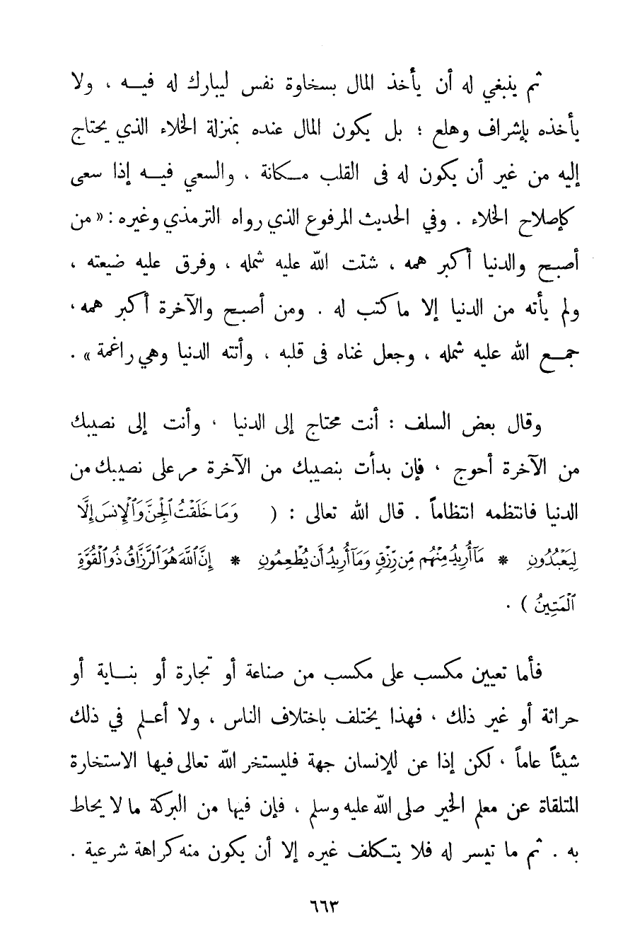 ثُمَّ يَنْبَغِي لَهُ أَنْ يَأْخُذَ الْمَالَ بِسَخَاوَةِ نَفْسٍ لِيُبَارَكَ لَهُ فِيهِ وَلَا يَأْخُذُهُ بِإِشْرَافِ وَهَلَعٍ؛ بَلْ يَكُونُ الْمَالُ عِنْدَهُ بِمَنْزِلَةِ الْخَلَاءِ الَّذِي يَحْتَاجُ إلَيْهِ مِنْ غَيْرِ أَنْ يَكُونَ لَهُ فِي الْقَلْبِ مَكَانَةٌ وَالسَّعْيُ فِيهِ إذَا سَعَى كَإِصْلَاحِ الْخَلَاءِ. وَفِي الْحَدِيثِ الْمَرْفُوعِ الَّذِي رَوَاهُ التِّرْمِذِيُّ وَغَيْرُهُ: {مَنْ أَصْبَحَ وَالدُّنْيَا أَكْبَرُ هَمِّهِ شَتَّتَ اللَّهُ عَلَيْهِ شَمْلَهُ وَفَرَّقَ عَلَيْهِ ضَيْعَتَهُ وَلَمْ يَأْتِهِ مِنْ الدُّنْيَا إلَّا مَا كُتِبَ لَهُ. وَمَنْ أَصْبَحَ وَالْآخِرَةُ أَكْبَرُ هَمِّهِ جَمَعَ اللَّهُ عَلَيْهِ شَمْلَهُ وَجَعَلَ غِنَاهُ فِي قَلْبِهِ؟ وَأَتَتْهُ الدُّنْيَا وَهِيَ رَاغِمَةٌ} . وَقَالَ بَعْضُ السَّلَفِ: أَنْتَ مُحْتَاجٌ إلَى الدُّنْيَا وَأَنْتَ إلَى نَصِيبِك مِنْ الْآخِرَةِ أَحْوَجُ فَإِنْ بَدَأْت بِنَصِيبِك مِنْ الْآخِرَةِ مَرَّ عَلَى نَصِيبِك مِنْ الدُّنْيَا فَانْتَظَمَهُ انْتِظَامًا. قَالَ اللَّهُ تَعَالَى: {وَمَا خَلَقْتُ الْجِنَّ وَالْإِنْسَ إلَّا لِيَعْبُدُونِ} {مَا أُرِيدُ مِنْهُمْ مِنْ رِزْقٍ وَمَا أُرِيدُ أَنْ يُطْعِمُونِ} {إنَّ اللَّهَ هُوَ الرَّزَّاقُ ذُو الْقُوَّةِ الْمَتِينُ} . فَأَمَّا تَعْيِينُ مَكْسَبٍ عَلَى مَكْسَبٍ مِنْ صِنَاعَةٍ أَوْ تِجَارَةٍ أَوْ بِنَايَةٍ أَوْ حِرَاثَةٍ أَوْ غَيْرِ ذَلِكَ فَهَذَا يَخْتَلِفُ بِاخْتِلَافِ النَّاسِ وَلَا أَعْلَم فِي ذَلِكَ شَيْئًا عَامًّا لَكِنْ إذَا عَنَّ لِلْإِنْسَانِ جِهَةٌ فَلْيَسْتَخِرْ اللَّهَ تَعَالَى فِيهَا الِاسْتِخَارَةَ الْمُتَلَقَّاةَ عَنْ مُعَلِّمِ الْخَيْرِ صَلَّى اللَّهُ عَلَيْهِ وَسَلَّمَ فَإِنَّ فِيهَا مِنْ الْبَرَكَةِ مَا لَا يُحَاطُ بِهِ. ثُمَّ مَا تَيَسَّرَ لَهُ فَلَا يَتَكَلَّفُ غَيْرَهُ إلَّا أَنْ يَكُونَ مِنْهُ كَرَاهَةٌ شَرْعِيَّةٌ.