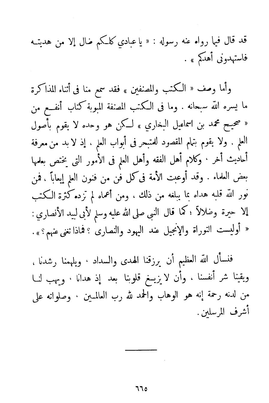 قَدْ قَالَ فِيمَا رَوَاهُ عَنْهُ رَسُولُهُ: {يَا عِبَادِي كُلُّكُمْ ضَالٌّ إلَّا مَنْ هَدَيْته فَاسْتَهْدُونِي أَهْدِكُمْ} . وَأَمَّا وَصْفُ " الْكُتُبِ وَالْمُصَنِّفِينَ " فَقَدْ سُمِعَ مِنَّا فِي أَثْنَاءِ الْمُذَاكَرَةِ مَا يَسَّرَهُ اللَّهُ سُبْحَانَهُ. وَمَا فِي الْكُتُبِ الْمُصَنَّفَةِ الْمُبَوَّبَةِ كِتَابٌ أَنْفَع مِنْ " صَحِيحِ مُحَمَّدِ بْنِ إسْمَاعِيلَ الْبُخَارِيِّ " لَكِنْ هُوَ وَحْدَهُ لَا يَقُومُ بِأُصُولِ الْعِلْمِ. وَلَا يَقُومُ بِتَمَامِ الْمَقْصُودِ لِلْمُتَبَحِّرِ فِي أَبْوَابِ الْعِلْمِ إذْ لَا بُدَّ مِنْ مَعْرِفَةِ أَحَادِيثَ أُخَرَ وَكَلَامُ أَهْلِ الْفِقْهِ وَأَهْلِ الْعِلْمِ فِي الْأُمُورِ الَّتِي يَخْتَصُّ بِعِلْمِهَا بَعْضُ الْعُلَمَاءِ. وَقَدْ أَوْعَبَتْ الْأُمَّةُ فِي كُلِّ فَنٍّ مِنْ فُنُونِ الْعِلْمِ إيعَابًا فَمَنْ نَوَّرَ اللَّهُ قَلْبَهُ هَدَاهُ بِمَا يَبْلُغُهُ مِنْ ذَلِكَ وَمَنْ أَعْمَاهُ لَمْ تَزِدْهُ كَثْرَةُ الْكُتُبِ إلَّا حَيْرَةً وَضَلَالًا؛ كَمَا {قَالَ النَّبِيُّ صَلَّى اللَّهُ عَلَيْهِ وَسَلَّمَ لِأَبِي لَبِيدٍ الْأَنْصَارِيِّ: أَوَلَيْسَتْ التَّوْرَاةُ وَالْإِنْجِيلُ عِنْدَ الْيَهُودِ وَالنَّصَارَى؟ فَمَاذَا تُغْنِي عَنْهُمْ؟} . فَنَسْأَلُ اللَّهَ الْعَظِيمَ أَنْ يَرْزُقَنَا الْهُدَى وَالسَّدَادَ وَيُلْهِمَنَا رُشْدَنَا وَيَقِيَنَا شَرَّ أَنْفُسِنَا وَأَنْ لَا يُزِيغَ قُلُوبَنَا بَعْدَ إذْ هَدَانَا؟ وَيَهَبَ لَنَا مِنْ لَدُنْهُ رَحْمَةً إنَّهُ هُوَ الْوَهَّابُ وَالْحَمْدُ لِلَّهِ رَبِّ الْعَالَمِينَ. وَصَلَوَاتُهُ عَلَى أَشْرَفِ الْمُرْسَلِينَ.