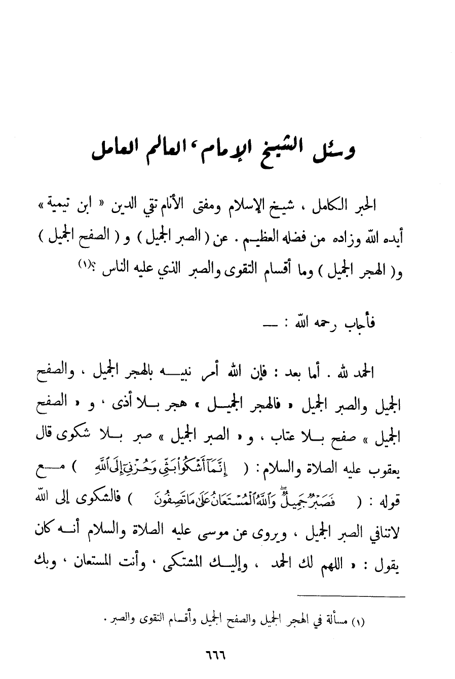 الْحَمْدُ لِلَّهِ، أَمَّا بَعْدُ: فَإِنَّ اللَّهَ أَمَرَ نَبِيَّهُ بِالْهَجْرِ الْجَمِيلِ وَالصَّفْحِ الْجَمِيلِ وَالصَّبْرِ الْجَمِيلِ (*)