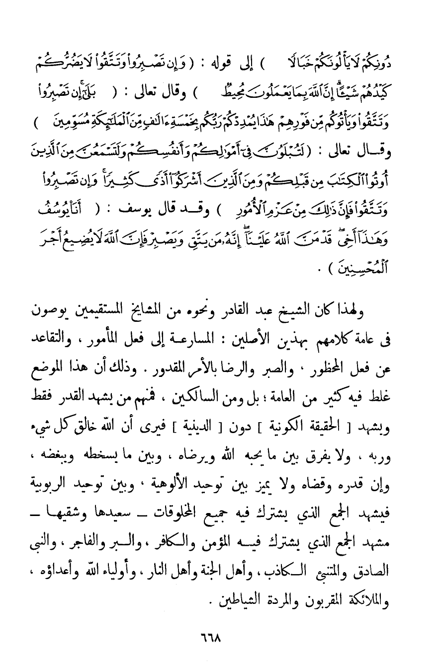 دُونِكُمْ لَا يَأْلُونَكُمْ خَبَالًا} إلَى قَوْلِهِ: {وَإِنْ تَصْبِرُوا وَتَتَّقُوا لَا يَضُرُّكُمْ كَيْدُهُمْ شَيْئًا إنَّ اللَّهَ بِمَا يَعْمَلُونَ مُحِيطٌ} وَقَالَ تَعَالَى: {بَلَى إنْ تَصْبِرُوا وَتَتَّقُوا وَيَأْتُوكُمْ مِنْ فَوْرِهِمْ هَذَا يُمْدِدْكُمْ رَبُّكُمْ بِخَمْسَةِ آلَافٍ مِنَ الْمَلَائِكَةِ مُسَوِّمِينَ} وَقَالَ تَعَالَى: {لَتُبْلَوُنَّ فِي أَمْوَالِكُمْ وَأَنْفُسِكُمْ وَلَتَسْمَعُنَّ مِنَ الَّذِينَ أُوتُوا الْكِتَابَ مِنْ قَبْلِكُمْ وَمِنَ الَّذِينَ أَشْرَكُوا أَذًى كَثِيرًا وَإِنْ تَصْبِرُوا وَتَتَّقُوا فَإِنَّ ذَلِكَ مِنْ عَزْمِ الْأُمُورِ} وَقَدْ قَالَ يُوسُفُ: {أَنَا يُوسُفُ وَهَذَا أَخِي قَدْ مَنَّ اللَّهُ عَلَيْنَا إنَّهُ مَنْ يَتَّقِ وَيَصْبِرْ فَإِنَّ اللَّهَ لَا يُضِيعُ أَجْرَ الْمُحْسِنِينَ} . وَلِهَذَا كَانَ الشَّيْخُ عَبْدُ الْقَادِرِ وَنَحْوُهُ مِنْ الْمَشَايِخِ الْمُسْتَقِيمِينَ يُوصُونَ فِي عَامَّةِ كَلَامِهِمْ بِهَذَيْنِ الْأَصْلَيْنِ: الْمُسَارَعَةُ إلَى فِعْلِ الْمَأْمُورِ وَالتَّقَاعُدِ عَنْ فِعْلِ الْمَحْظُورِ وَالصَّبْرُ وَالرِّضَا بِالْأَمْرِ الْمَقْدُورِ. وَذَلِكَ أَنَّ هَذَا الْمَوْضِعَ غَلِطَ فِيهِ كَثِيرٌ مِنْ الْعَامَّةِ؛ بَلْ وَمِنْ السَّالِكِينَ فَمِنْهُمْ مَنْ يَشْهَدُ الْقَدَرَ فَقَطْ وَيَشْهَدُ الْحَقِيقَةَ الْكَوْنِيَّةَ دُونَ الدِّينِيَّةِ فَيَرَى أَنَّ اللَّهَ خَالِقُ كُلِّ شَيْءٍ وَرَبُّهُ وَلَا يُفَرِّقُ بَيْنَ مَا يُحِبُّهُ اللَّهُ وَيَرْضَاهُ وَبَيْنَ مَا يُسْخِطُهُ وَيُبْغِضُهُ وَإِنْ قَدَّرَهُ وَقَضَاهُ وَلَا يُمَيِّزُ بَيْنَ تَوْحِيدِ الْأُلُوهِيَّةِ وَبَيْنَ تَوْحِيدِ الرُّبُوبِيَّةِ فَيَشْهَدُ الْجَمْعَ الَّذِي يَشْتَرِكُ فِيهِ جَمِيعُ الْمَخْلُوقَاتِ - سَعِيدُهَا وَشَقِيُّهَا - مَشْهَدَ الْجَمْعِ الَّذِي يَشْتَرِكُ فِيهِ الْمُؤْمِنُ وَالْكَافِرُ وَالْبَرُّ وَالْفَاجِرُ وَالنَّبِيُّ الصَّادِقُ وَالْمُتَنَبِّئُ الْكَاذِبُ وَأَهْلُ الْجَنَّةِ وَأَهْلُ النَّارِ وَأَوْلِيَاءُ اللَّهِ وَأَعْدَاؤُهُ وَالْمَلَائِكَةُ الْمُقَرَّبُونَ وَالْمَرَدَةُ الشَّيَاطِينُ.
